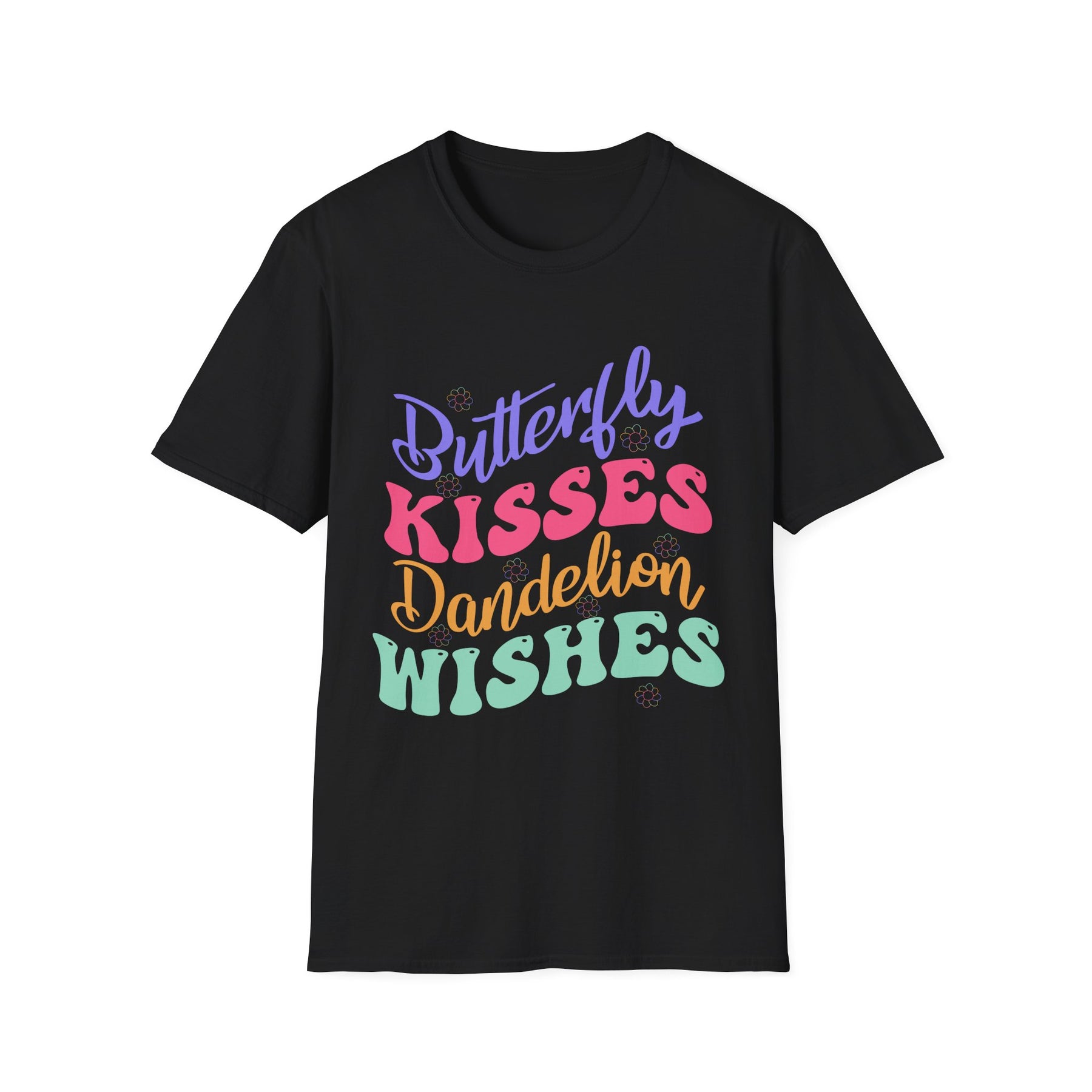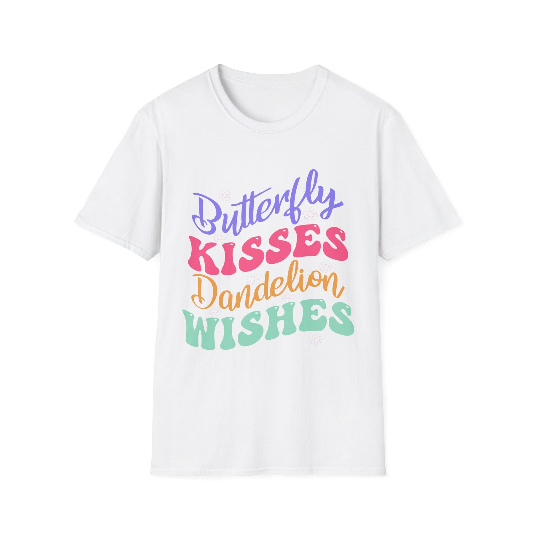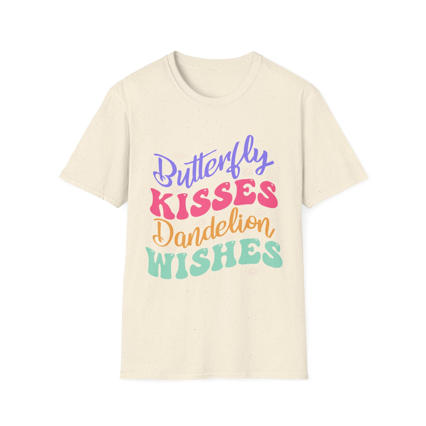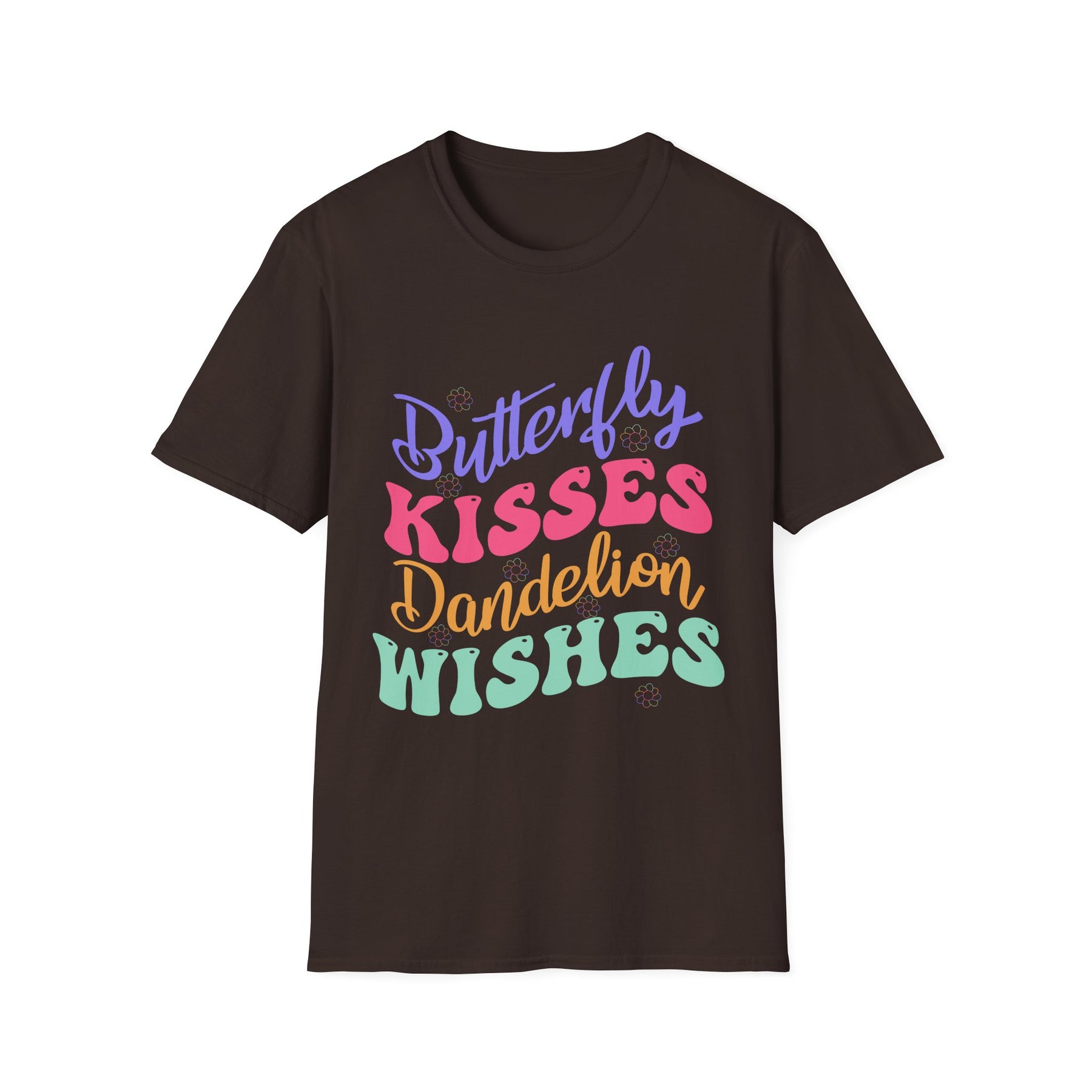 Light, soft, and cheerful — this tee carries a gentle, nostalgic voice. The pastel hand-lettered design reads “Butterfly Kisses, Dandelion Wishes,” evoking warm afternoons chasing blooms and blowing seeds into the summer breeze. The lightweight ring-spun cotton feels air-light on the skin, while the classic crew neck and clean, tubular knit keep the silhouette simple and effortless. Wear it on slow weekend mornings, at casual meetups, or layered under a cardigan when the evening cools down. The tear-away label and reinforced shoulder tape mean it stays comfortable through many washes, and the vivid DTF/DTG print keeps the artwork bright and soft to the touch. Subtle details — like natural flecks in the unprocessed colorways and ethically sourced cotton — add honest texture and quiet character to each shirt.