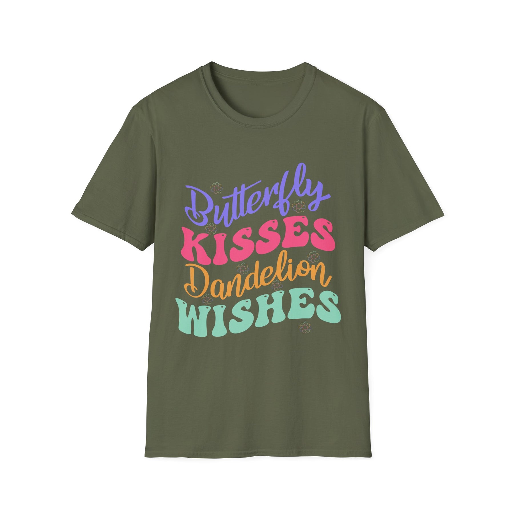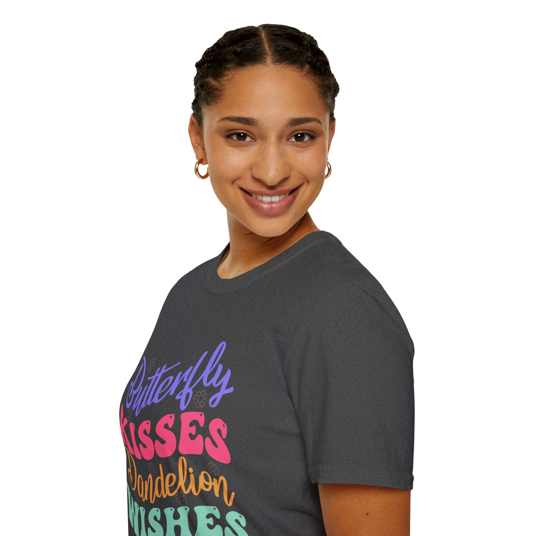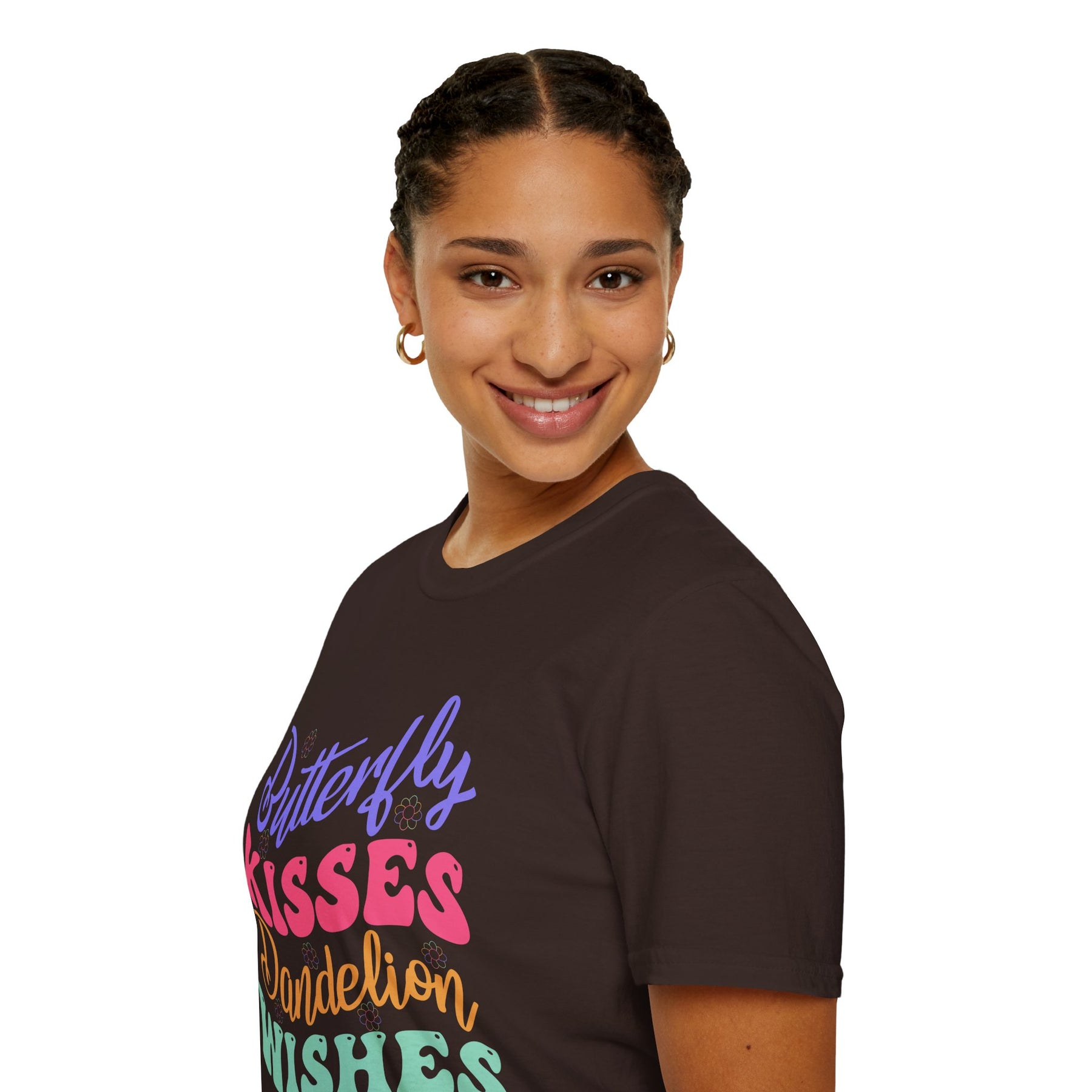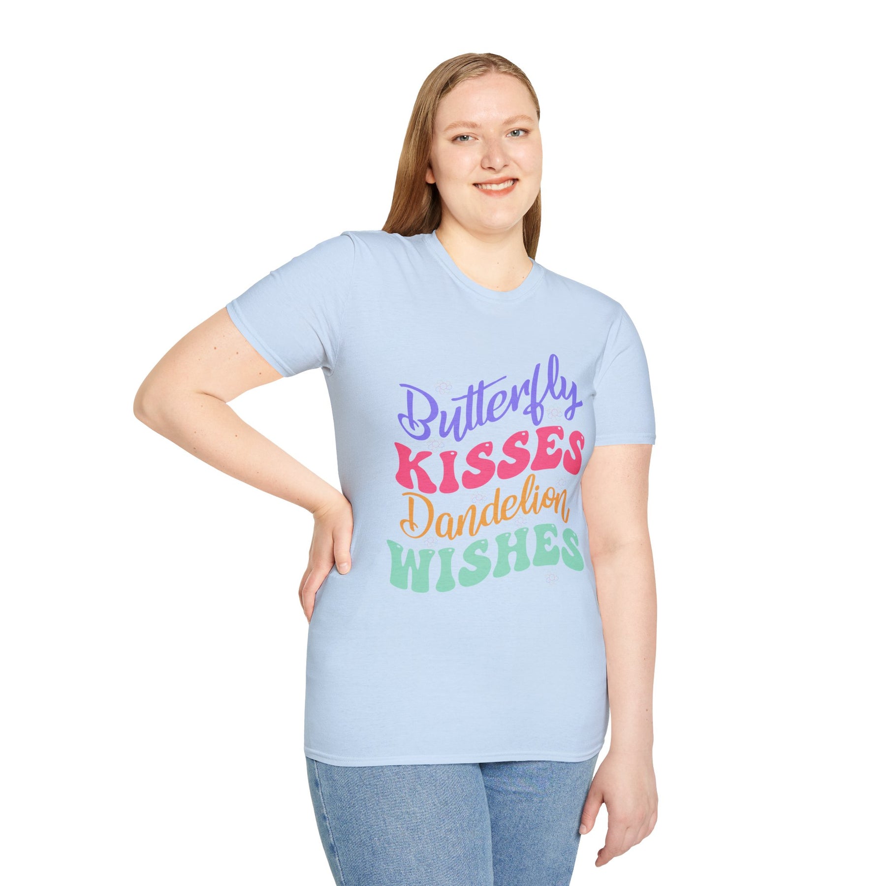 Light, soft, and cheerful — this tee carries a gentle, nostalgic voice. The pastel hand-lettered design reads “Butterfly Kisses, Dandelion Wishes,” evoking warm afternoons chasing blooms and blowing seeds into the summer breeze. The lightweight ring-spun cotton feels air-light on the skin, while the classic crew neck and clean, tubular knit keep the silhouette simple and effortless. Wear it on slow weekend mornings, at casual meetups, or layered under a cardigan when the evening cools down. The tear-away label and reinforced shoulder tape mean it stays comfortable through many washes, and the vivid DTF/DTG print keeps the artwork bright and soft to the touch. Subtle details — like natural flecks in the unprocessed colorways and ethically sourced cotton — add honest texture and quiet character to each shirt.