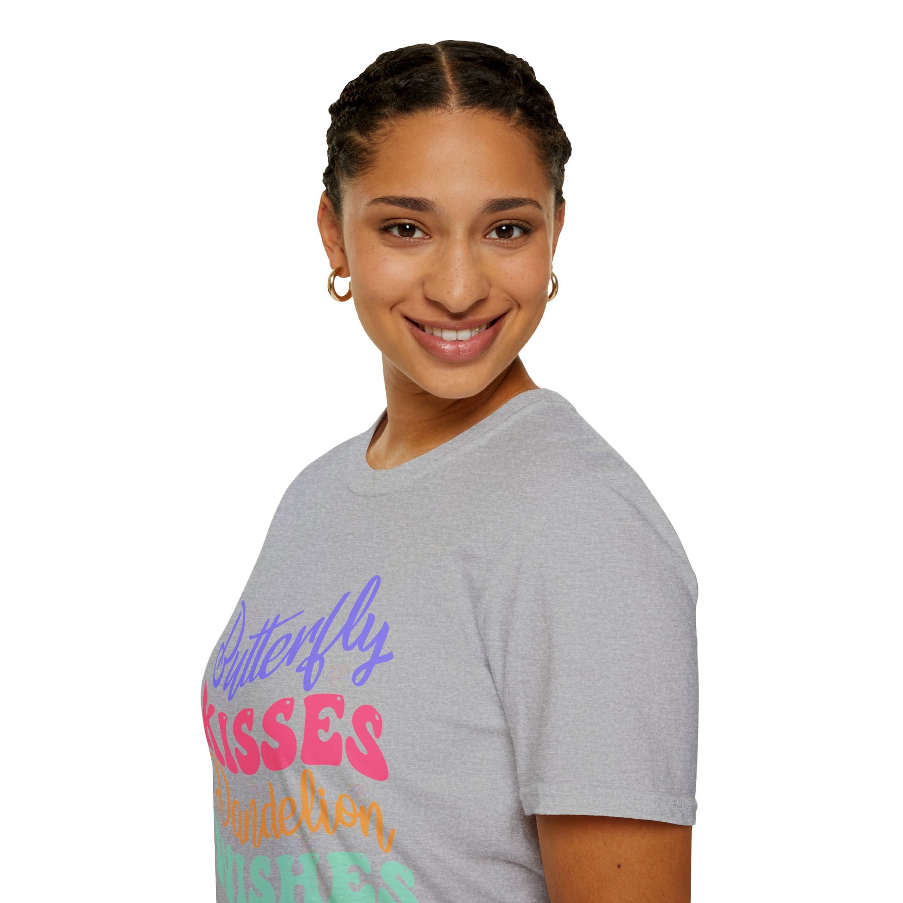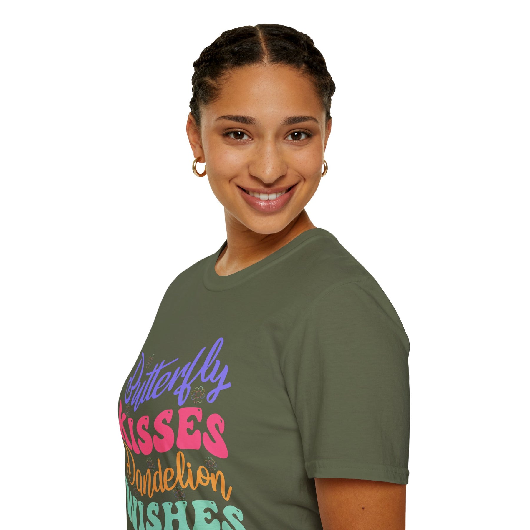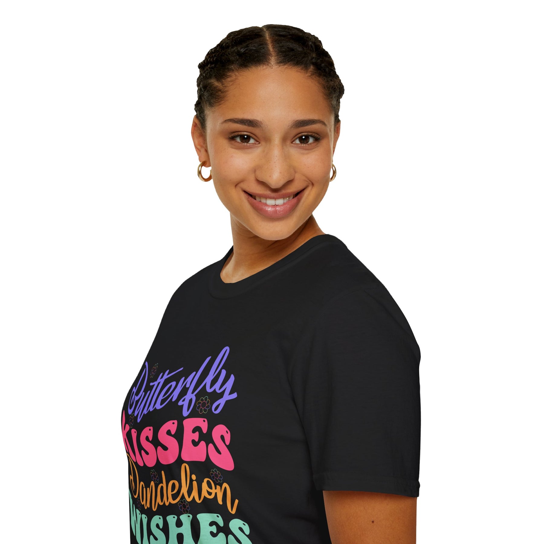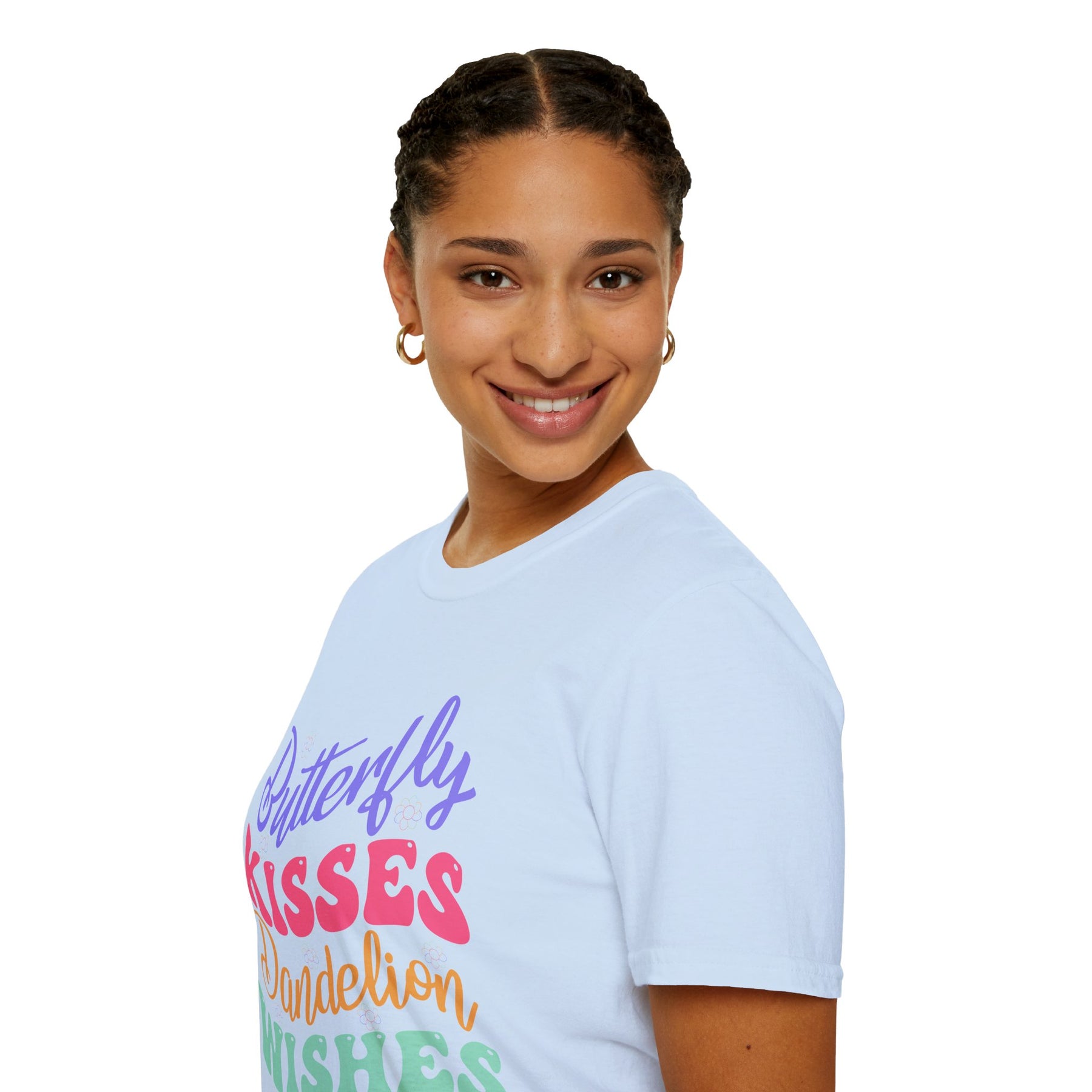 Light, soft, and cheerful — this tee carries a gentle, nostalgic voice. The pastel hand-lettered design reads “Butterfly Kisses, Dandelion Wishes,” evoking warm afternoons chasing blooms and blowing seeds into the summer breeze. The lightweight ring-spun cotton feels air-light on the skin, while the classic crew neck and clean, tubular knit keep the silhouette simple and effortless. Wear it on slow weekend mornings, at casual meetups, or layered under a cardigan when the evening cools down. The tear-away label and reinforced shoulder tape mean it stays comfortable through many washes, and the vivid DTF/DTG print keeps the artwork bright and soft to the touch. Subtle details — like natural flecks in the unprocessed colorways and ethically sourced cotton — add honest texture and quiet character to each shirt.