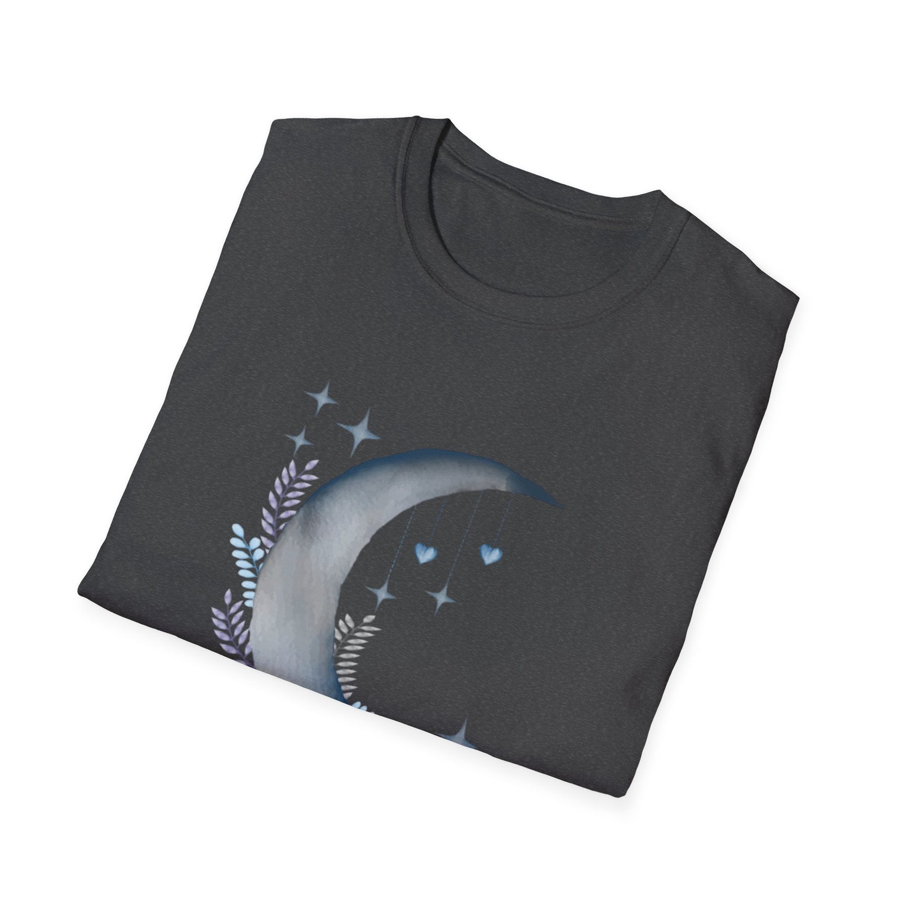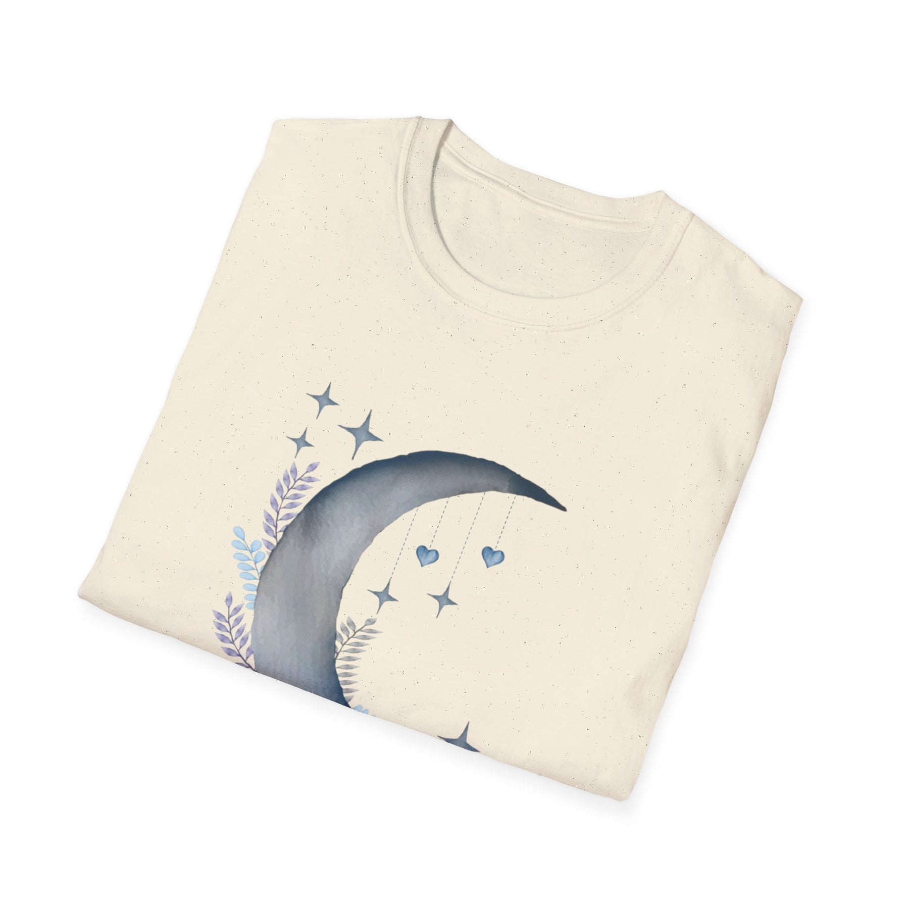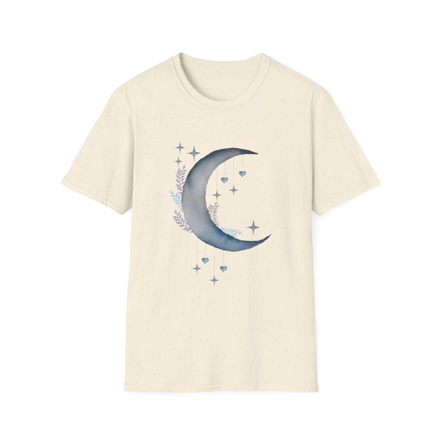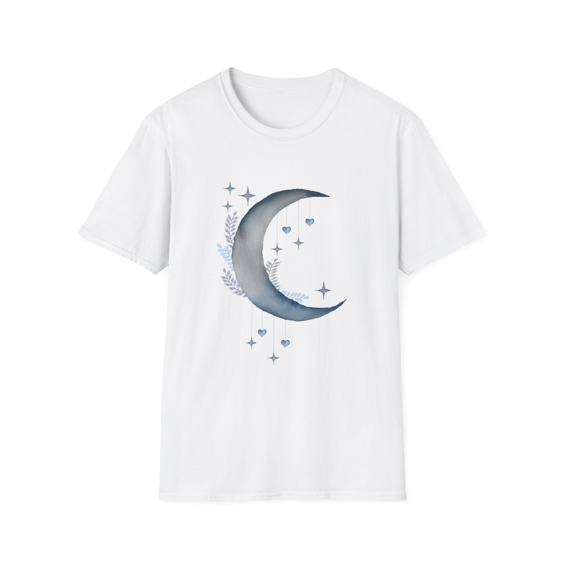 A lightweight cotton tee that feels like a quiet evening under the stars. Soft, slightly slubbed fabric carries a hand-painted crescent moon and scattered stars in muted indigo and silver tones. Wear it tucked into high-waist jeans or layered under an open cardigan for slow walks, tea at dusk, or cozy nights reading by a lamp. The relaxed crew neck and classic fit let the art breathe on the front while keeping the silhouette simple and easy to move in. A subtle, calm piece for those who collect small moments and quiet rituals.