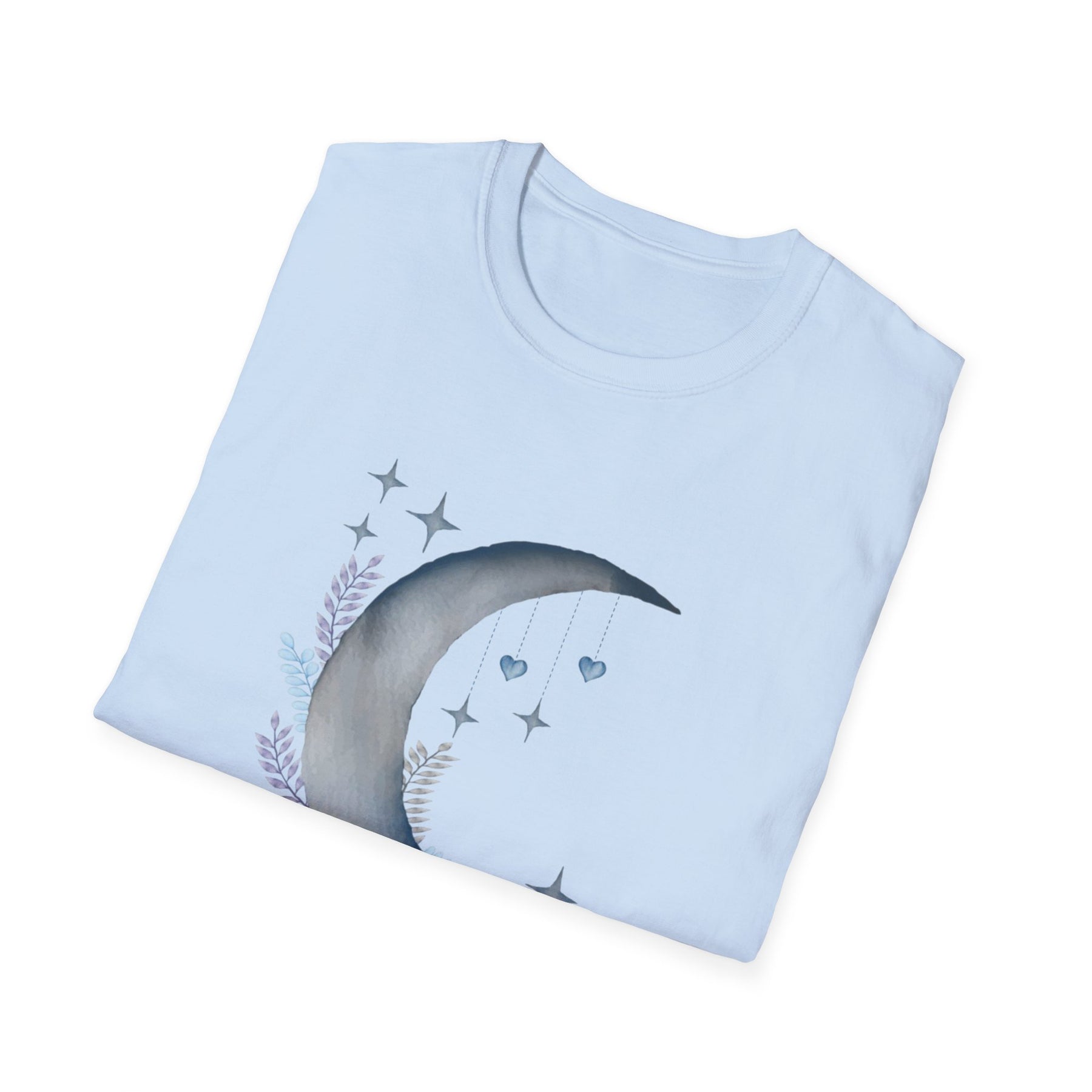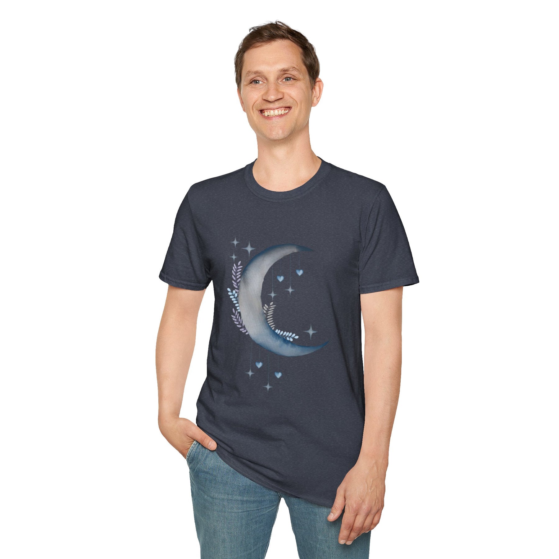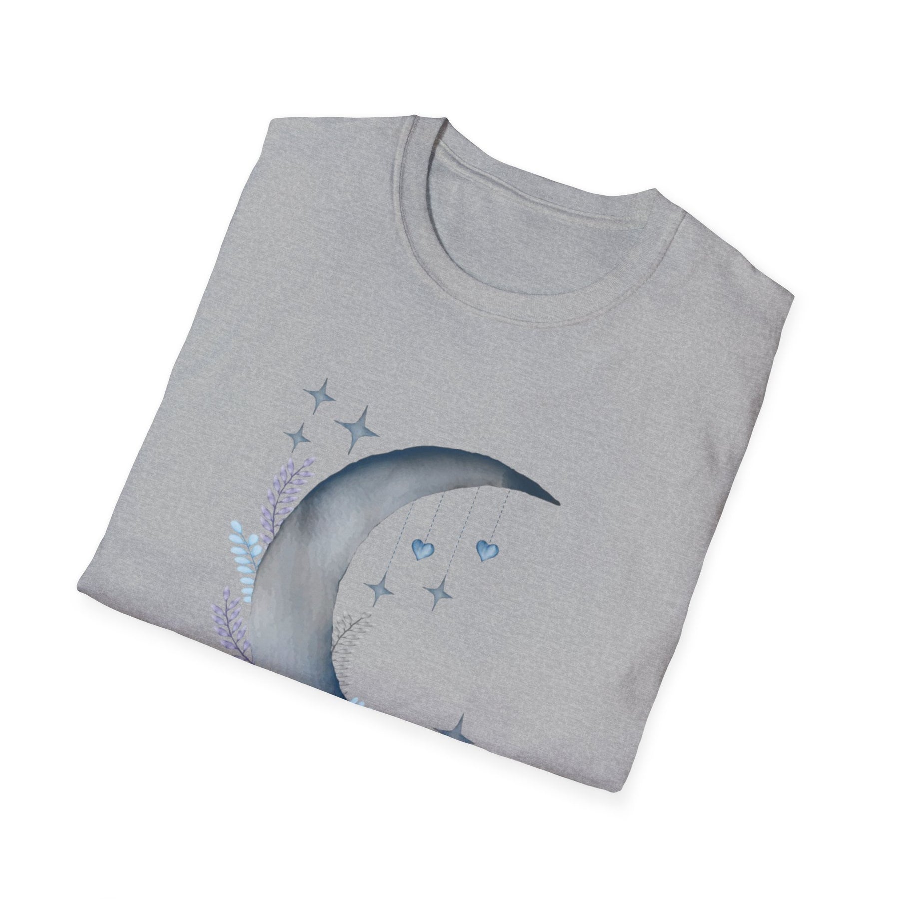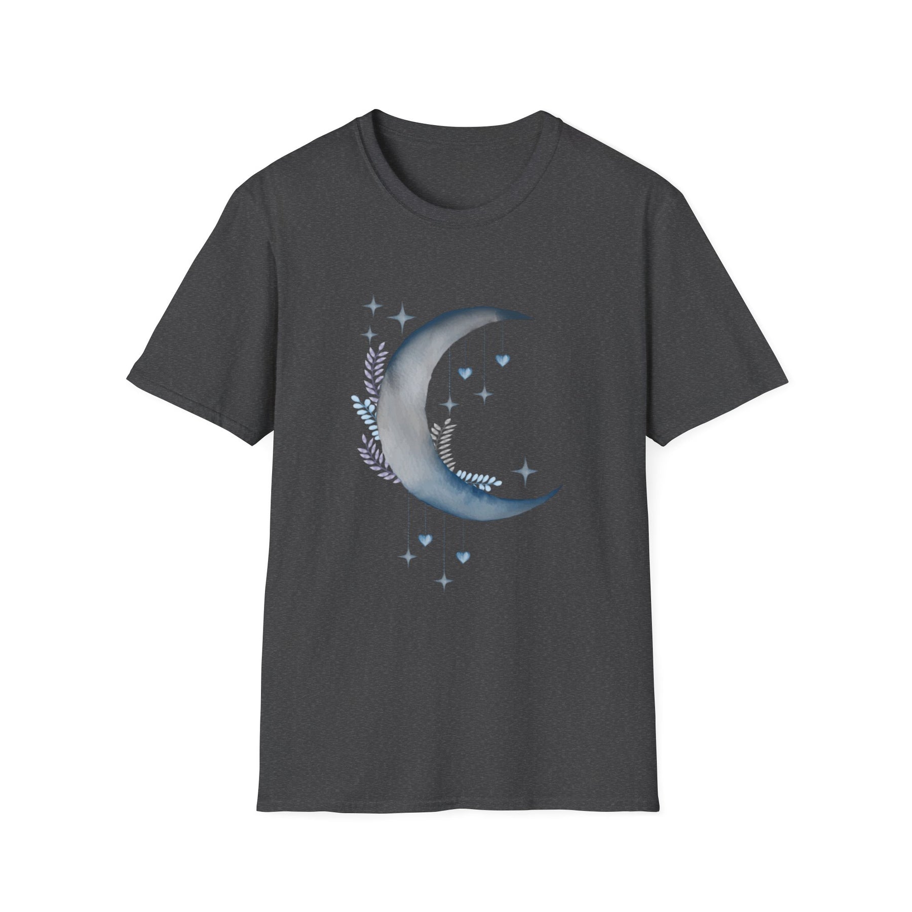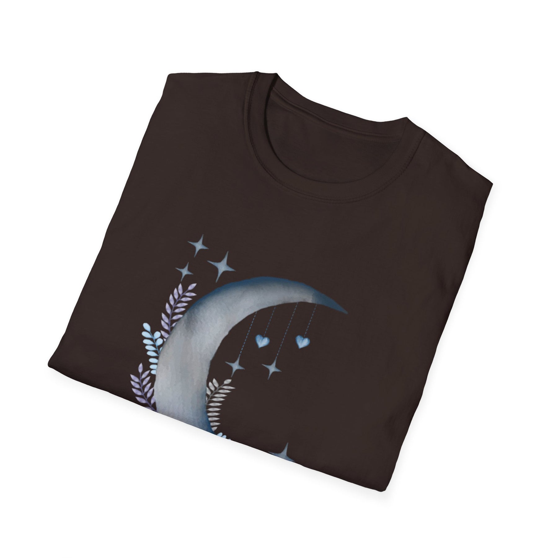 A lightweight cotton tee that feels like a quiet evening under the stars. Soft, slightly slubbed fabric carries a hand-painted crescent moon and scattered stars in muted indigo and silver tones. Wear it tucked into high-waist jeans or layered under an open cardigan for slow walks, tea at dusk, or cozy nights reading by a lamp. The relaxed crew neck and classic fit let the art breathe on the front while keeping the silhouette simple and easy to move in. A subtle, calm piece for those who collect small moments and quiet rituals.