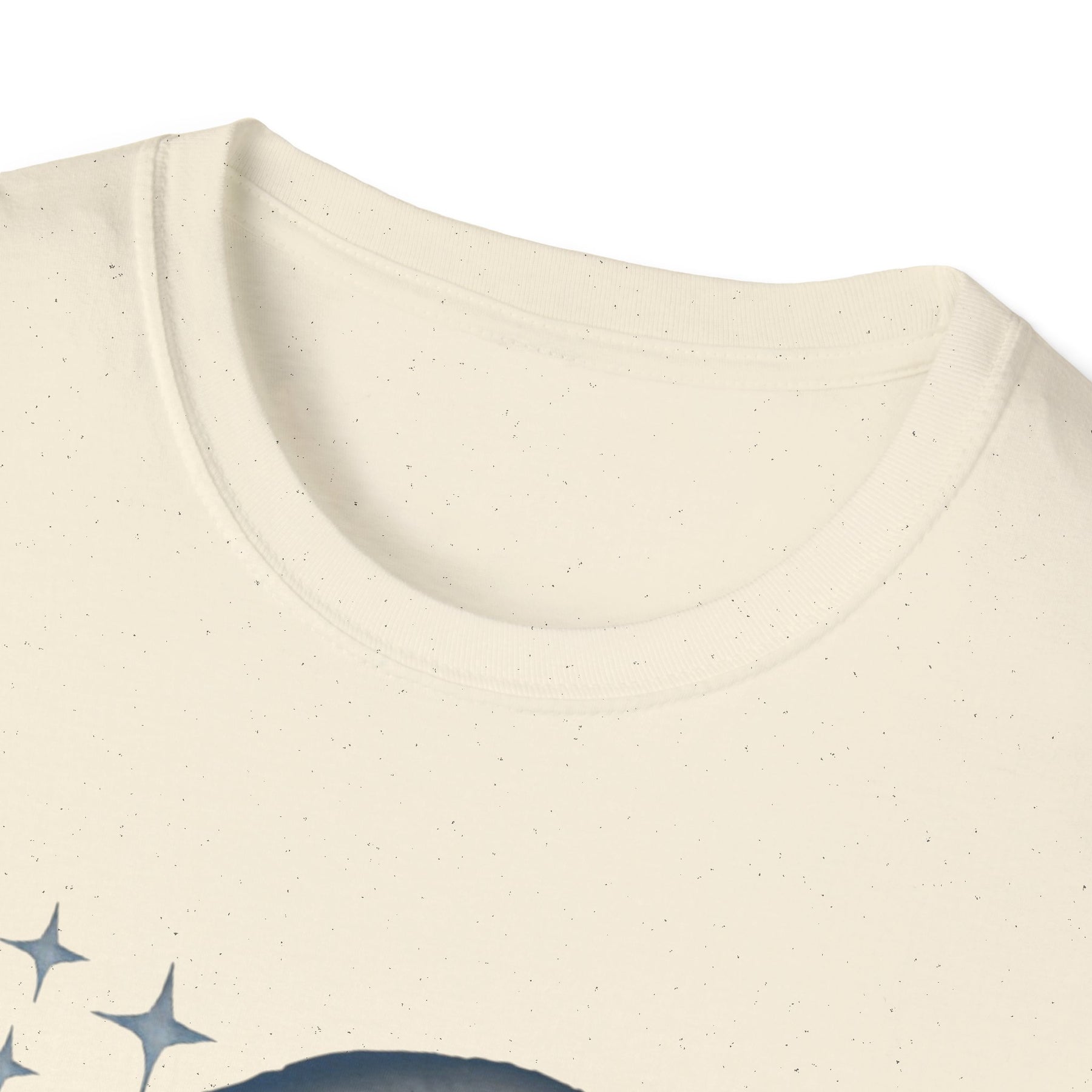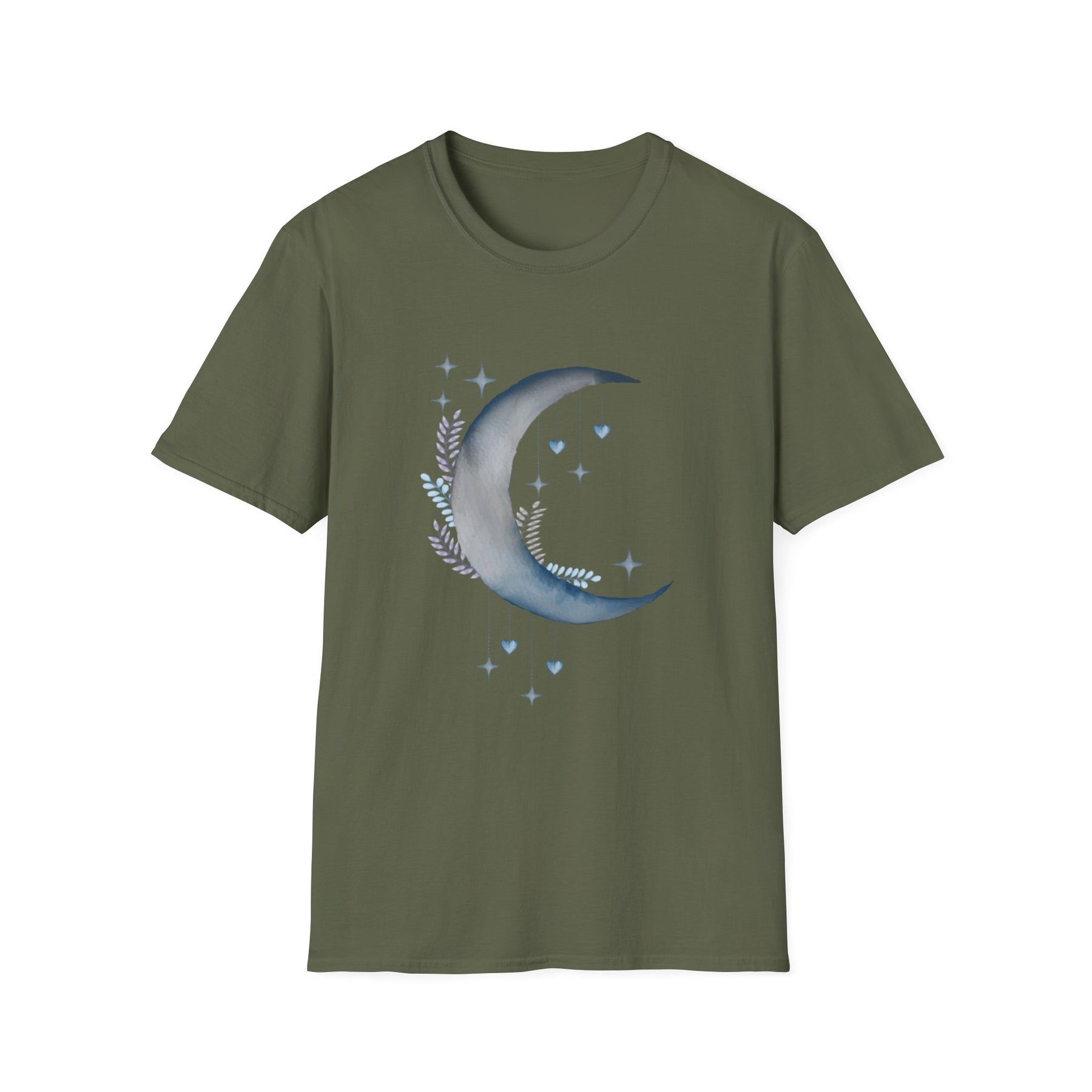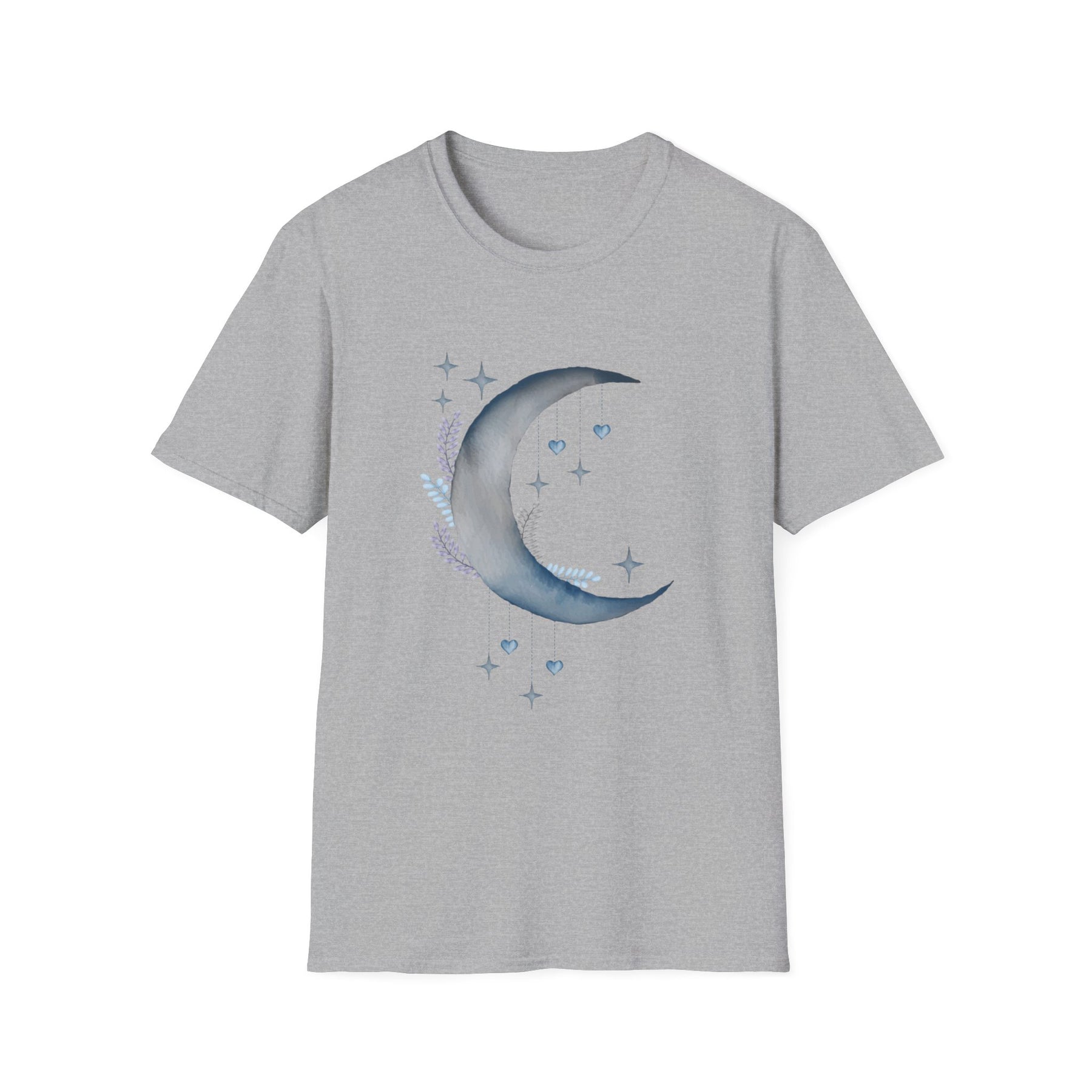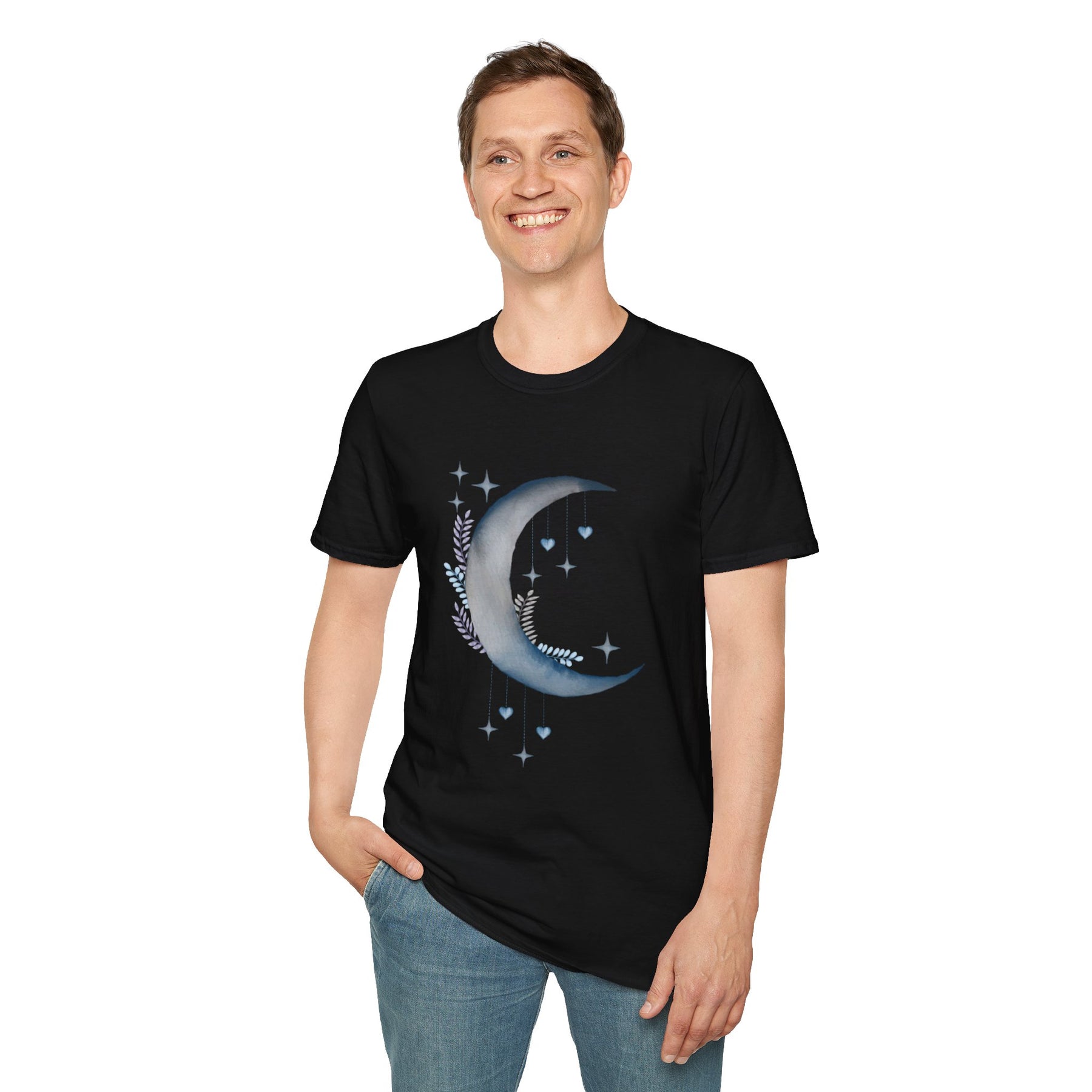 A lightweight cotton tee that feels like a quiet evening under the stars. Soft, slightly slubbed fabric carries a hand-painted crescent moon and scattered stars in muted indigo and silver tones. Wear it tucked into high-waist jeans or layered under an open cardigan for slow walks, tea at dusk, or cozy nights reading by a lamp. The relaxed crew neck and classic fit let the art breathe on the front while keeping the silhouette simple and easy to move in. A subtle, calm piece for those who collect small moments and quiet rituals.