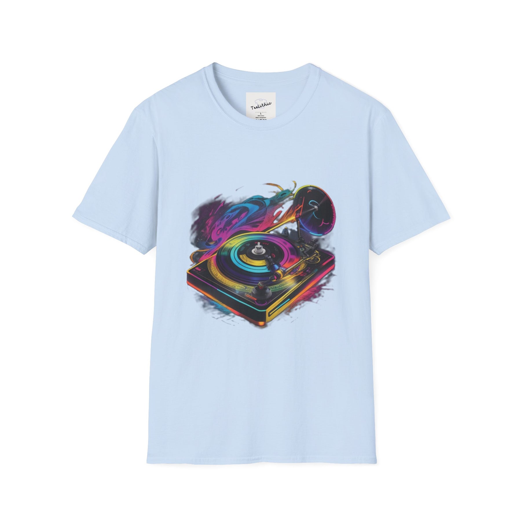 Bright, nostalgic, and full of rhythm — this soft cotton tee brings the neon-lit energy of late-night vinyl sessions straight into your everyday wardrobe. A colorful turntable graphic spins across the chest, its vibrant hues popping against the smooth fabric. Wear it to rehearsals, record-store hunts, or low-key DJ nights; it sits comfortably through long sets and late walks home. The lightweight feel keeps you cool while the classic crew silhouette layers easily under jackets or over long sleeves. For anyone who lives for warm crackles between tracks and the tactile joy of spinning records, this shirt speaks the language of grooves and glow-in-the-dark nostalgia.