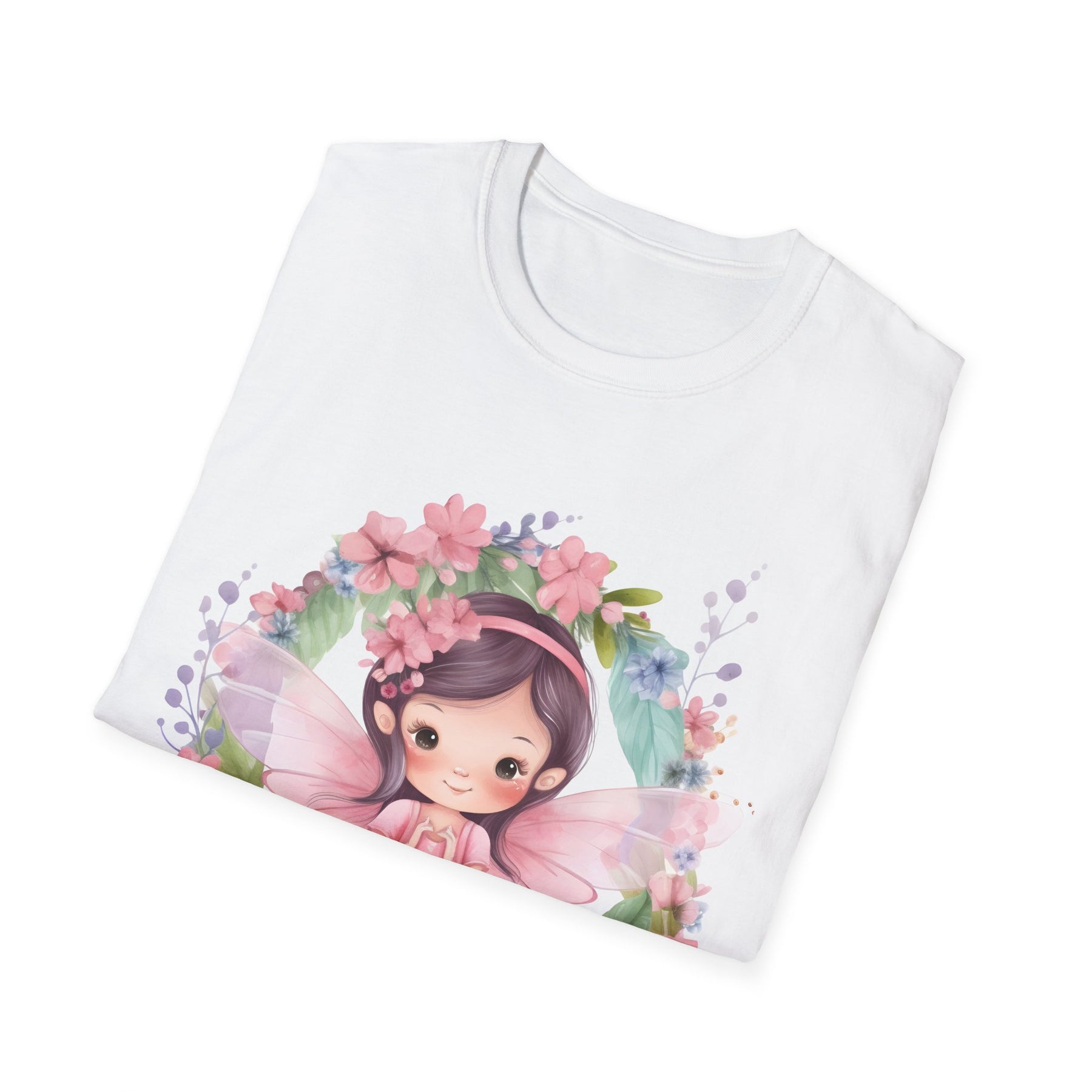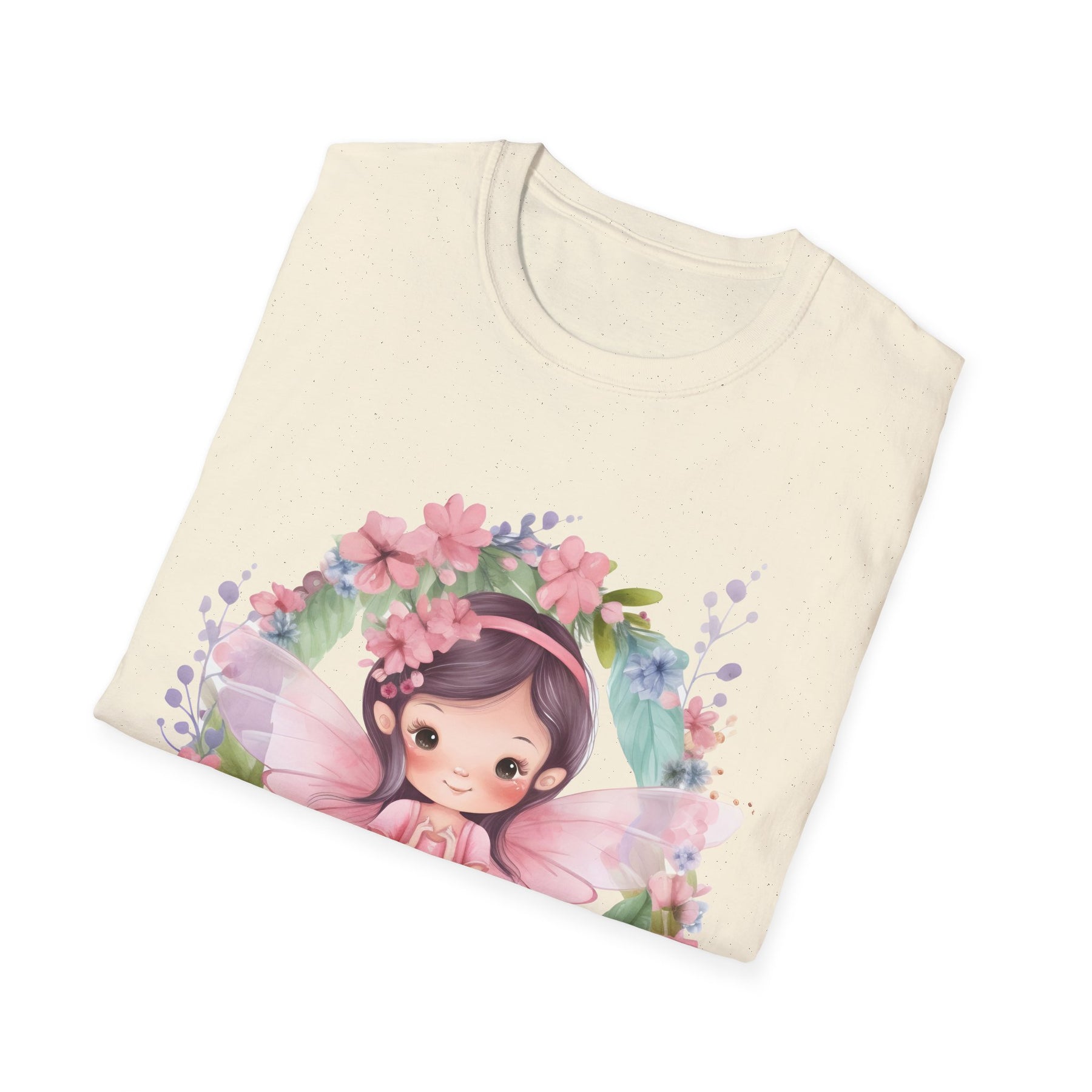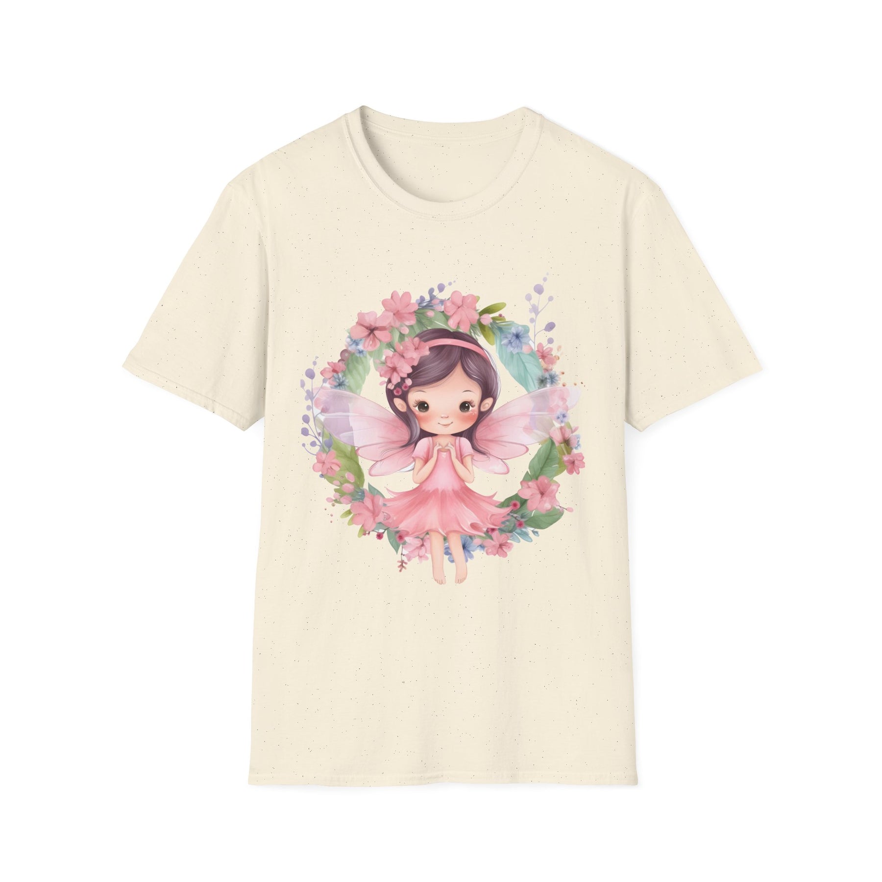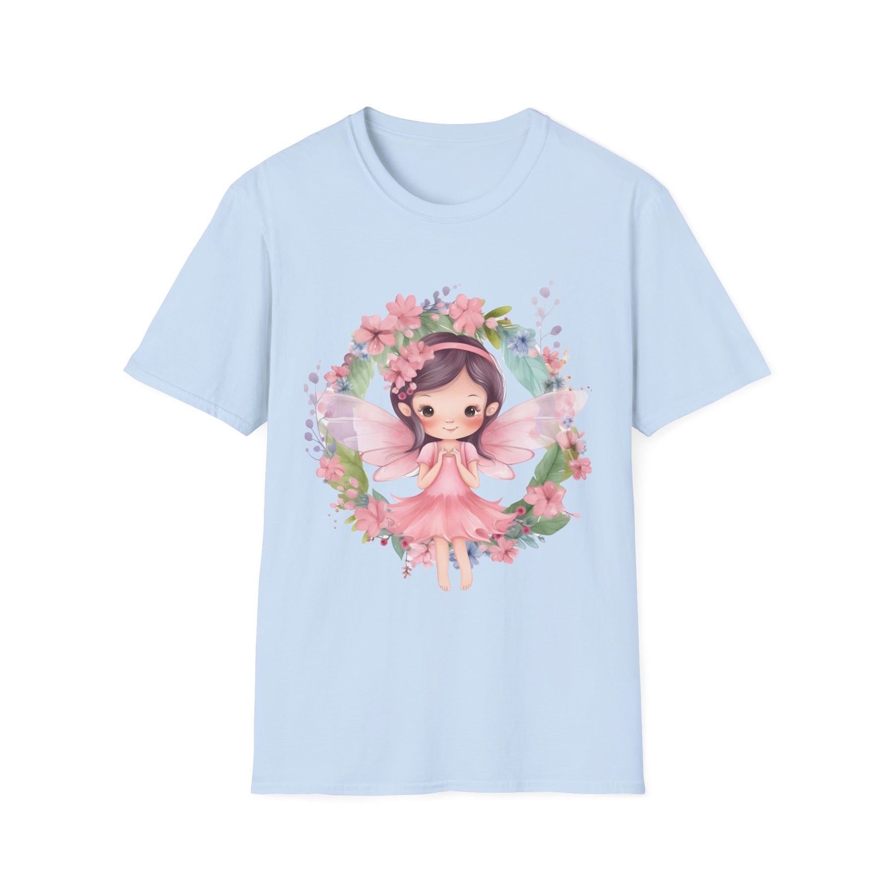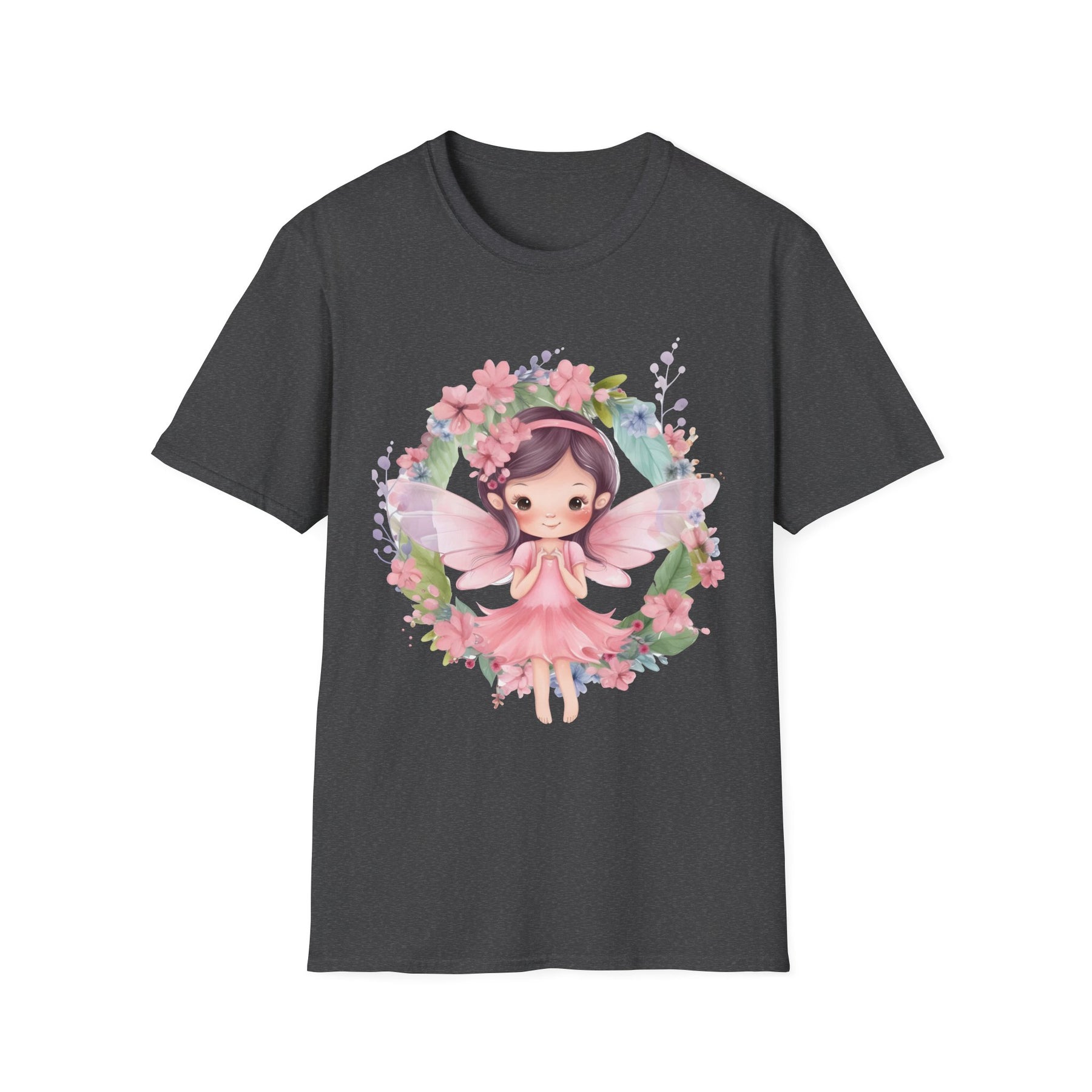 Soft, lightweight, and sprinkled with whimsy — this cotton tee brings a little fairy-glow to everyday wear. A delicate pink fairy sits inside a watercolor wreath of blossoms, wings softly translucent against the tee’s smooth white canvas. Wear it on slow weekend mornings, during playdates or garden strolls, or whenever you want a quiet reminder of wonder. The fabric drapes gently, the crew neckline keeps the silhouette clean, and the printed label adds comfort so nothing distracts from that tiny, joyful character at the center.