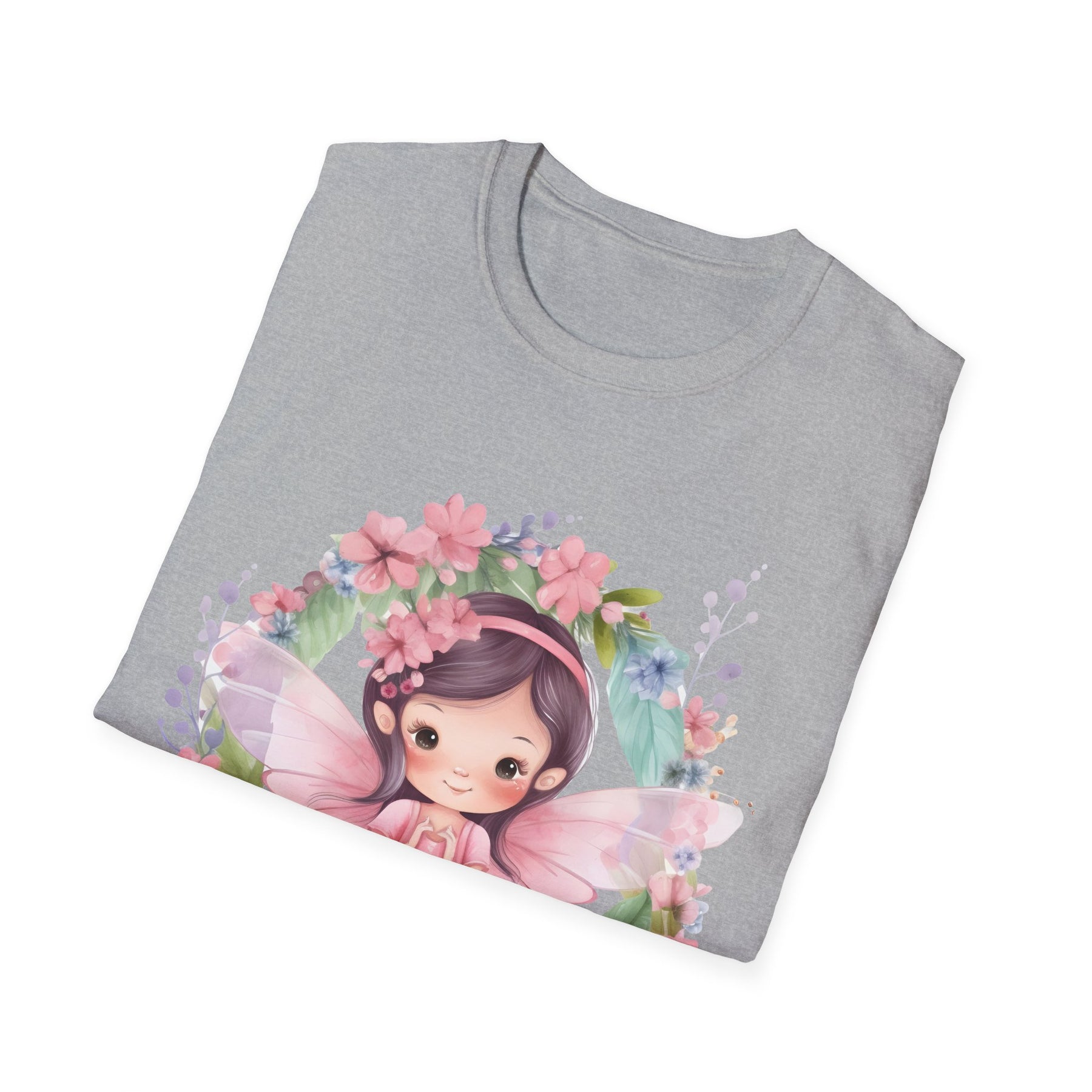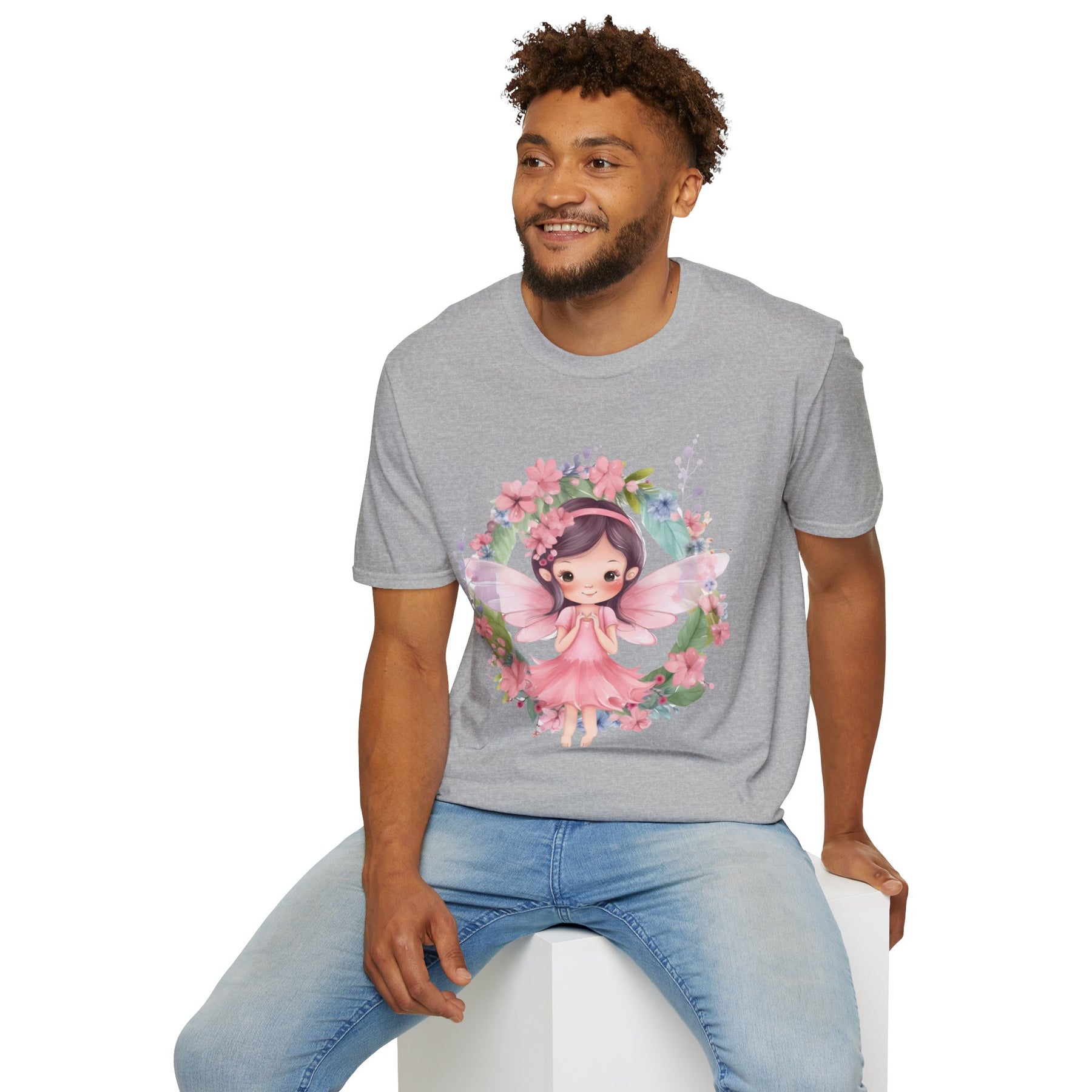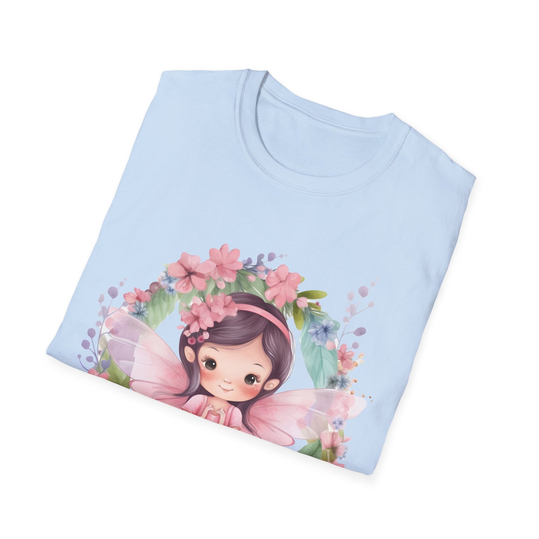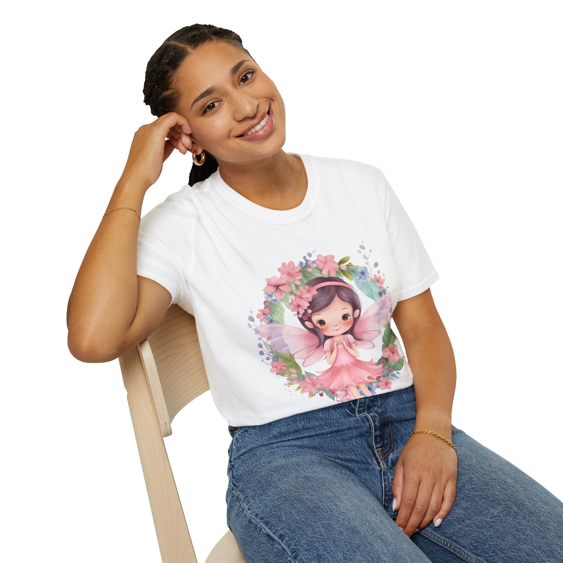 Soft, lightweight, and sprinkled with whimsy — this cotton tee brings a little fairy-glow to everyday wear. A delicate pink fairy sits inside a watercolor wreath of blossoms, wings softly translucent against the tee’s smooth white canvas. Wear it on slow weekend mornings, during playdates or garden strolls, or whenever you want a quiet reminder of wonder. The fabric drapes gently, the crew neckline keeps the silhouette clean, and the printed label adds comfort so nothing distracts from that tiny, joyful character at the center.