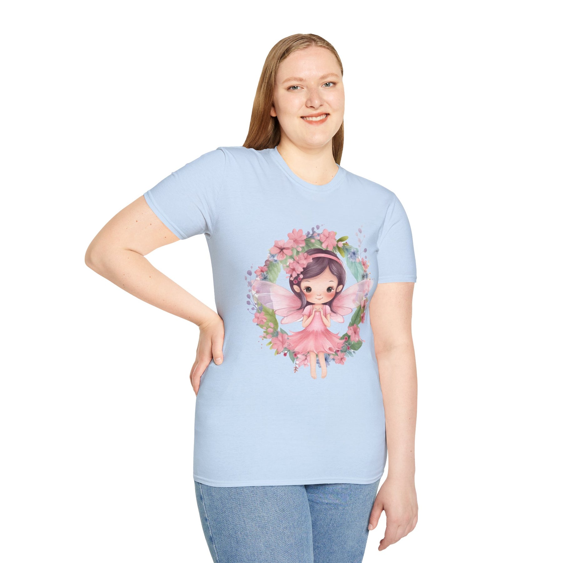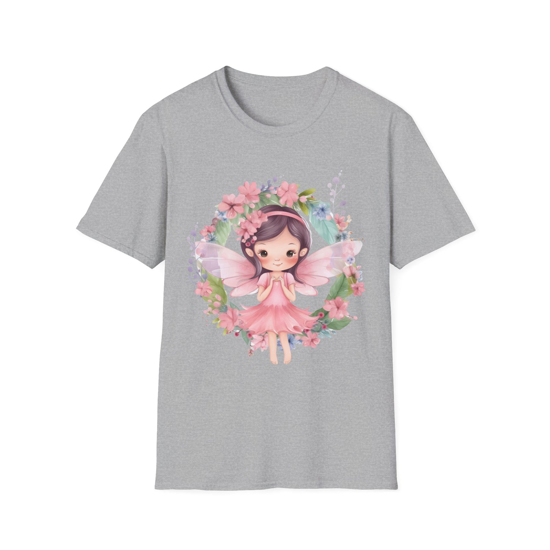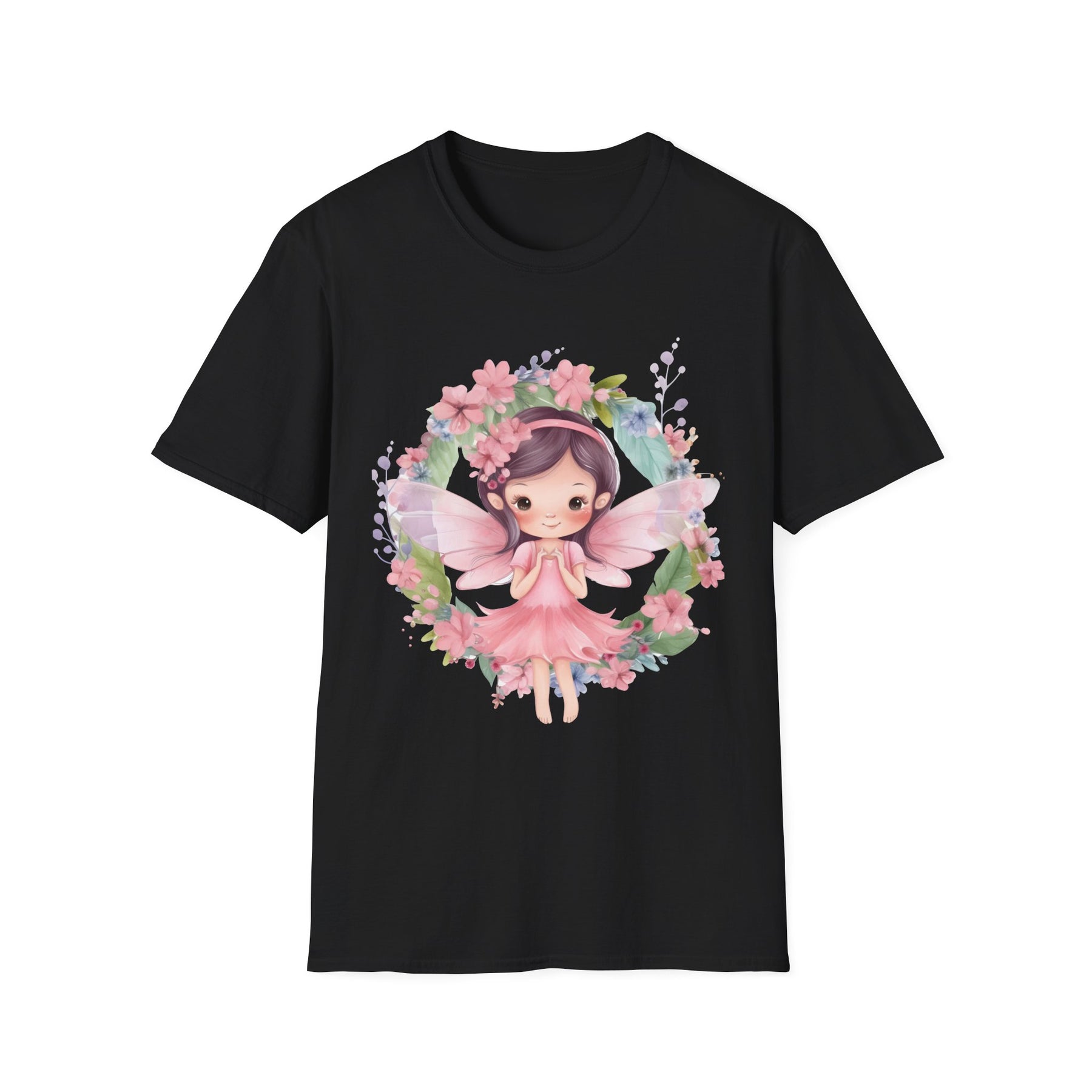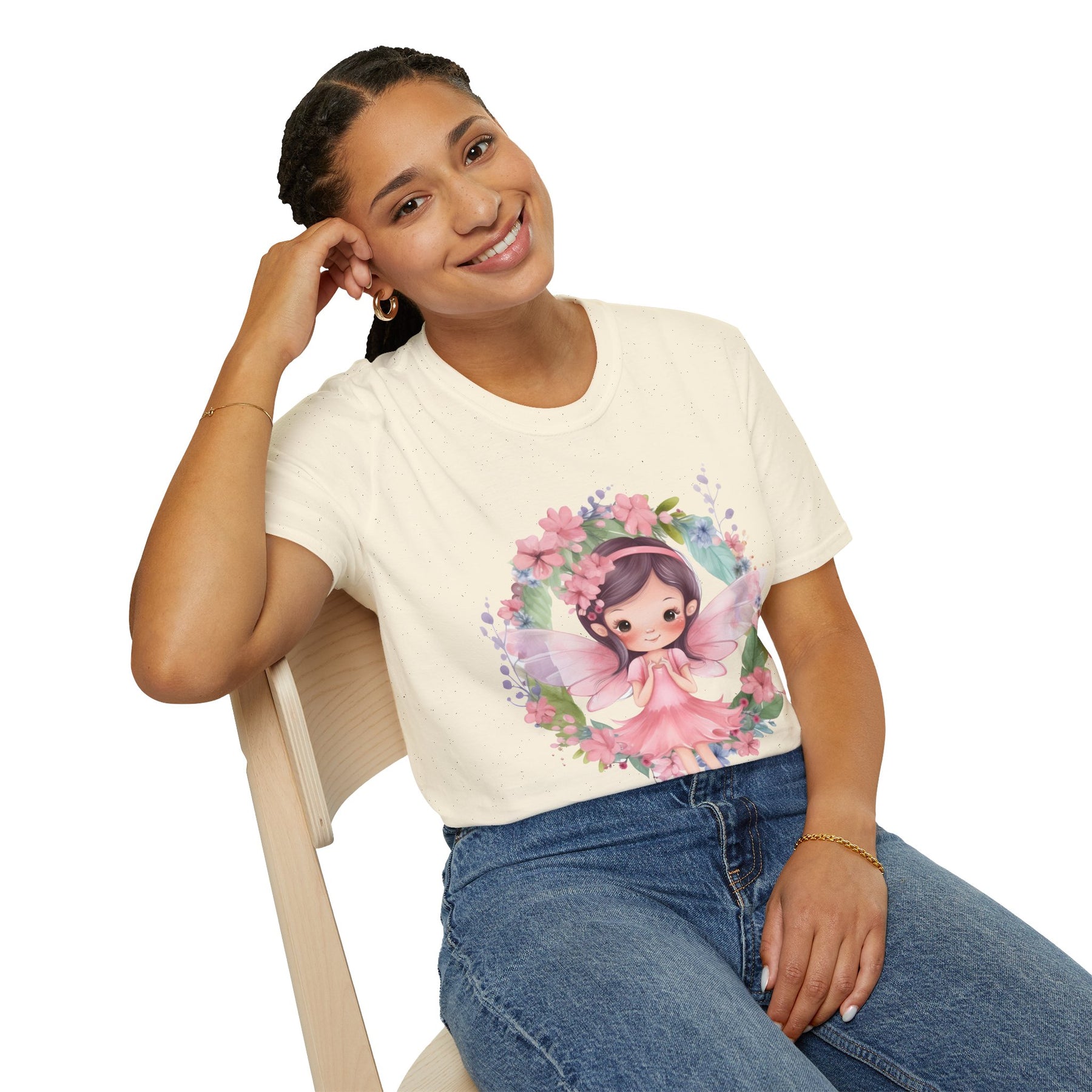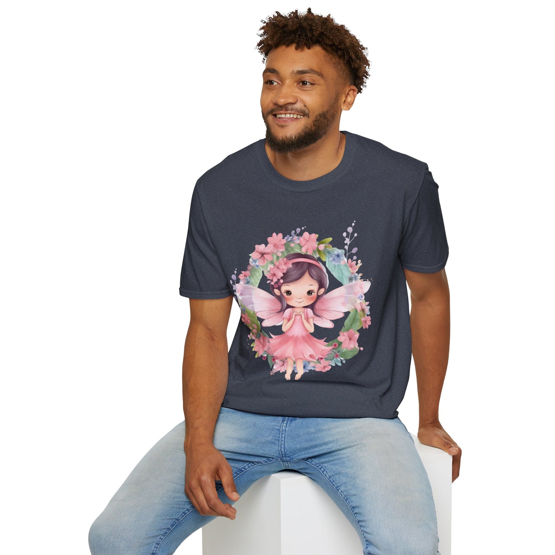 Soft, lightweight, and sprinkled with whimsy — this cotton tee brings a little fairy-glow to everyday wear. A delicate pink fairy sits inside a watercolor wreath of blossoms, wings softly translucent against the tee’s smooth white canvas. Wear it on slow weekend mornings, during playdates or garden strolls, or whenever you want a quiet reminder of wonder. The fabric drapes gently, the crew neckline keeps the silhouette clean, and the printed label adds comfort so nothing distracts from that tiny, joyful character at the center.