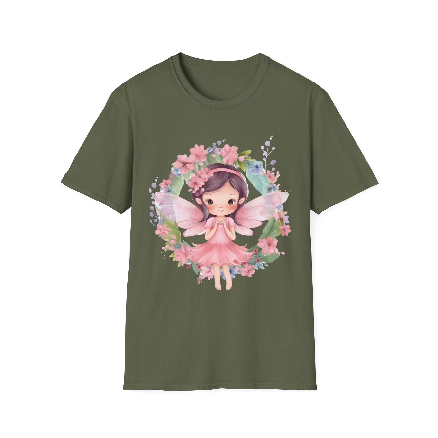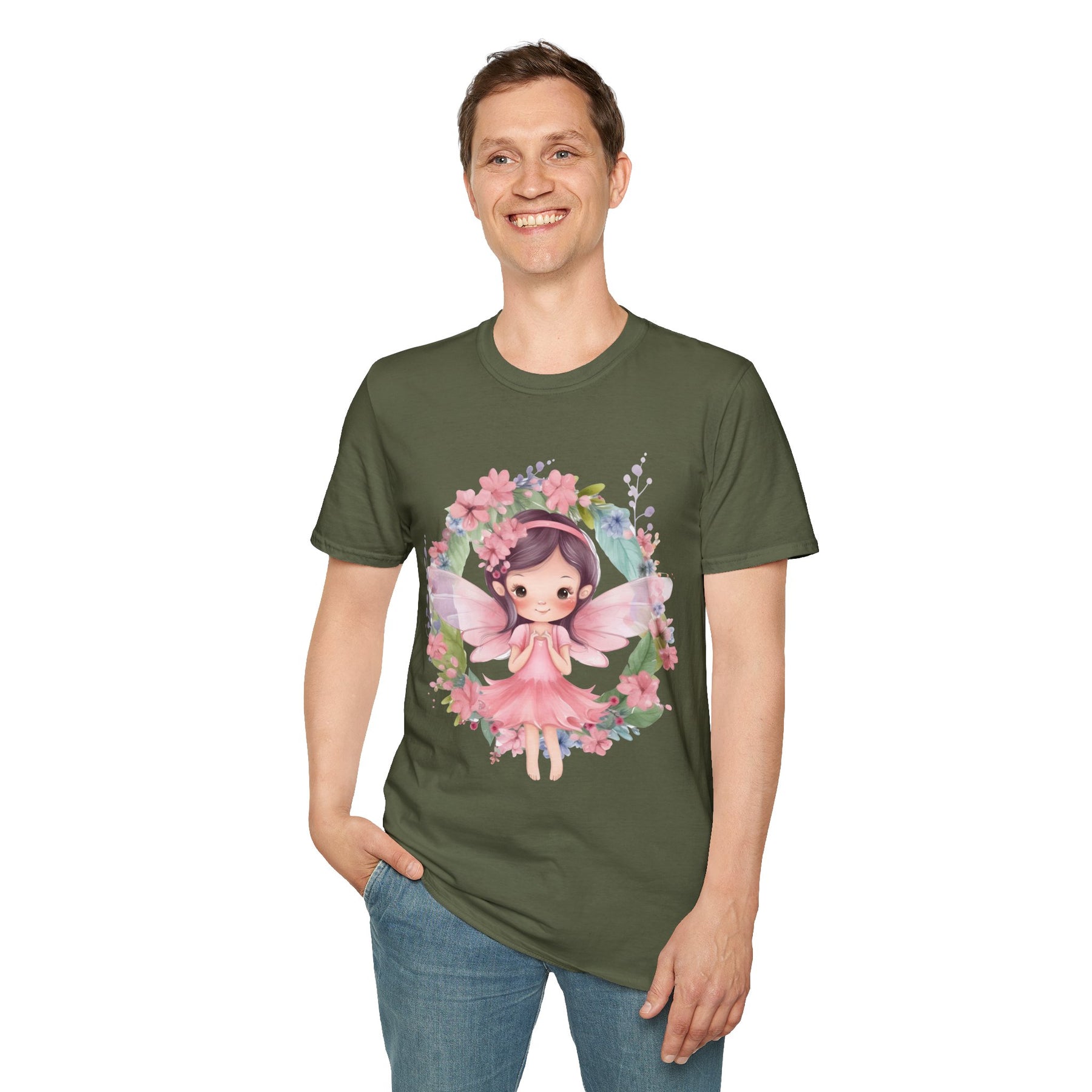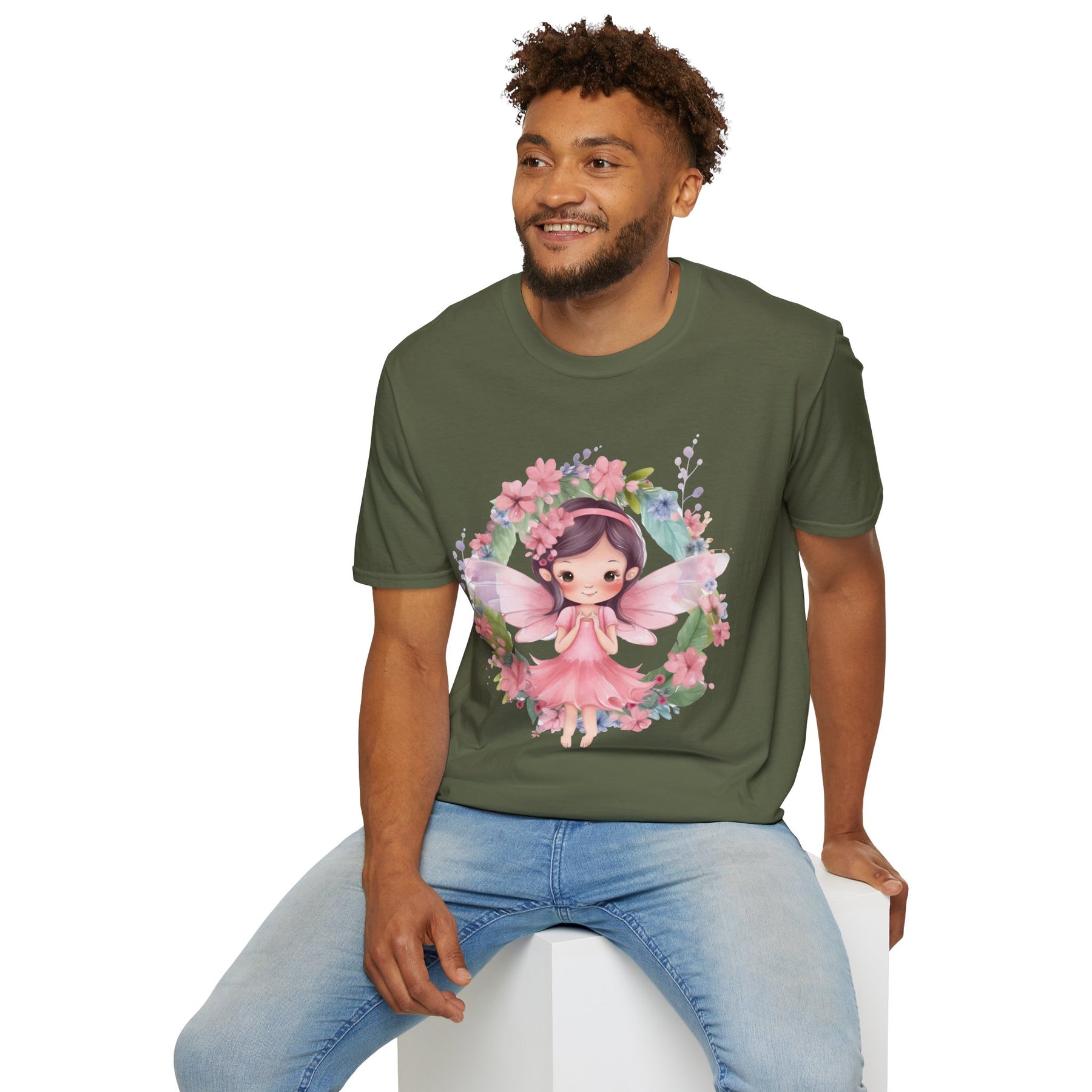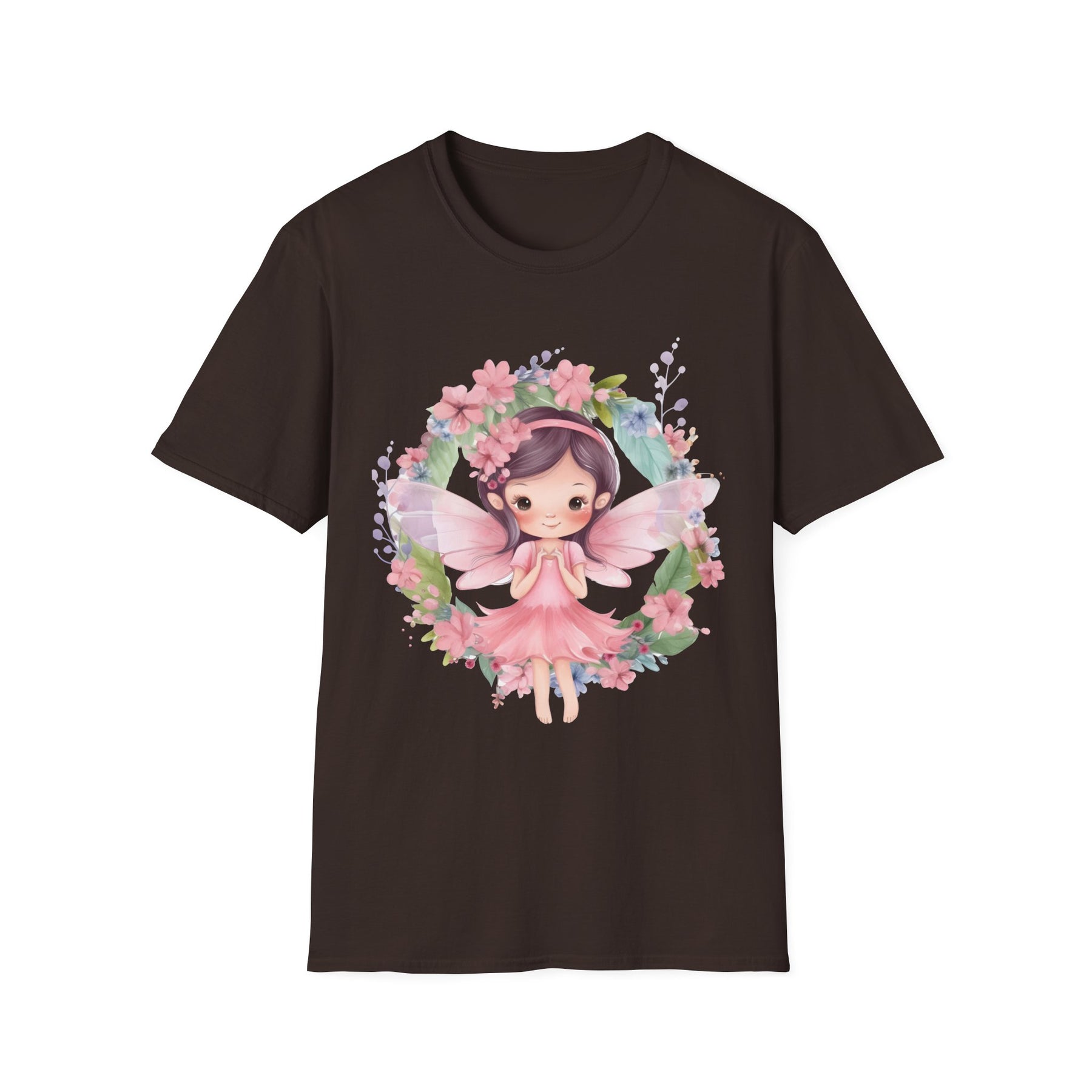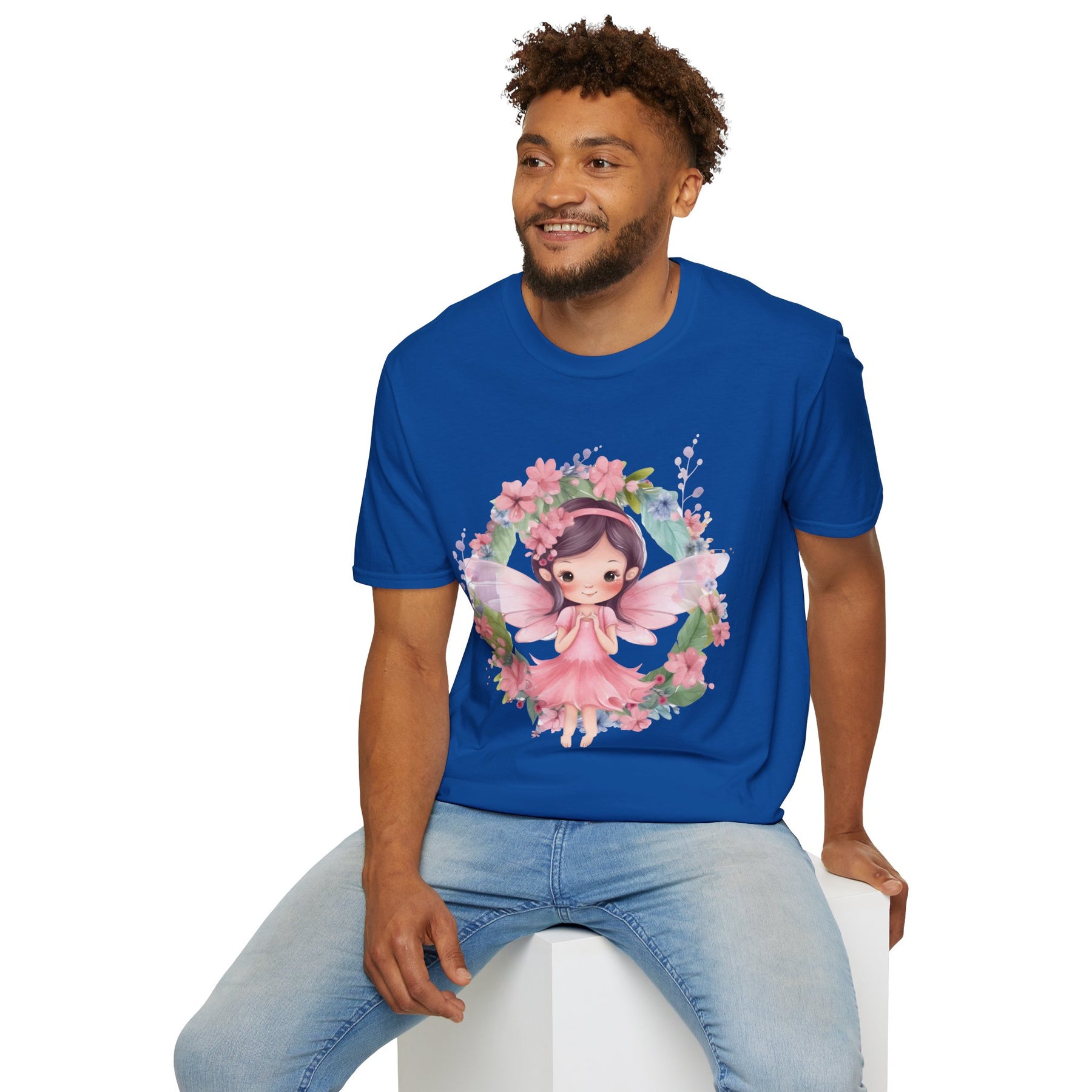 Soft, lightweight, and sprinkled with whimsy — this cotton tee brings a little fairy-glow to everyday wear. A delicate pink fairy sits inside a watercolor wreath of blossoms, wings softly translucent against the tee’s smooth white canvas. Wear it on slow weekend mornings, during playdates or garden strolls, or whenever you want a quiet reminder of wonder. The fabric drapes gently, the crew neckline keeps the silhouette clean, and the printed label adds comfort so nothing distracts from that tiny, joyful character at the center.