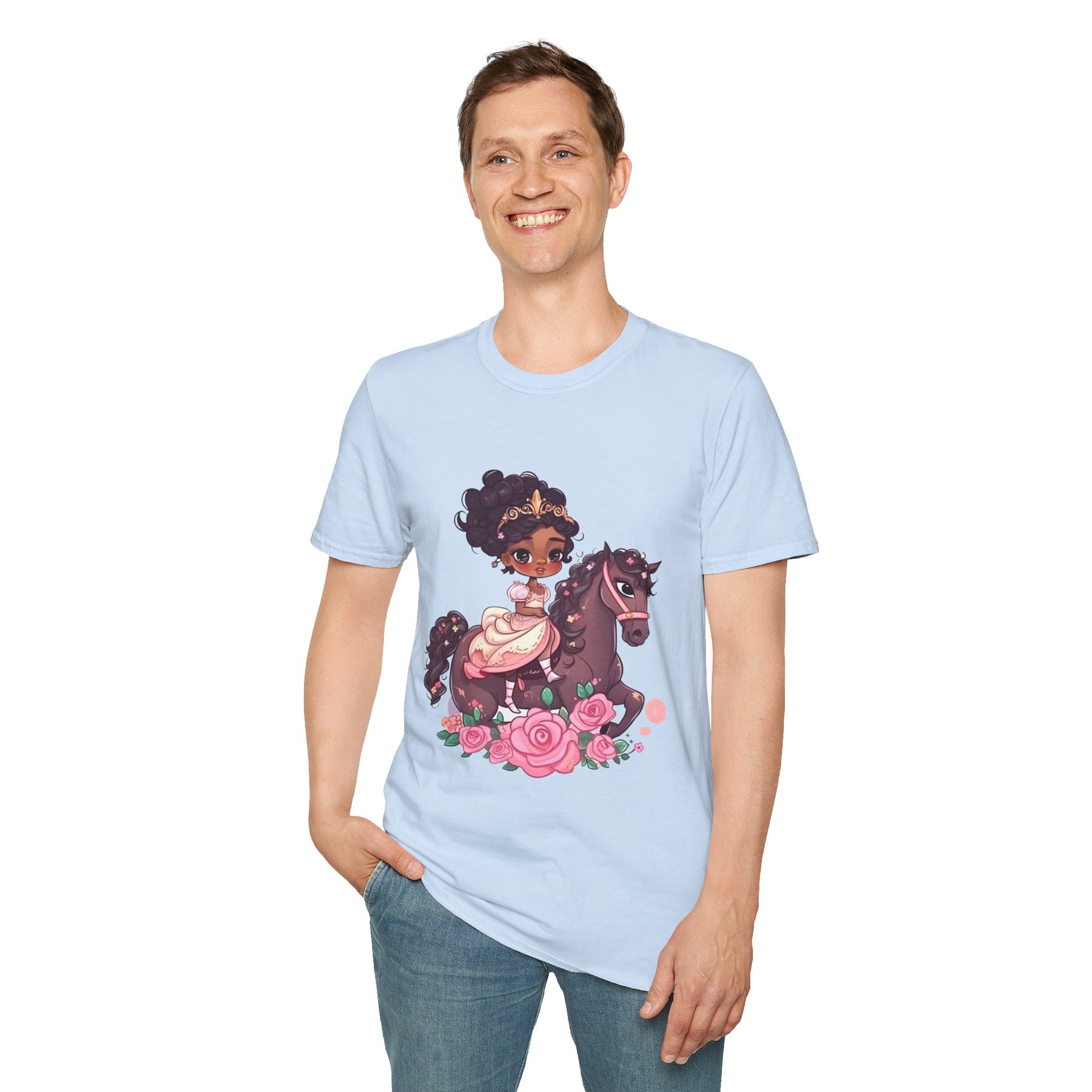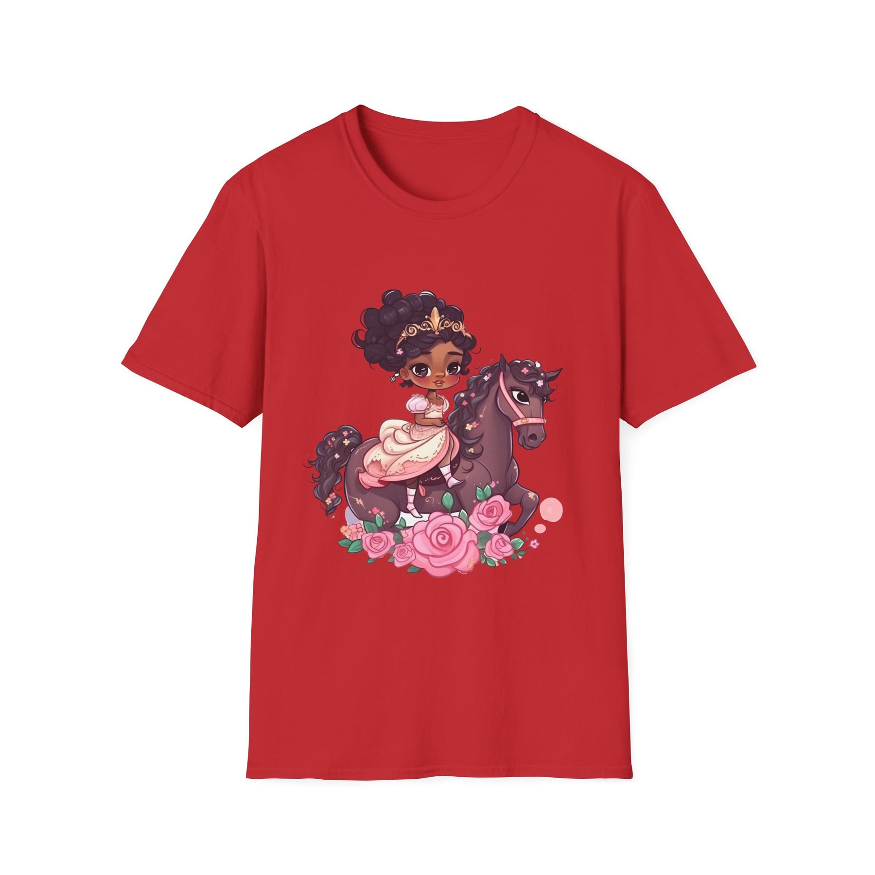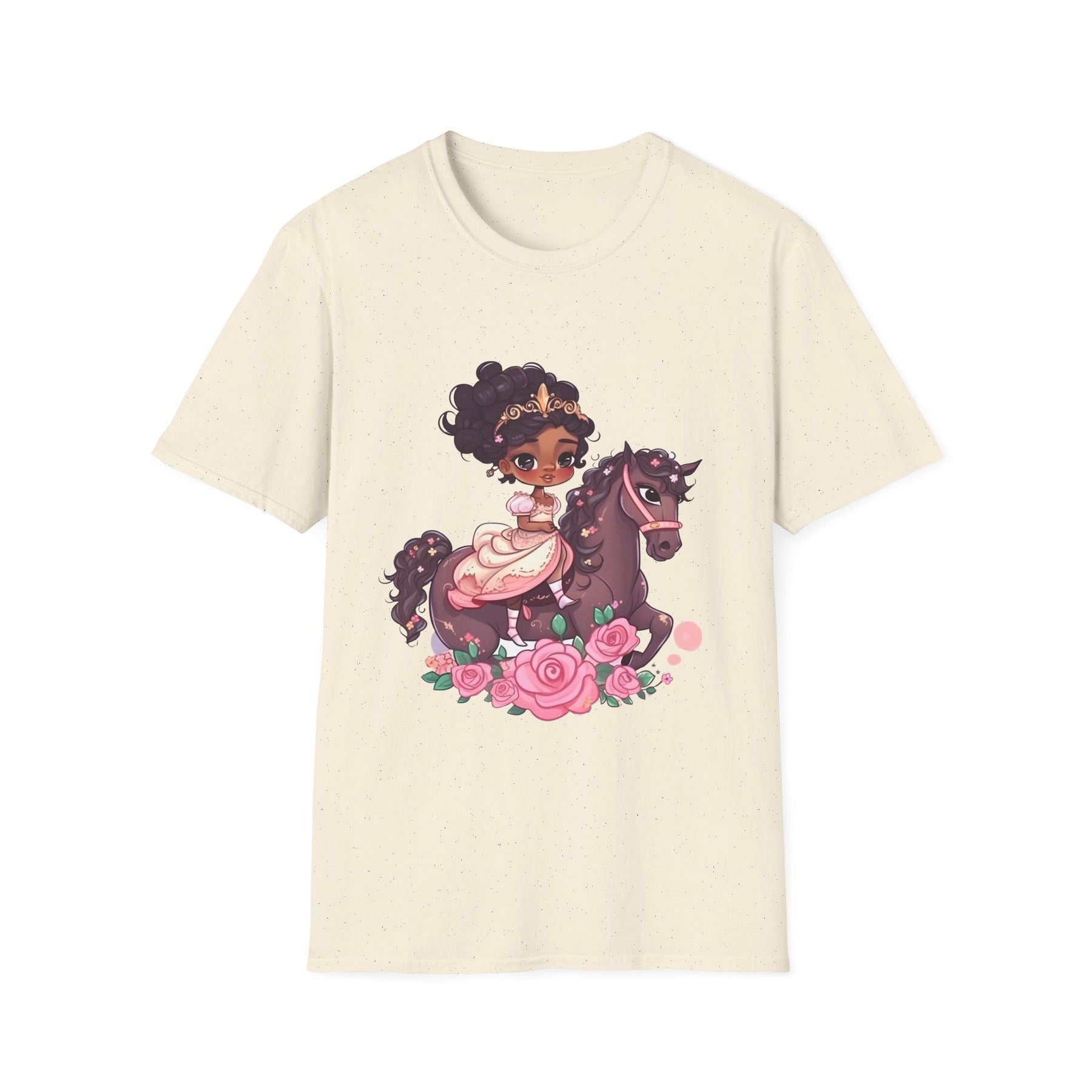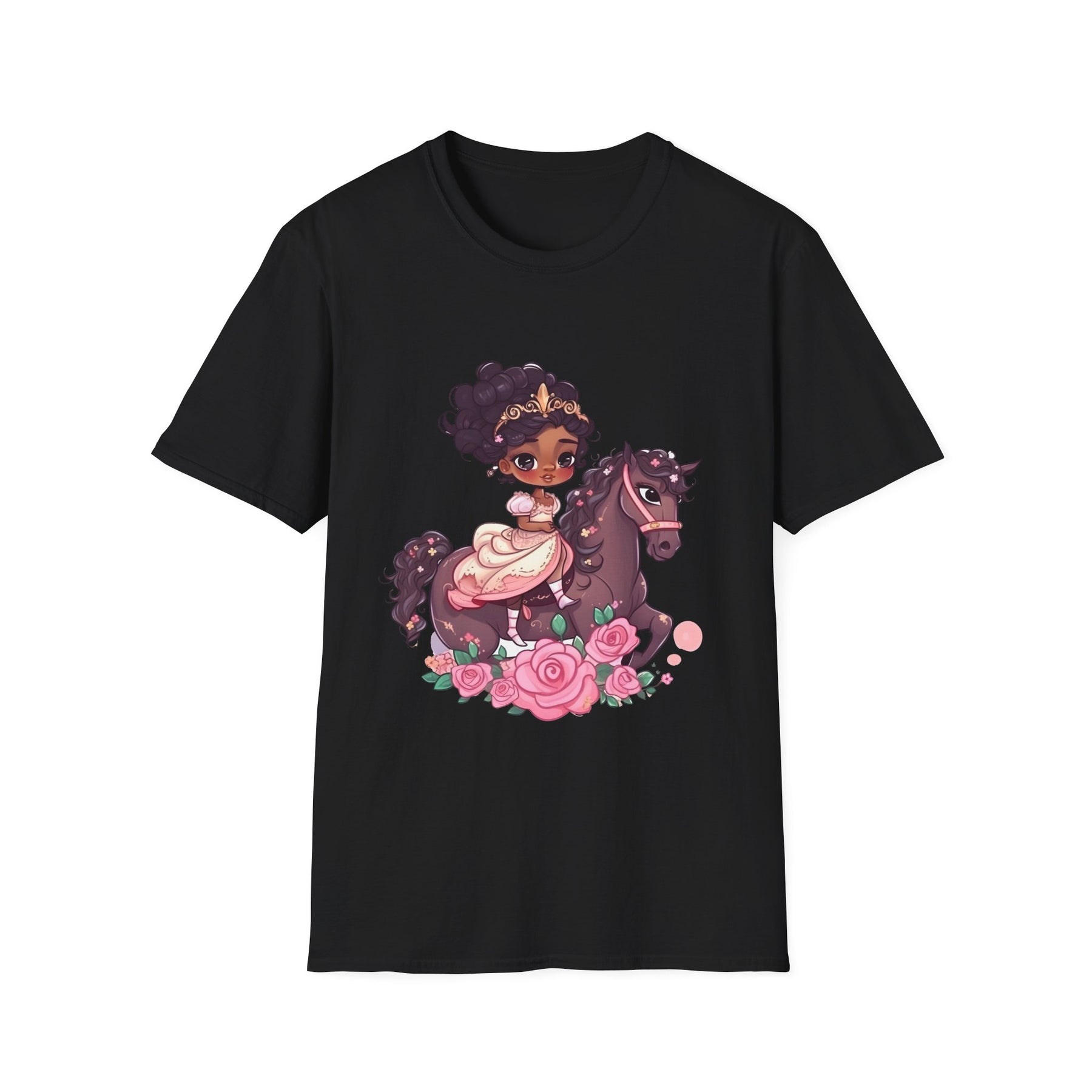 Soft, gentle, and full of story—this lightweight tee carries a sweet illustrated scene: a spirited young girl with a crown, seated on a graceful dark horse surrounded by roses. The image reads like a moment from a bedtime tale—quiet bravery, soft family memories, and childhood wonder. Wear it to bring a little whimsy into everyday life, whether layered under a jacket for town walks or folded into a weekend outfit for strolling to a café. The smooth ring-spun cotton feels cool against the skin and keeps the print colors vivid, while the clean crew neckline and classic fit make it easy to move, play, and linger in comfortable style.