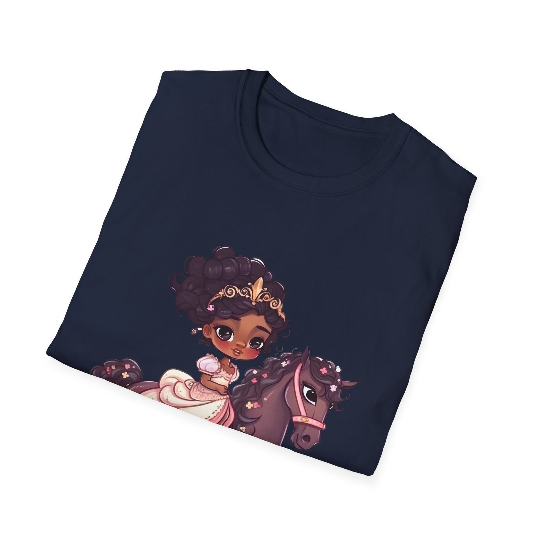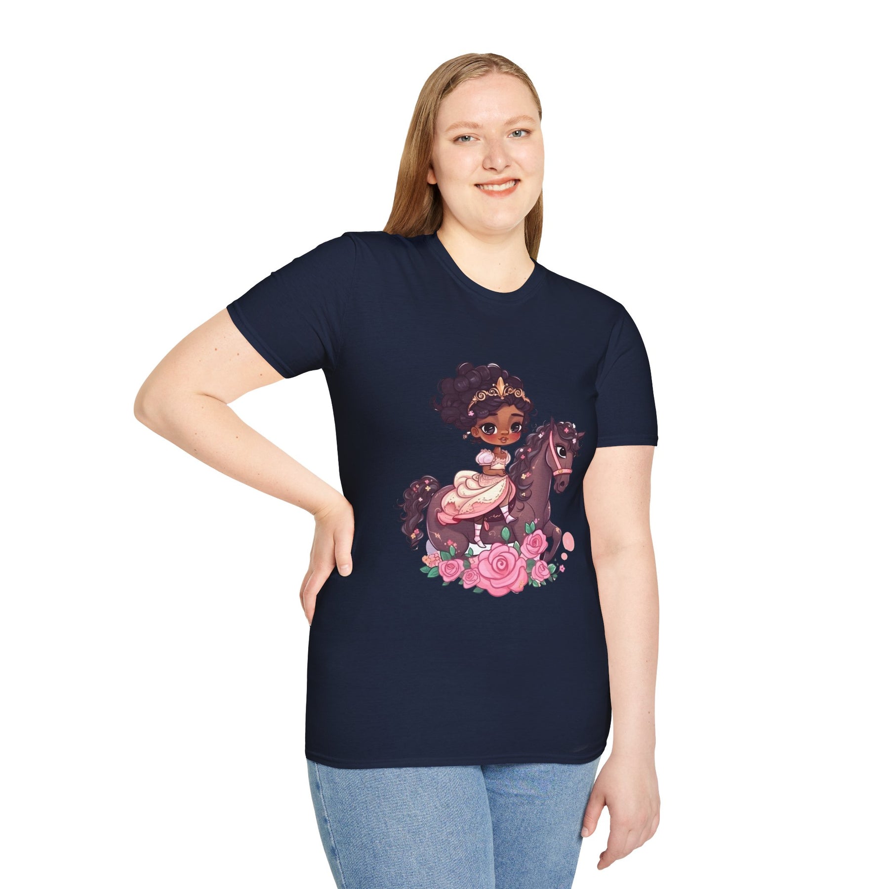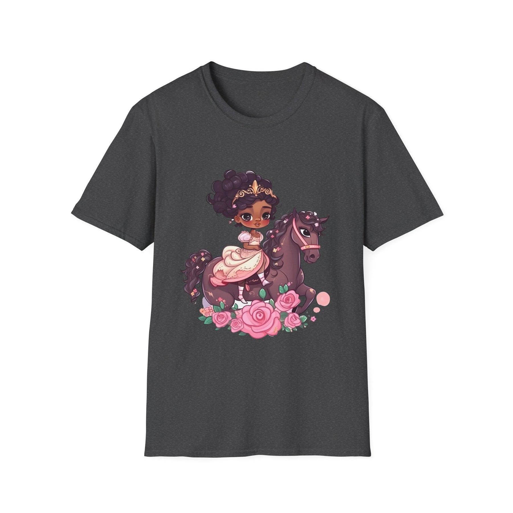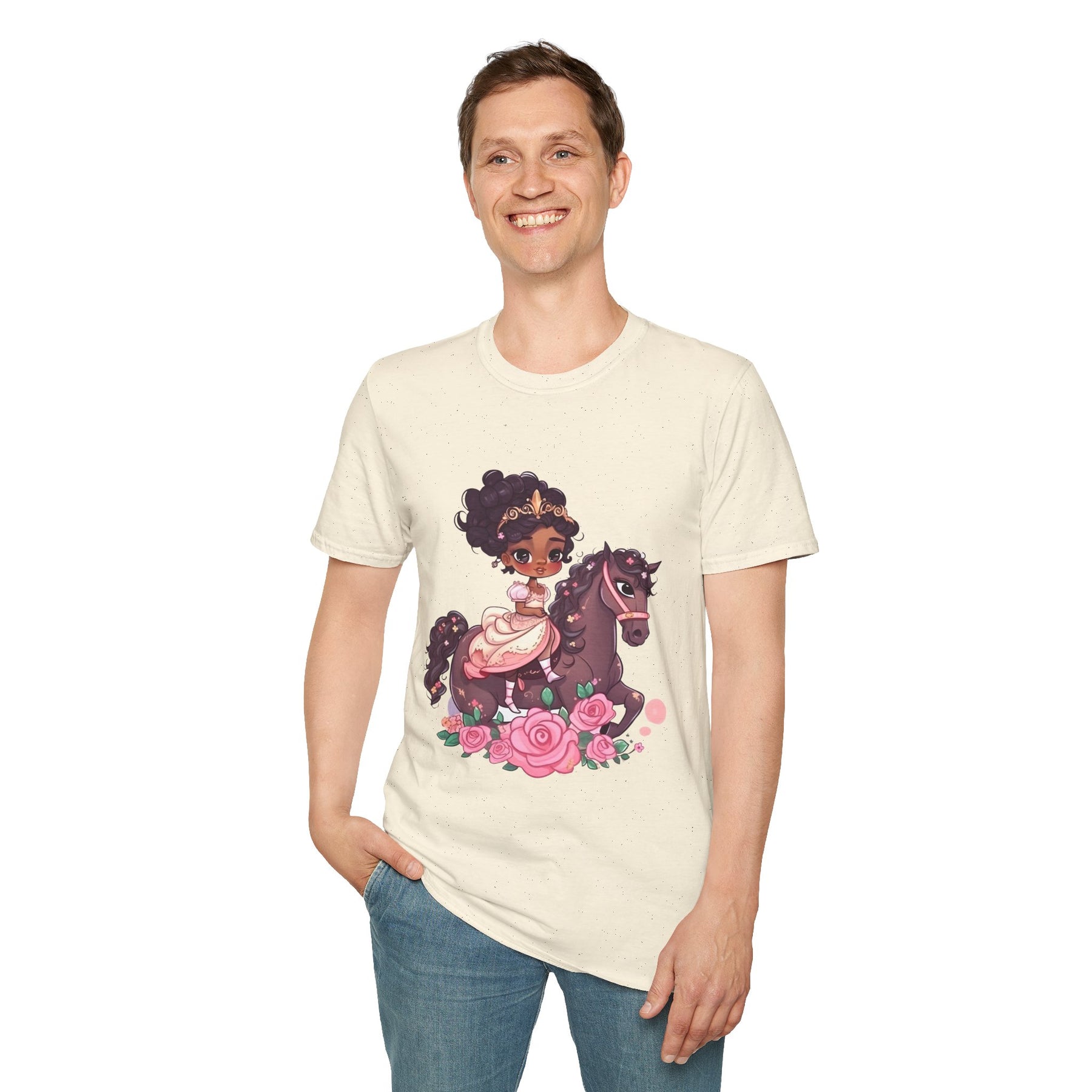 Soft, gentle, and full of story—this lightweight tee carries a sweet illustrated scene: a spirited young girl with a crown, seated on a graceful dark horse surrounded by roses. The image reads like a moment from a bedtime tale—quiet bravery, soft family memories, and childhood wonder. Wear it to bring a little whimsy into everyday life, whether layered under a jacket for town walks or folded into a weekend outfit for strolling to a café. The smooth ring-spun cotton feels cool against the skin and keeps the print colors vivid, while the clean crew neckline and classic fit make it easy to move, play, and linger in comfortable style.