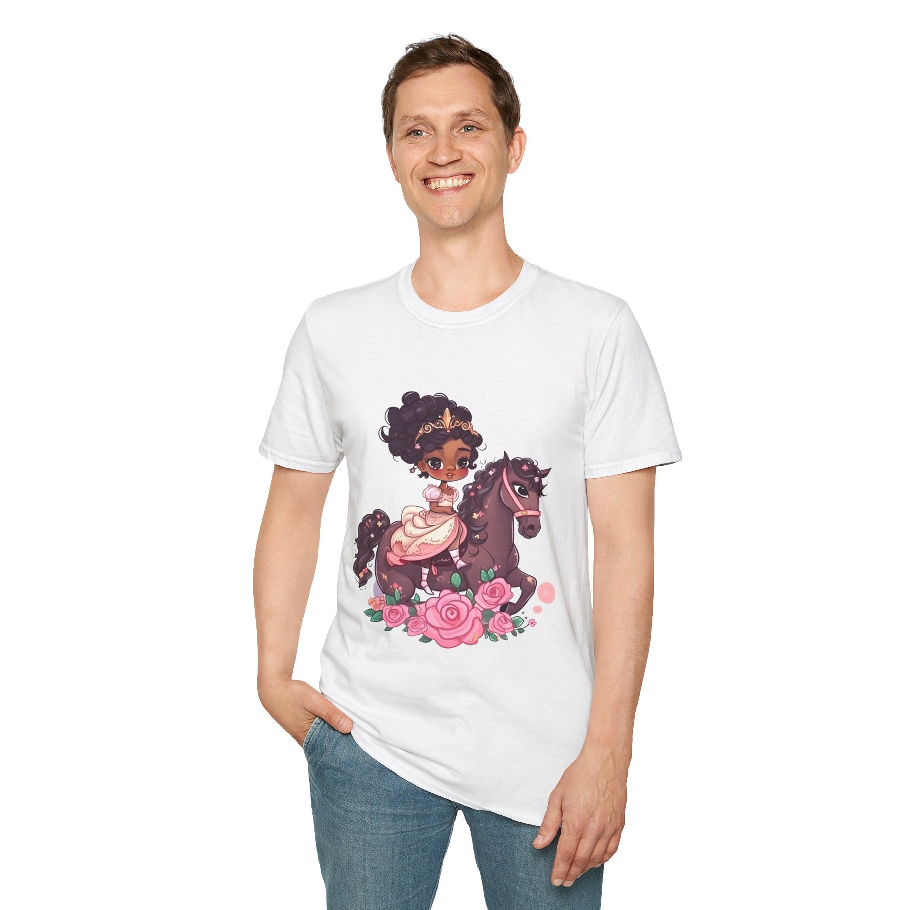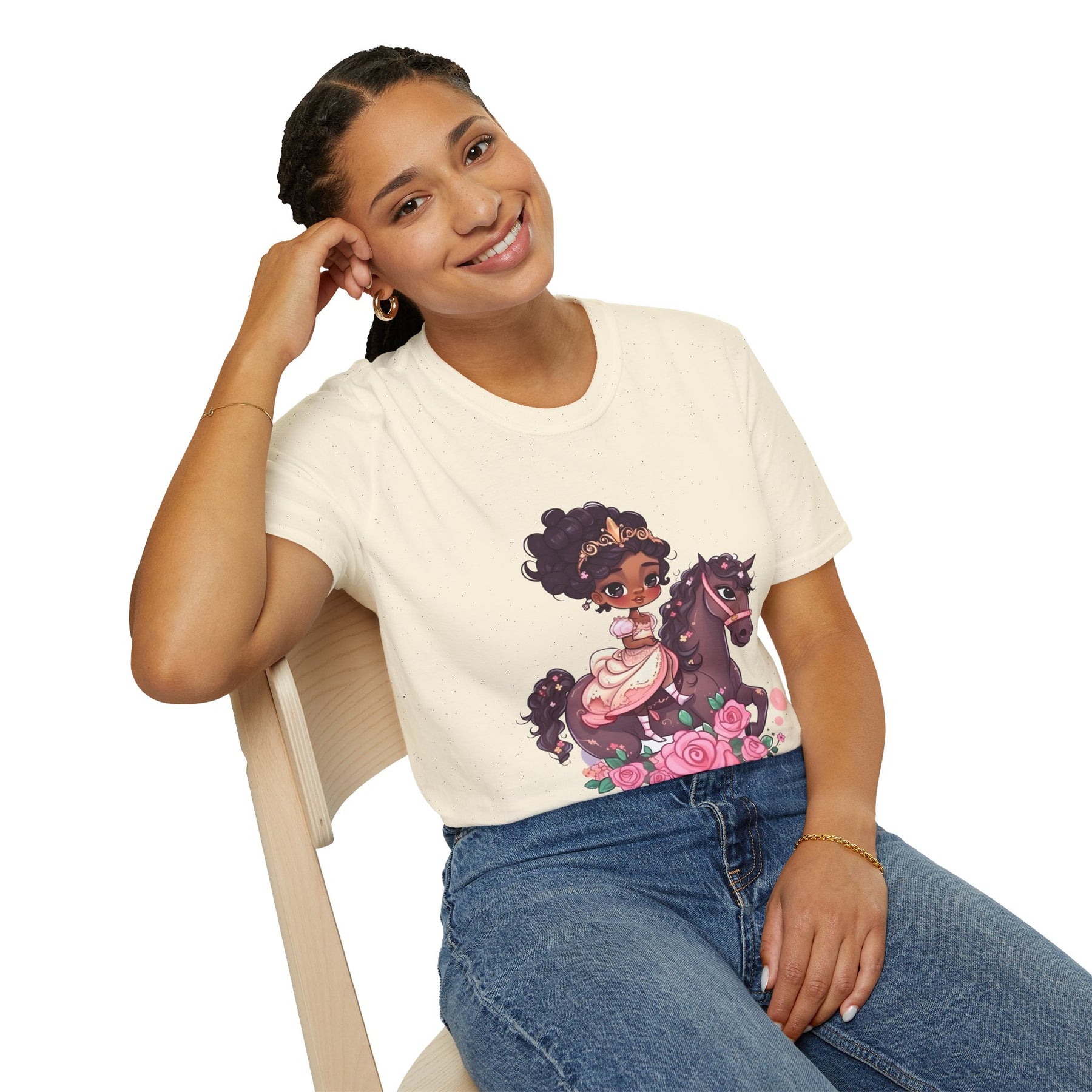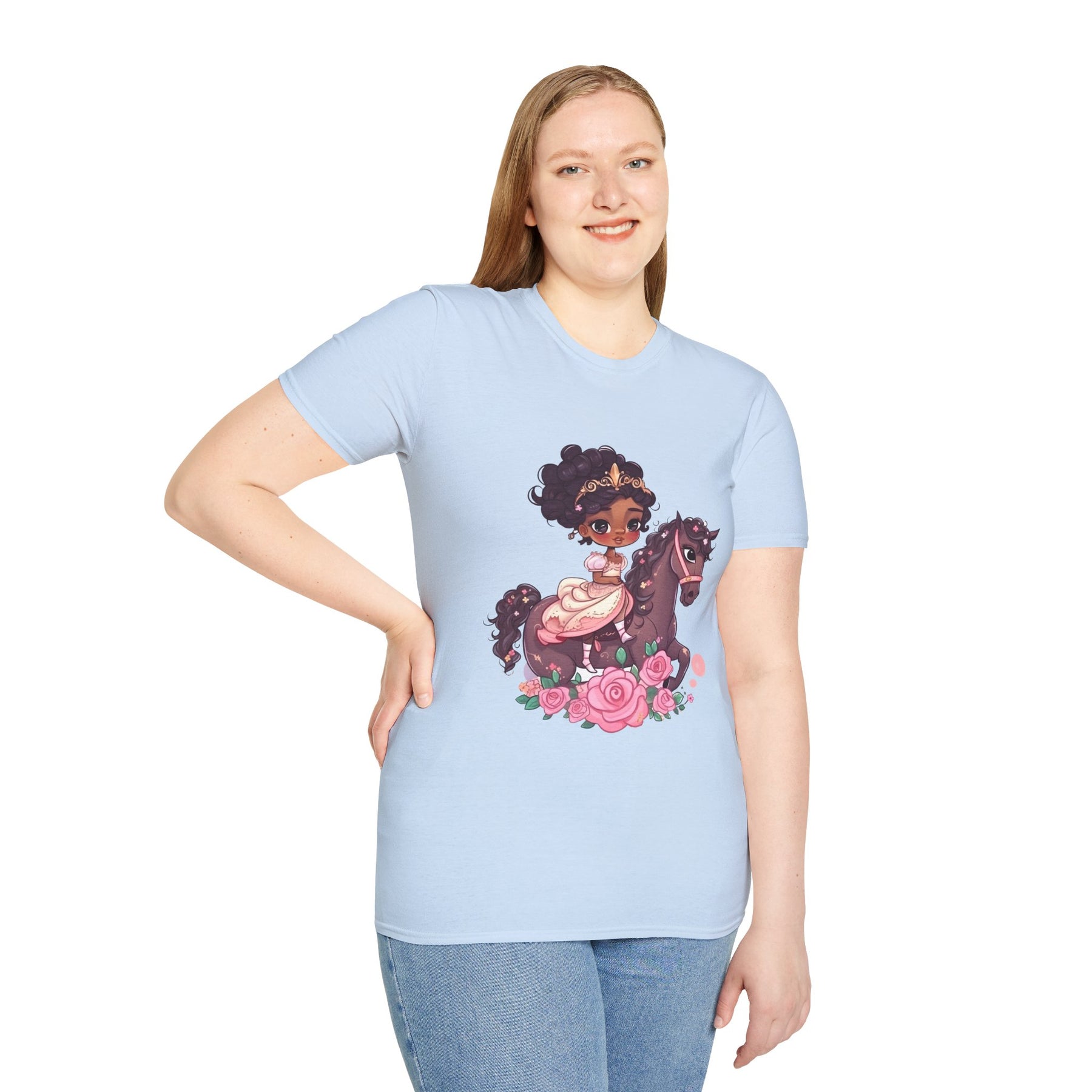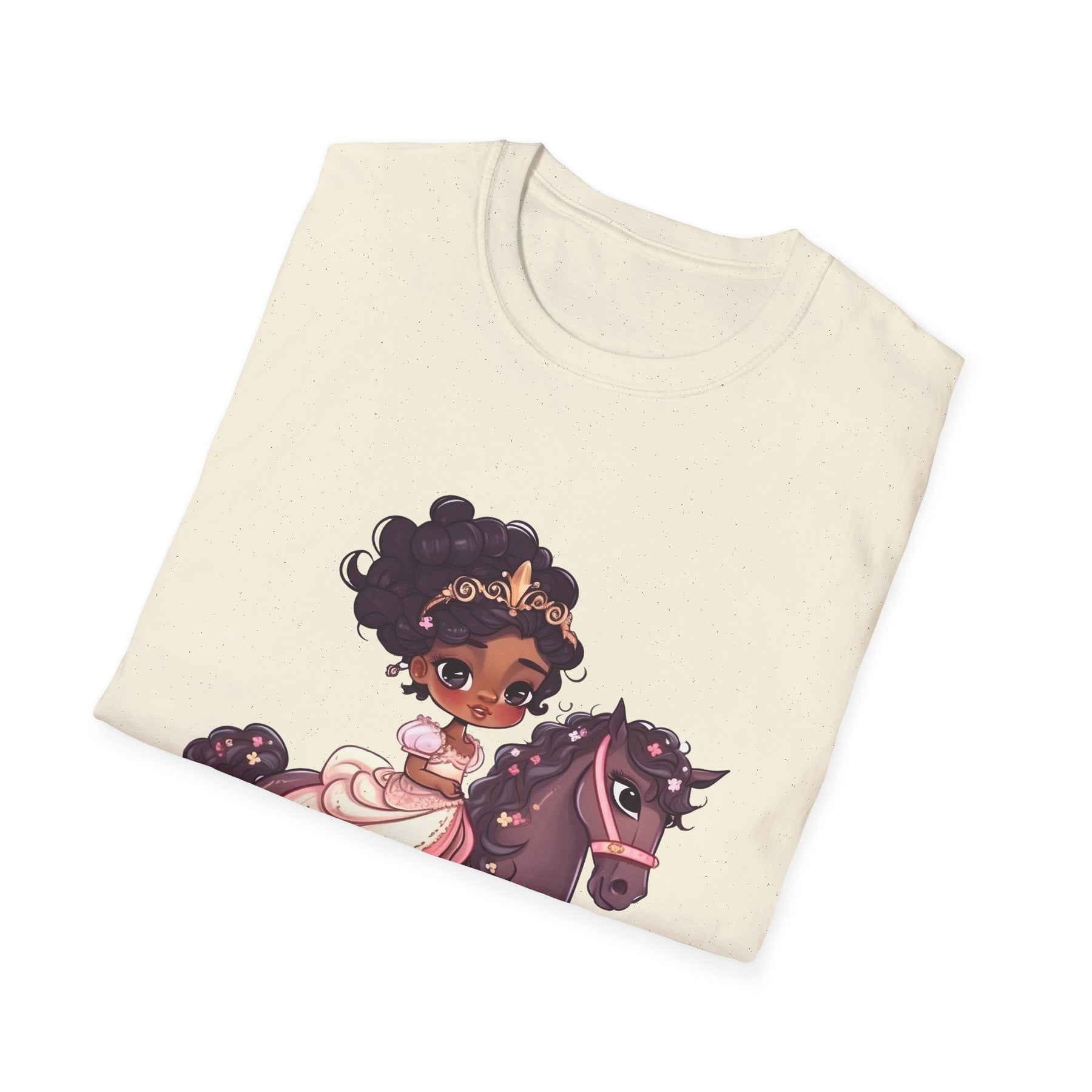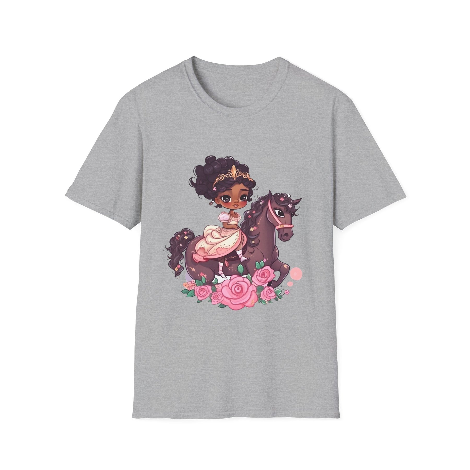 Soft, gentle, and full of story—this lightweight tee carries a sweet illustrated scene: a spirited young girl with a crown, seated on a graceful dark horse surrounded by roses. The image reads like a moment from a bedtime tale—quiet bravery, soft family memories, and childhood wonder. Wear it to bring a little whimsy into everyday life, whether layered under a jacket for town walks or folded into a weekend outfit for strolling to a café. The smooth ring-spun cotton feels cool against the skin and keeps the print colors vivid, while the clean crew neckline and classic fit make it easy to move, play, and linger in comfortable style.