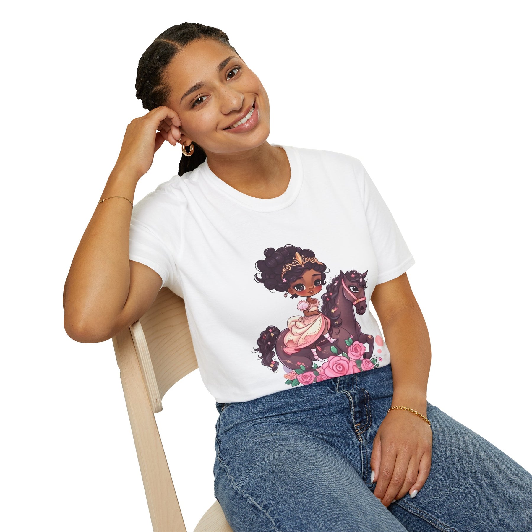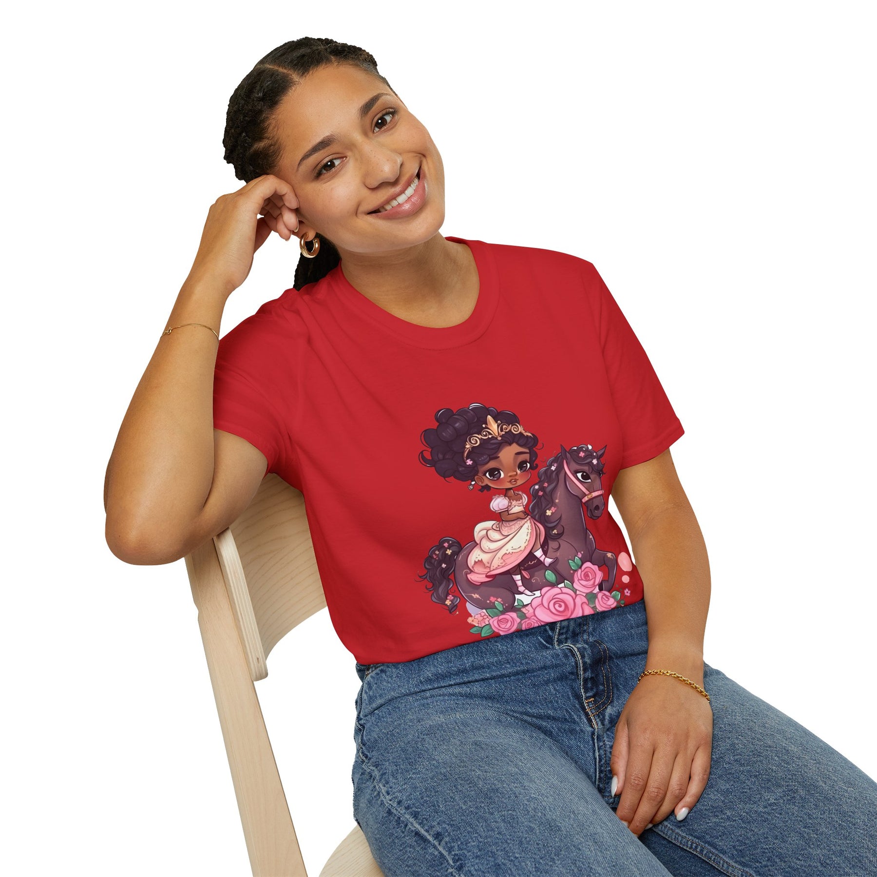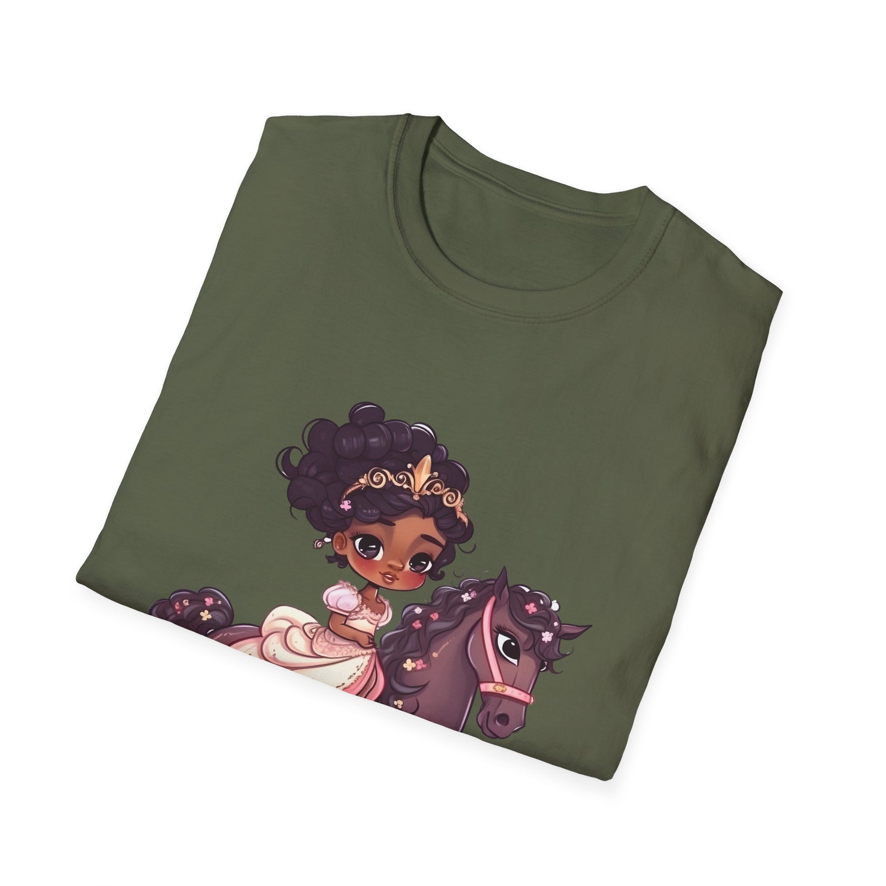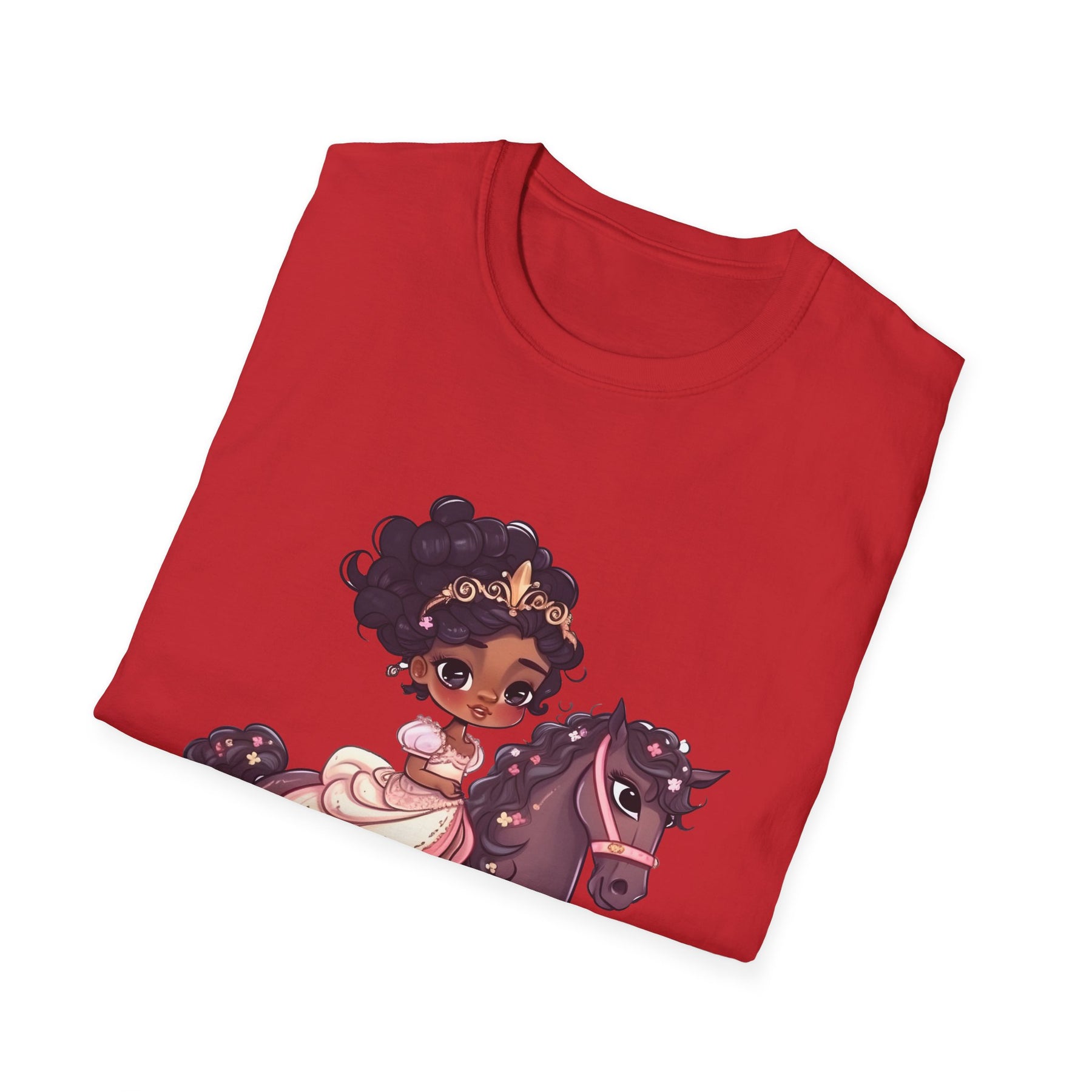 Soft, gentle, and full of story—this lightweight tee carries a sweet illustrated scene: a spirited young girl with a crown, seated on a graceful dark horse surrounded by roses. The image reads like a moment from a bedtime tale—quiet bravery, soft family memories, and childhood wonder. Wear it to bring a little whimsy into everyday life, whether layered under a jacket for town walks or folded into a weekend outfit for strolling to a café. The smooth ring-spun cotton feels cool against the skin and keeps the print colors vivid, while the clean crew neckline and classic fit make it easy to move, play, and linger in comfortable style.