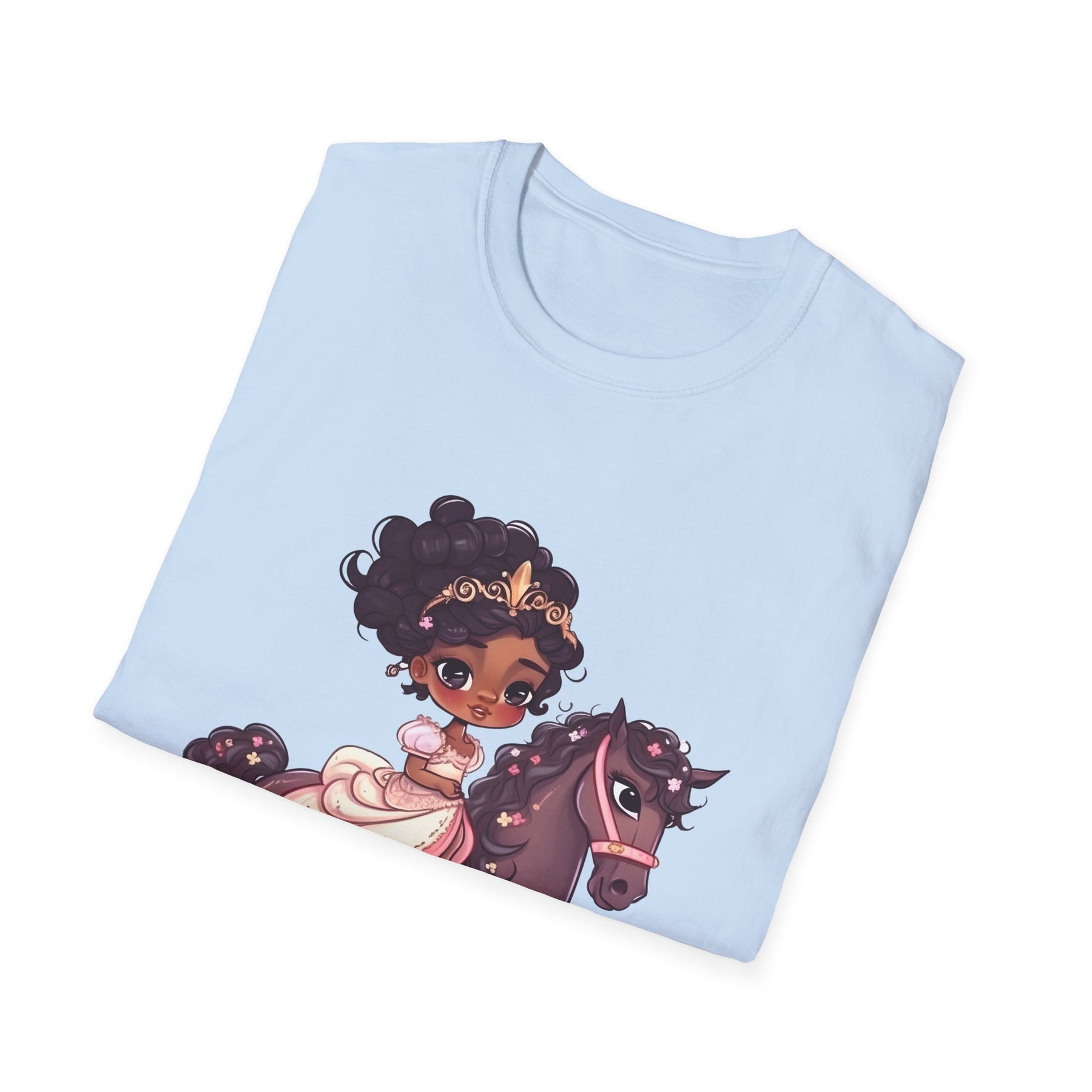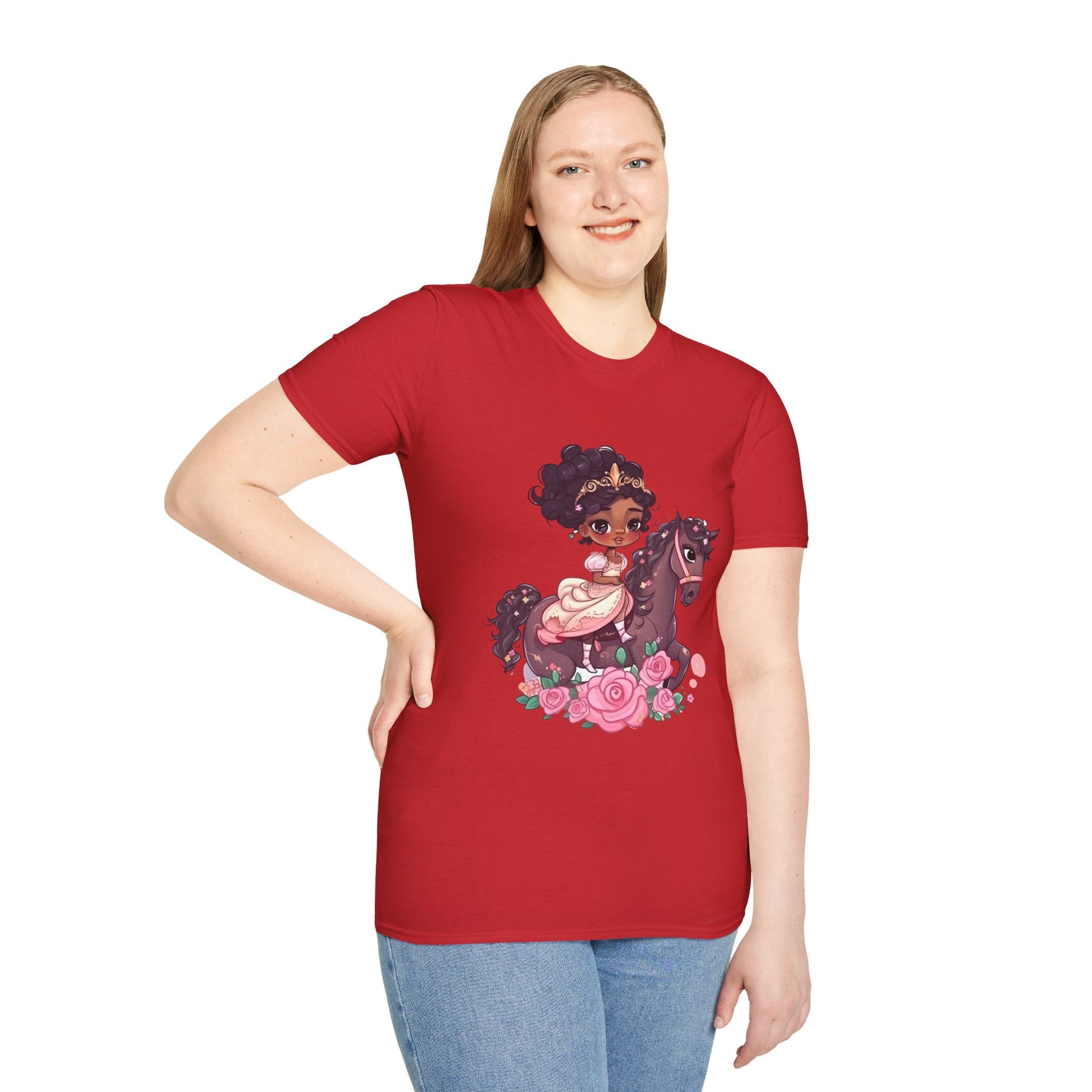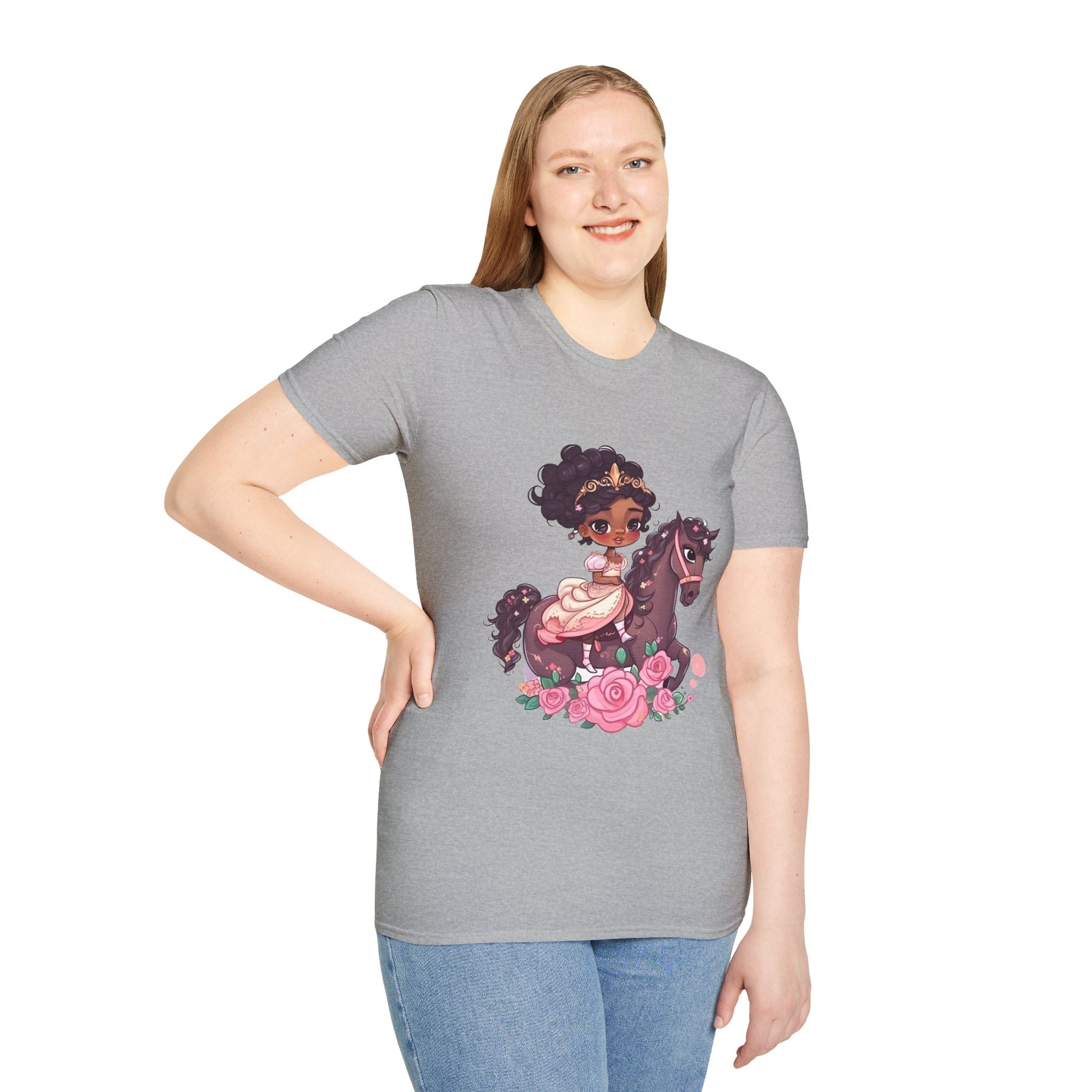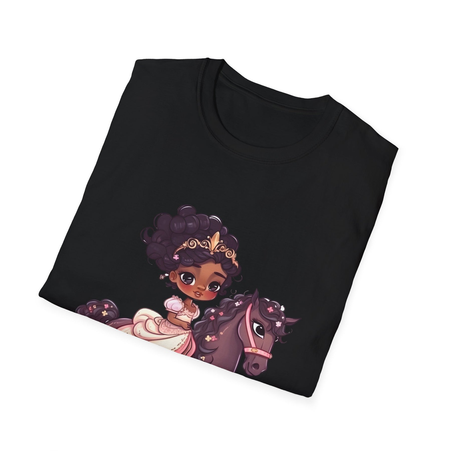Soft, gentle, and full of story—this lightweight tee carries a sweet illustrated scene: a spirited young girl with a crown, seated on a graceful dark horse surrounded by roses. The image reads like a moment from a bedtime tale—quiet bravery, soft family memories, and childhood wonder. Wear it to bring a little whimsy into everyday life, whether layered under a jacket for town walks or folded into a weekend outfit for strolling to a café. The smooth ring-spun cotton feels cool against the skin and keeps the print colors vivid, while the clean crew neckline and classic fit make it easy to move, play, and linger in comfortable style.