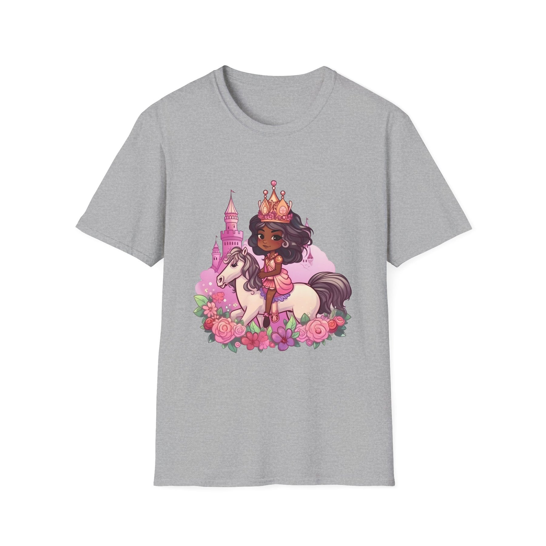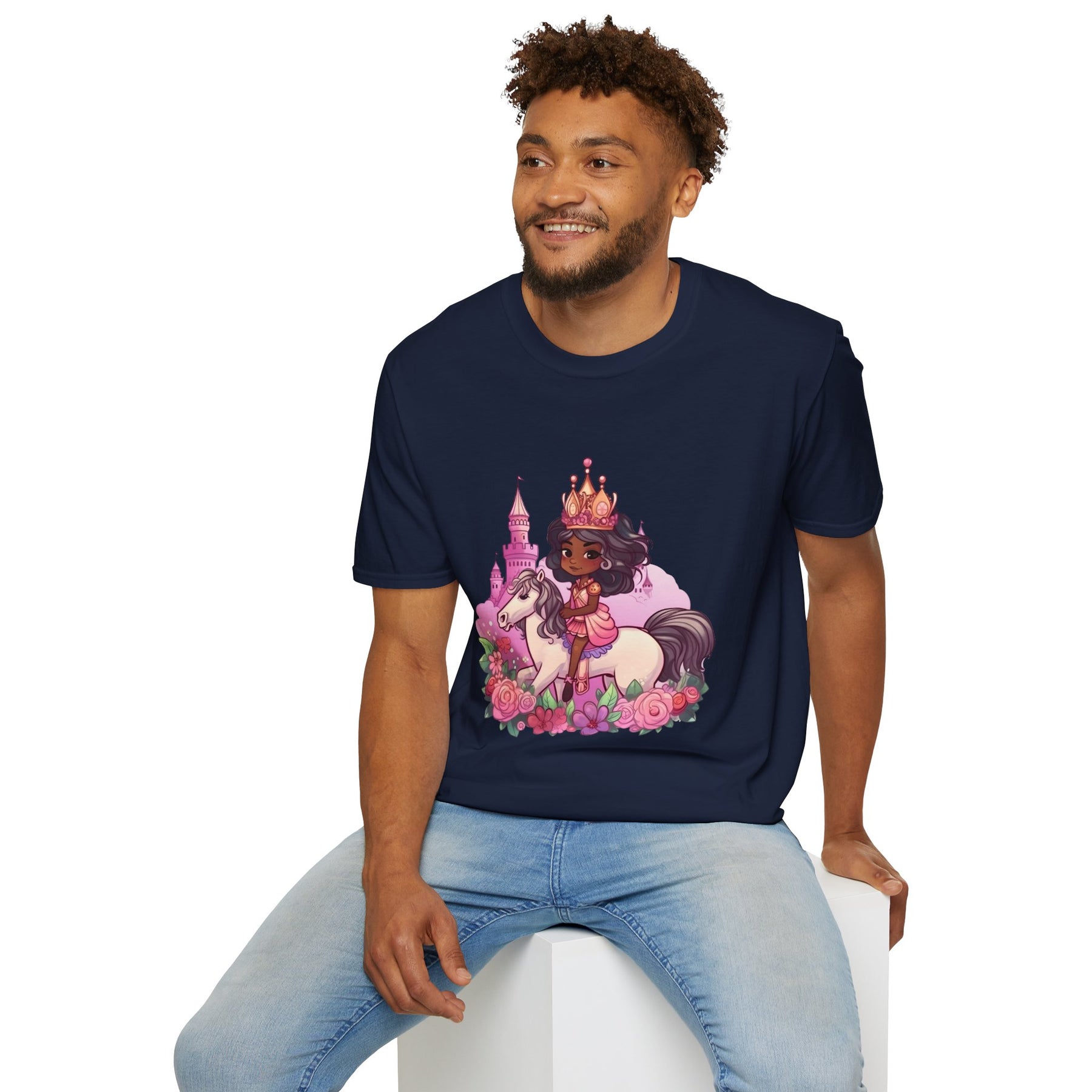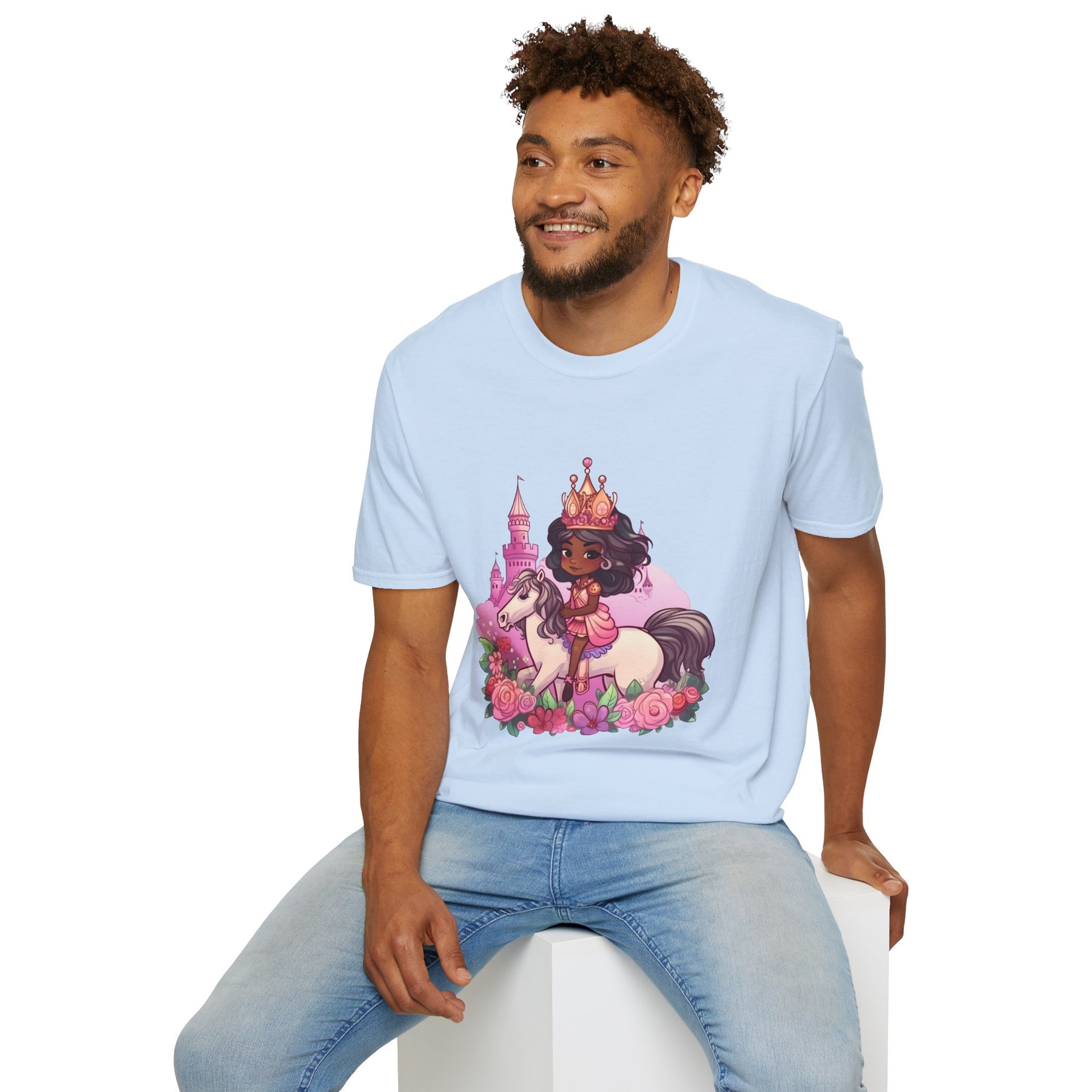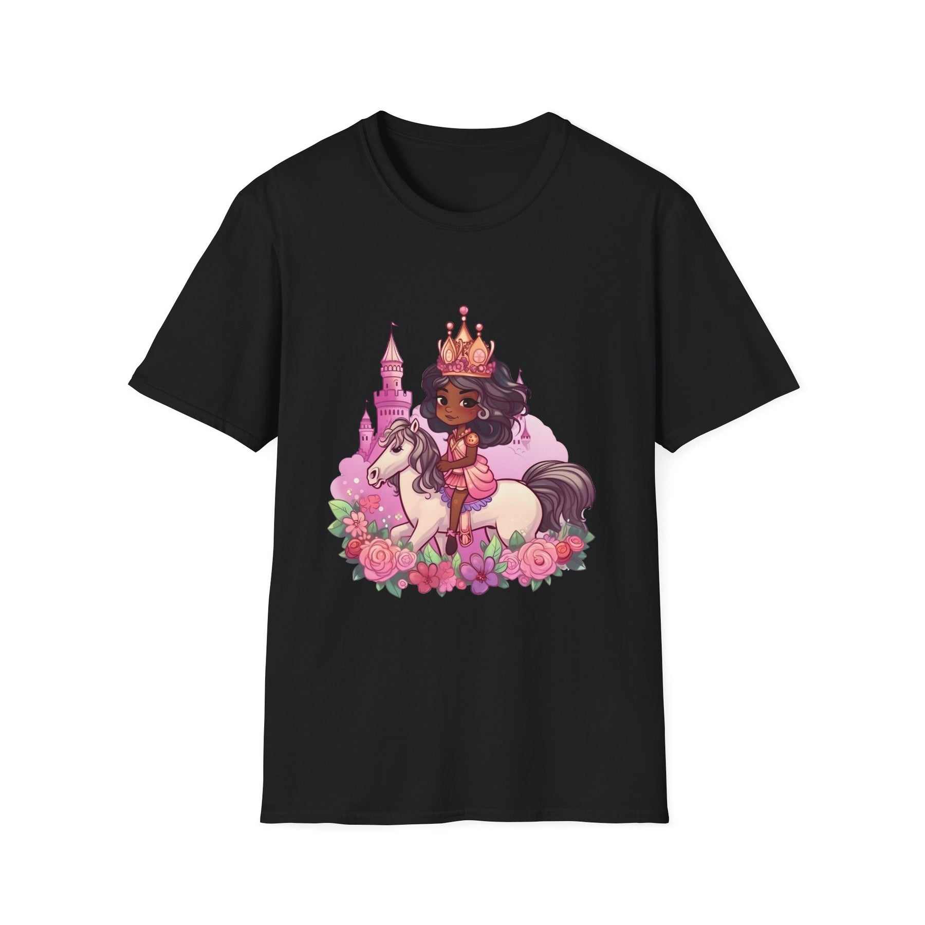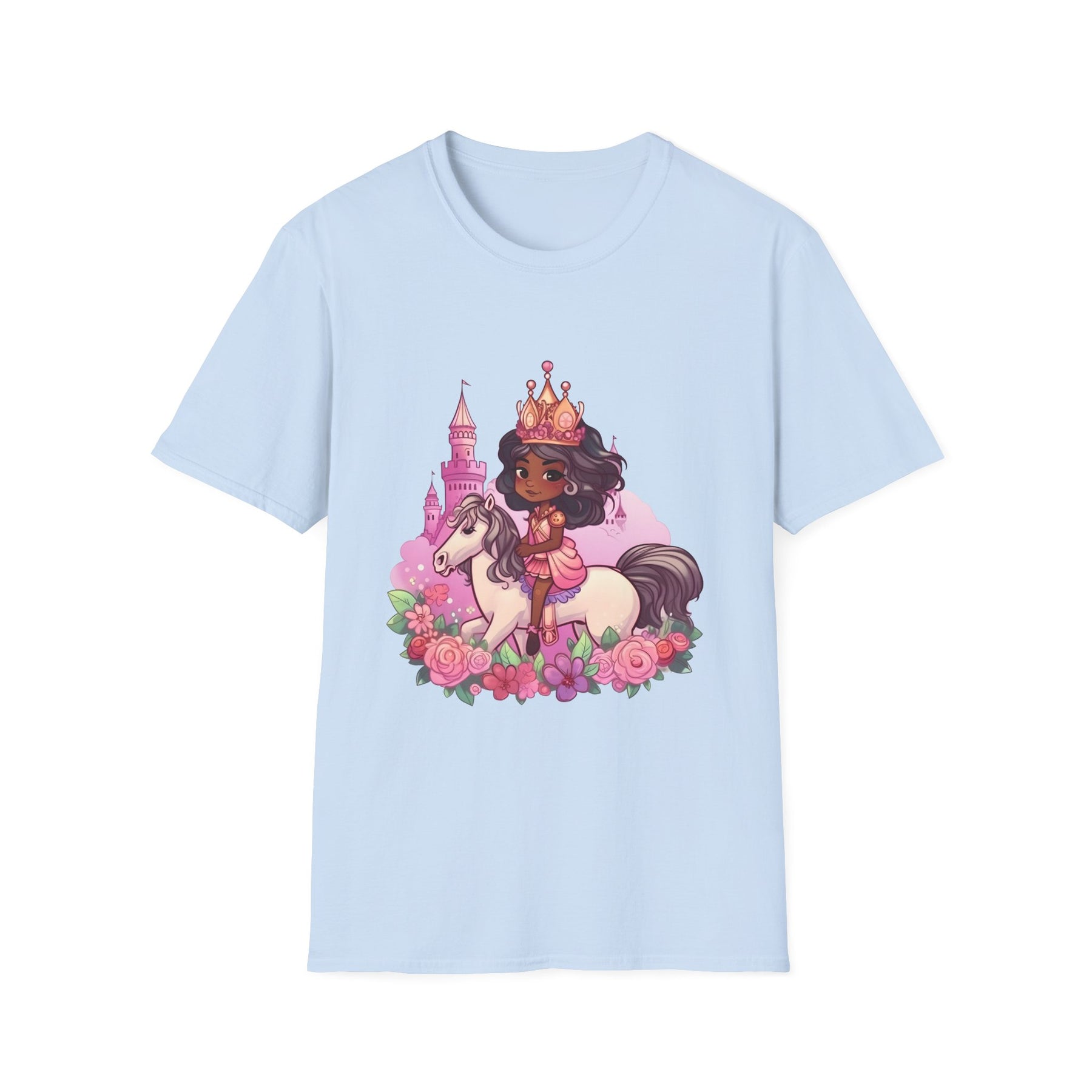 Soft, dreamy, and playful — this lightweight tee brings a little fairytale wherever it goes. The front features a warm-skinned princess, crowned and confident, seated on a gentle pony framed by pink roses and a distant castle. The fabric drapes smoothly, so the illustrated colors stay vibrant without feeling heavy. Wear it to bring a touch of storybook magic to everyday moments: school runs, playdates, or lazy weekend mornings. The crew neckline and classic fit keep the silhouette simple and age-appropriate, while the durable print and breathable cotton mean this shirt will be reached for again and again.