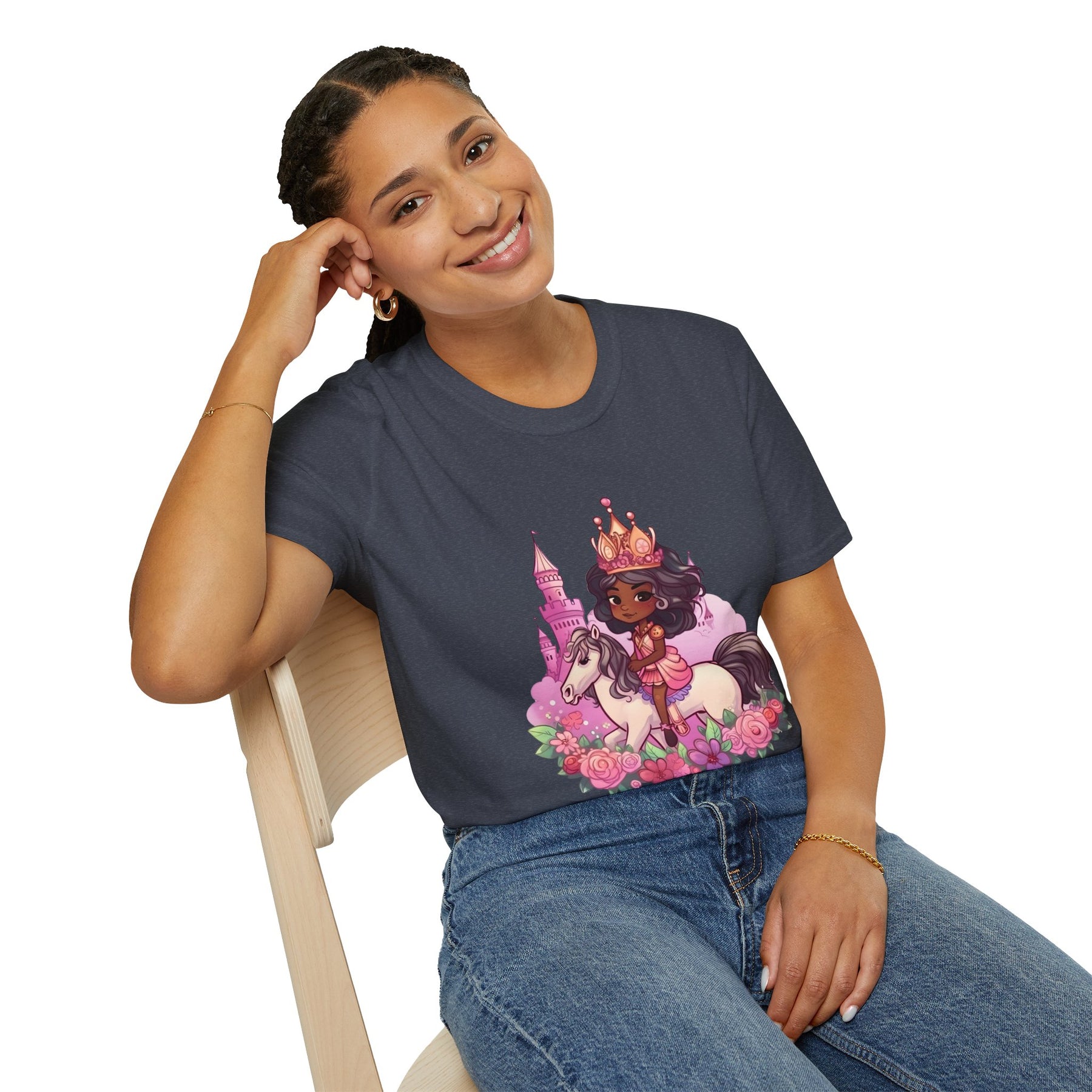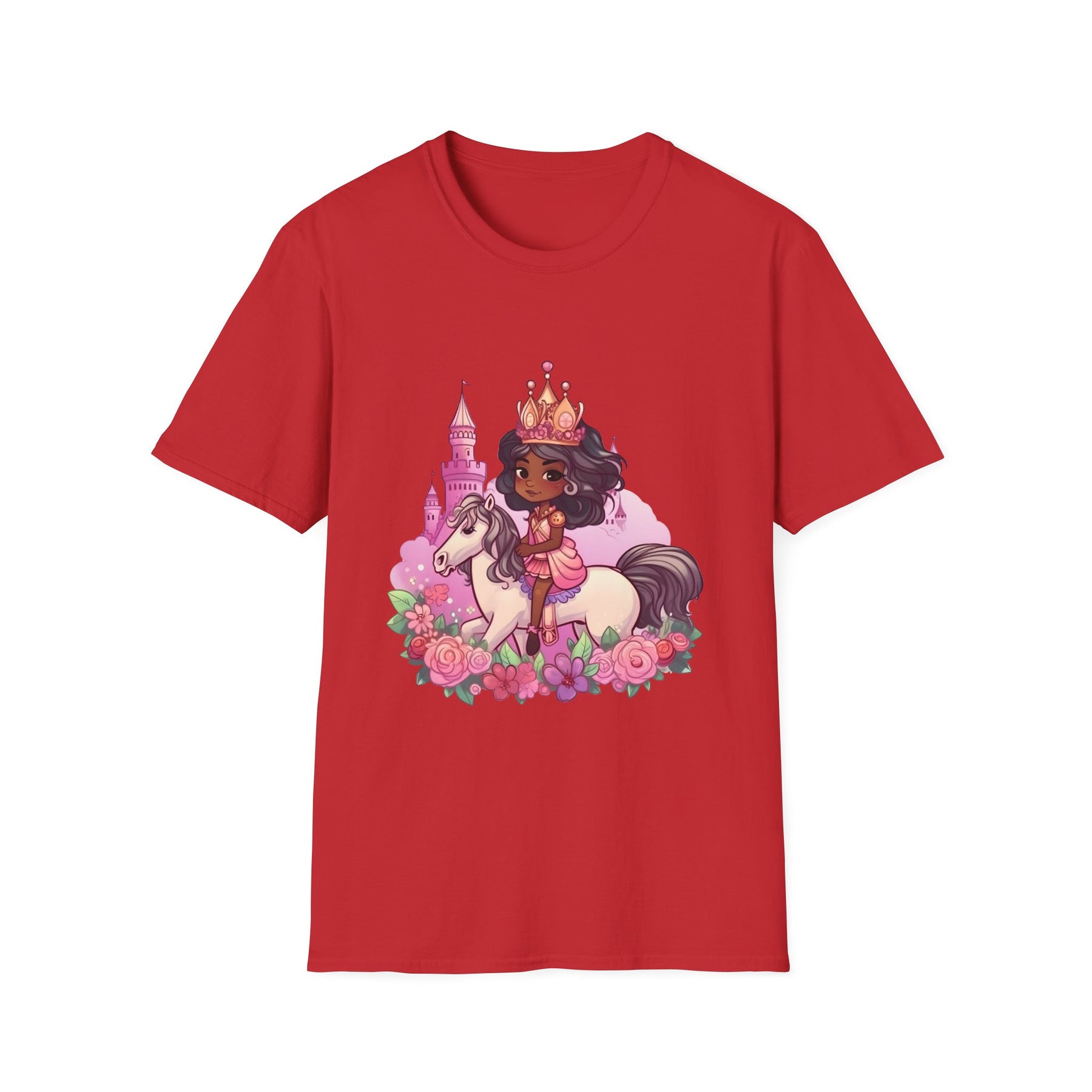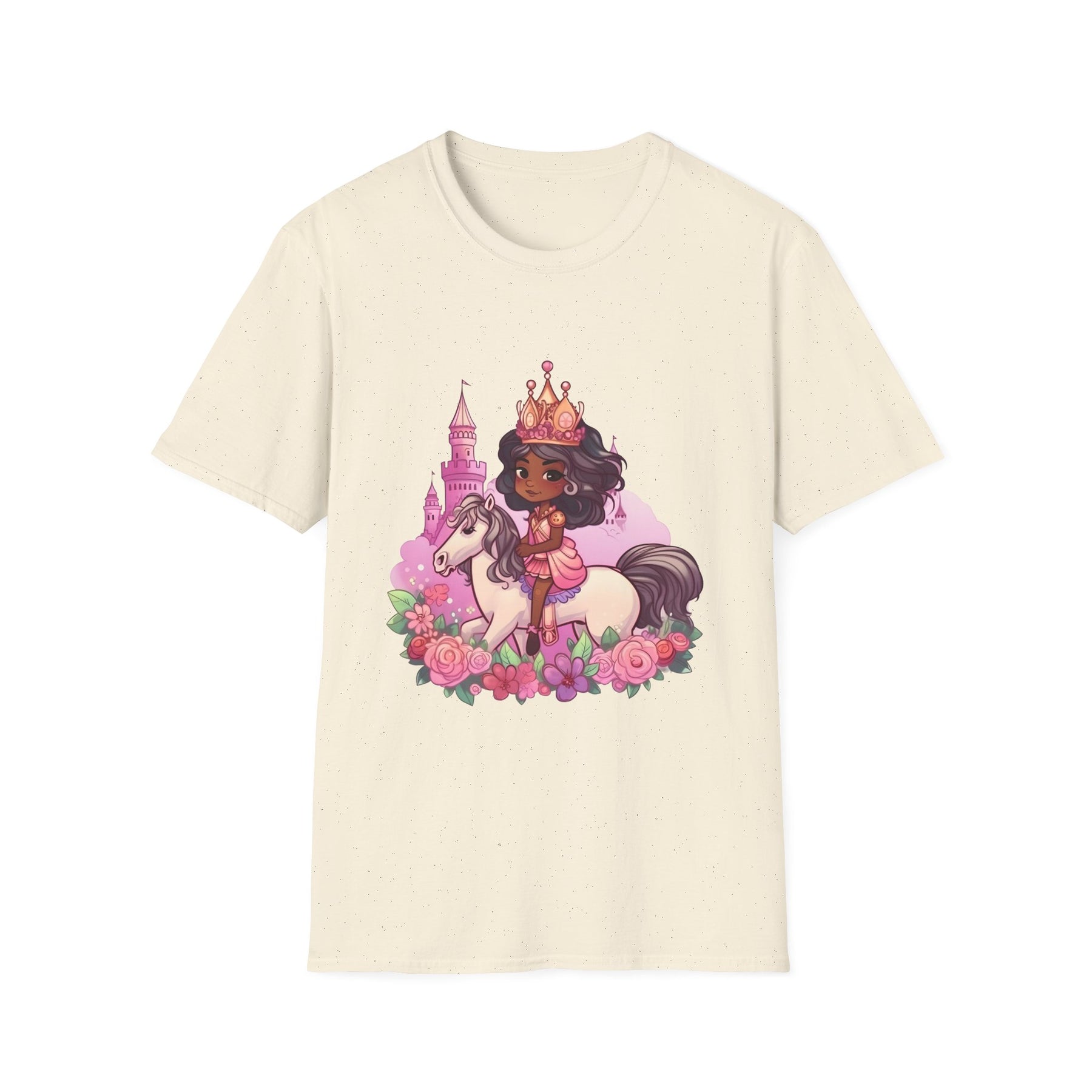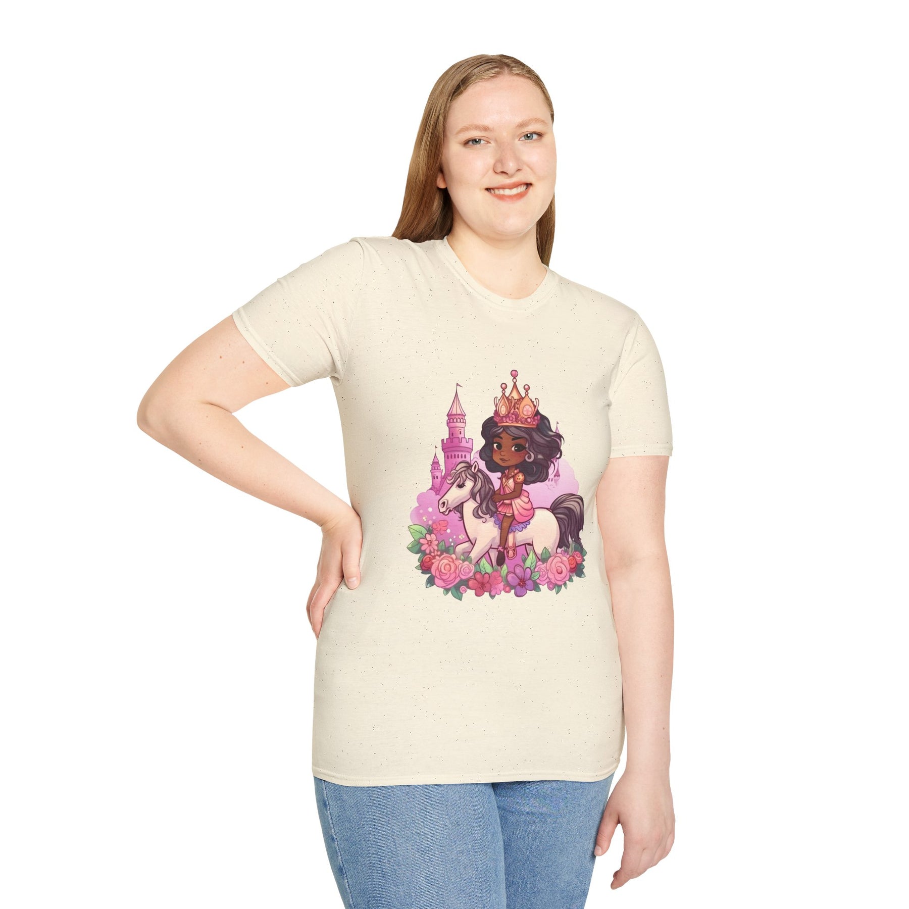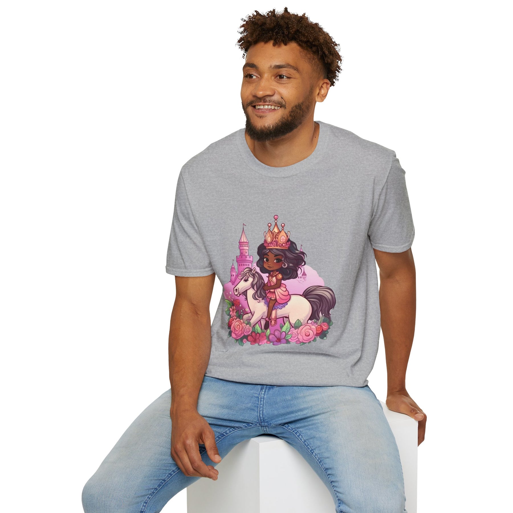 Soft, dreamy, and playful — this lightweight tee brings a little fairytale wherever it goes. The front features a warm-skinned princess, crowned and confident, seated on a gentle pony framed by pink roses and a distant castle. The fabric drapes smoothly, so the illustrated colors stay vibrant without feeling heavy. Wear it to bring a touch of storybook magic to everyday moments: school runs, playdates, or lazy weekend mornings. The crew neckline and classic fit keep the silhouette simple and age-appropriate, while the durable print and breathable cotton mean this shirt will be reached for again and again.