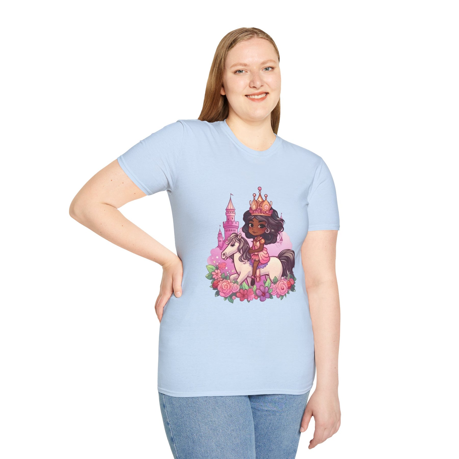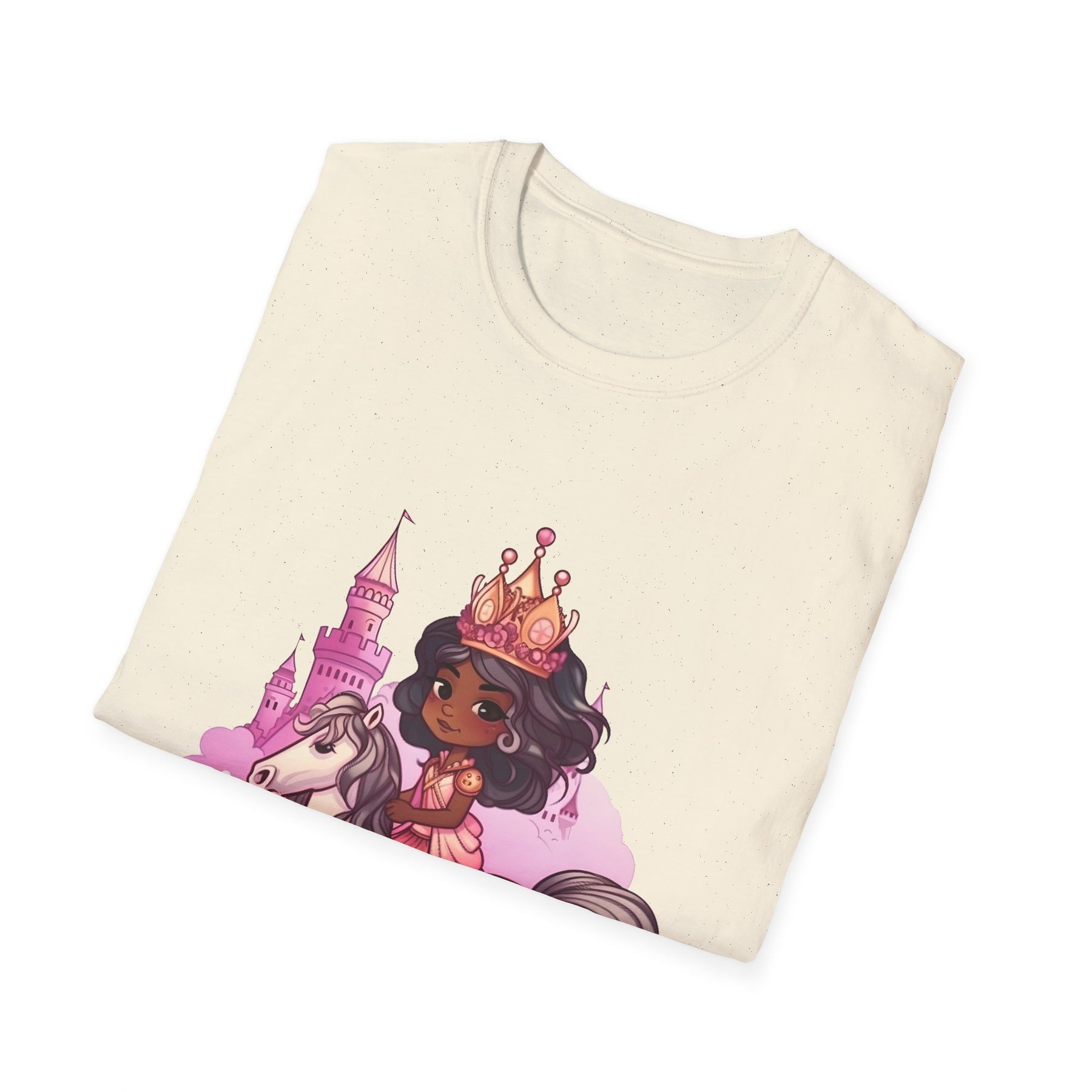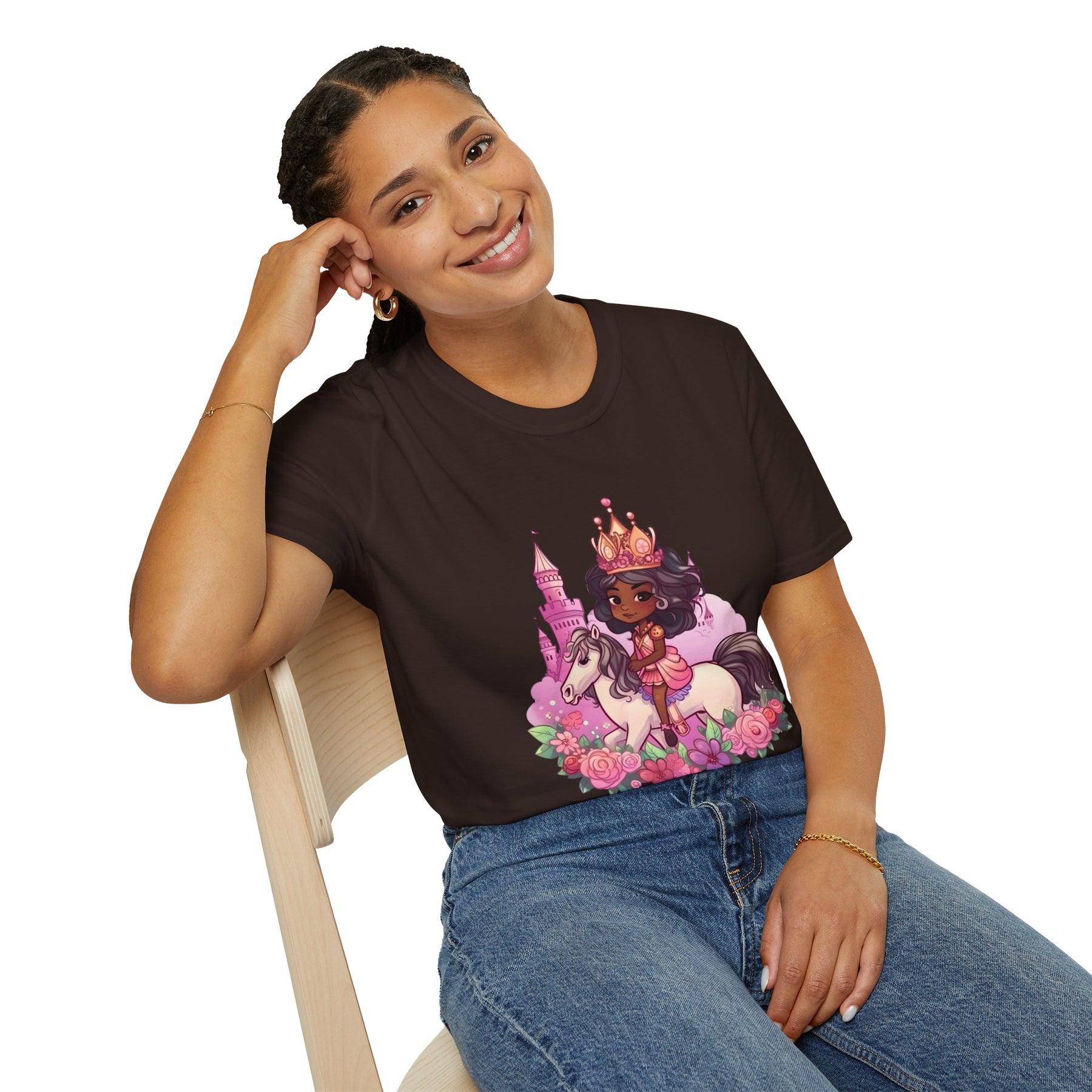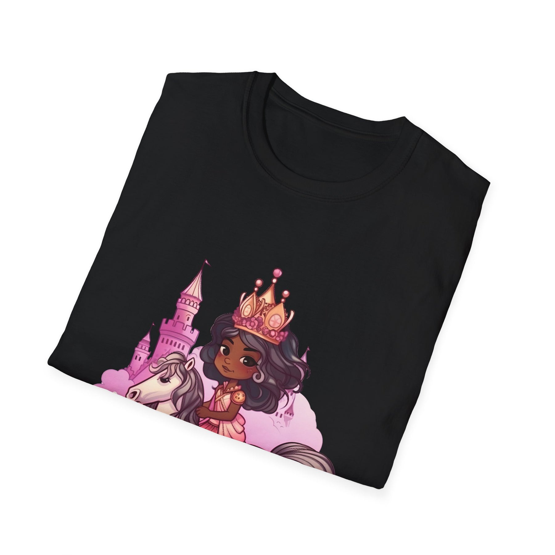 Soft, dreamy, and playful — this lightweight tee brings a little fairytale wherever it goes. The front features a warm-skinned princess, crowned and confident, seated on a gentle pony framed by pink roses and a distant castle. The fabric drapes smoothly, so the illustrated colors stay vibrant without feeling heavy. Wear it to bring a touch of storybook magic to everyday moments: school runs, playdates, or lazy weekend mornings. The crew neckline and classic fit keep the silhouette simple and age-appropriate, while the durable print and breathable cotton mean this shirt will be reached for again and again.