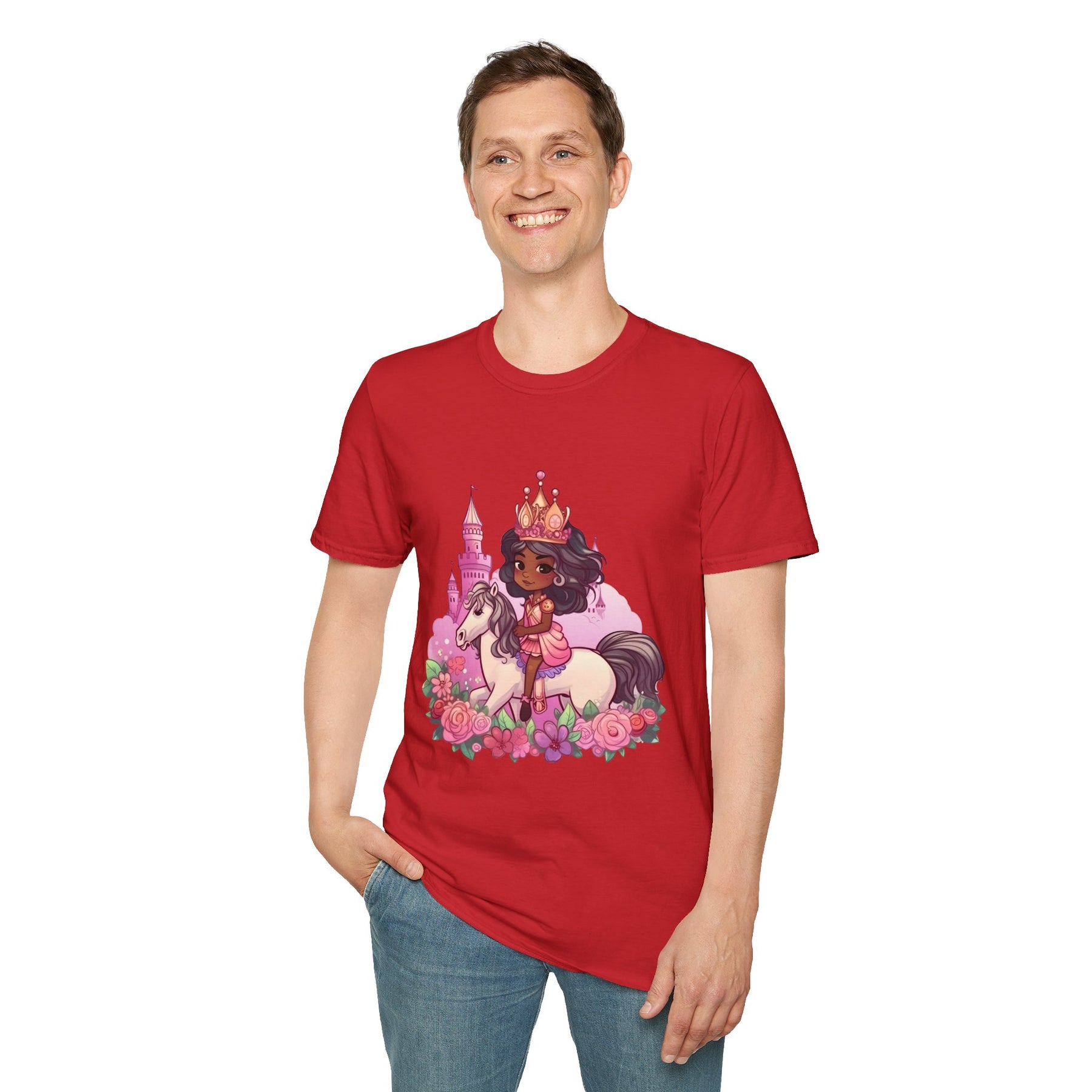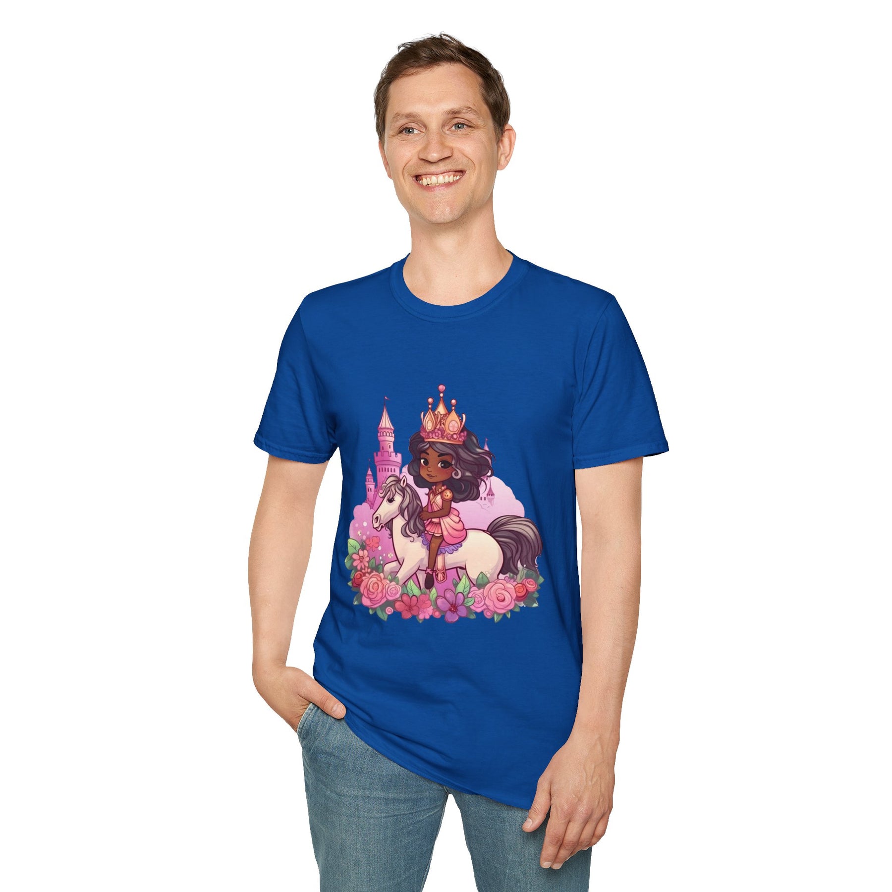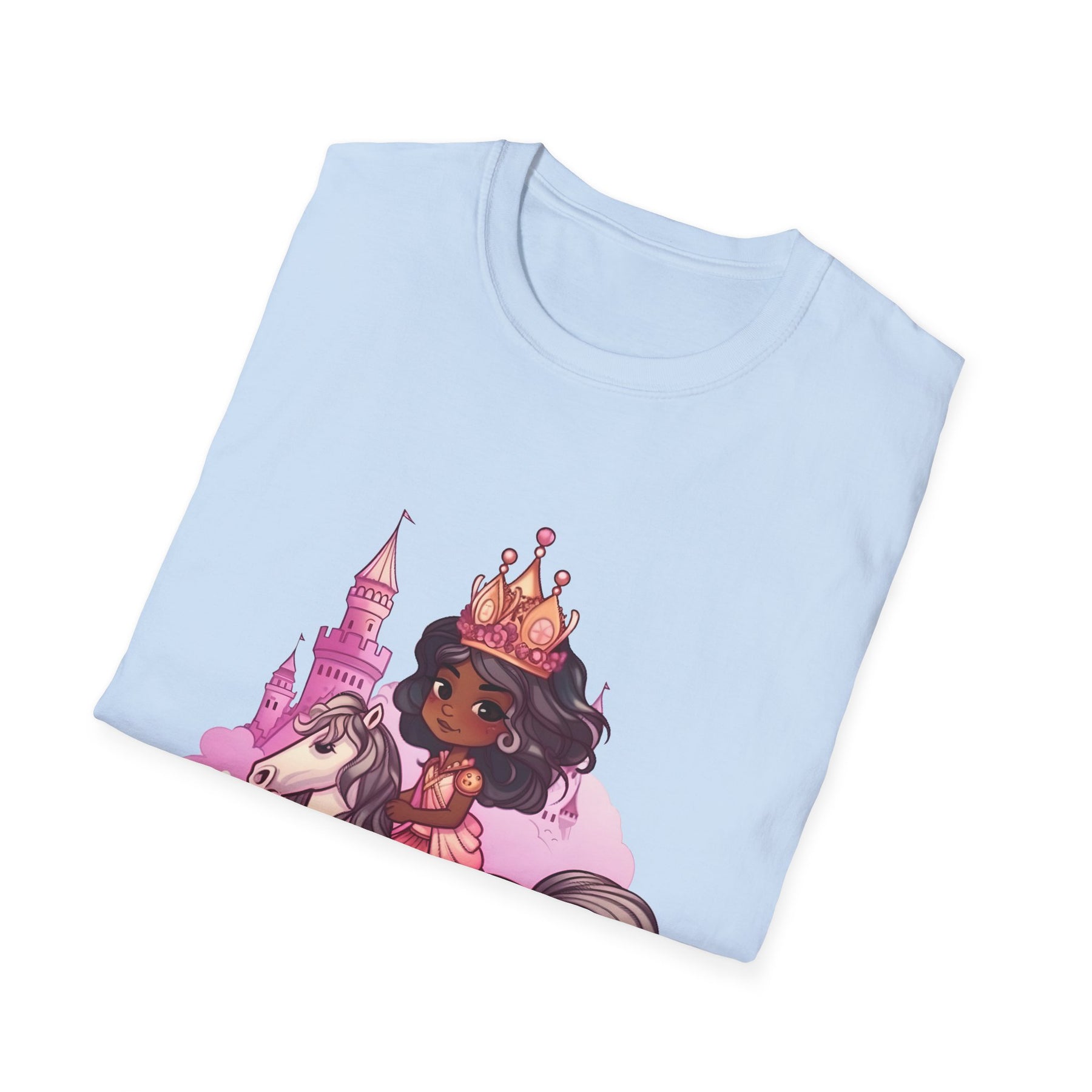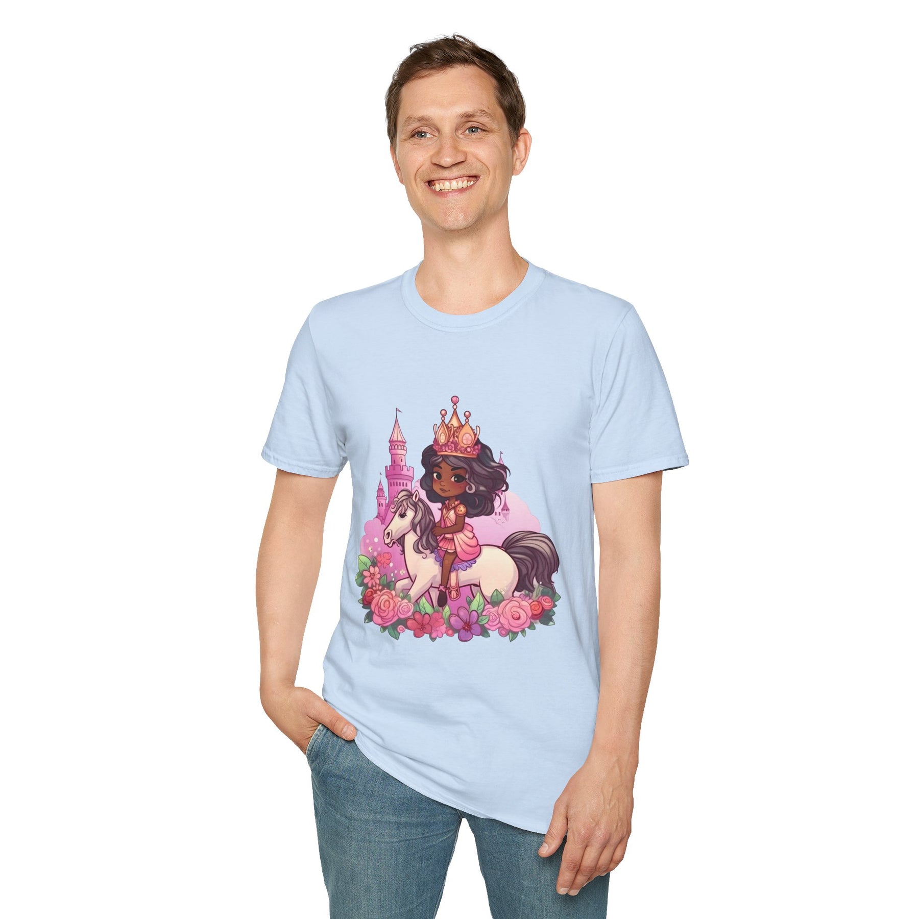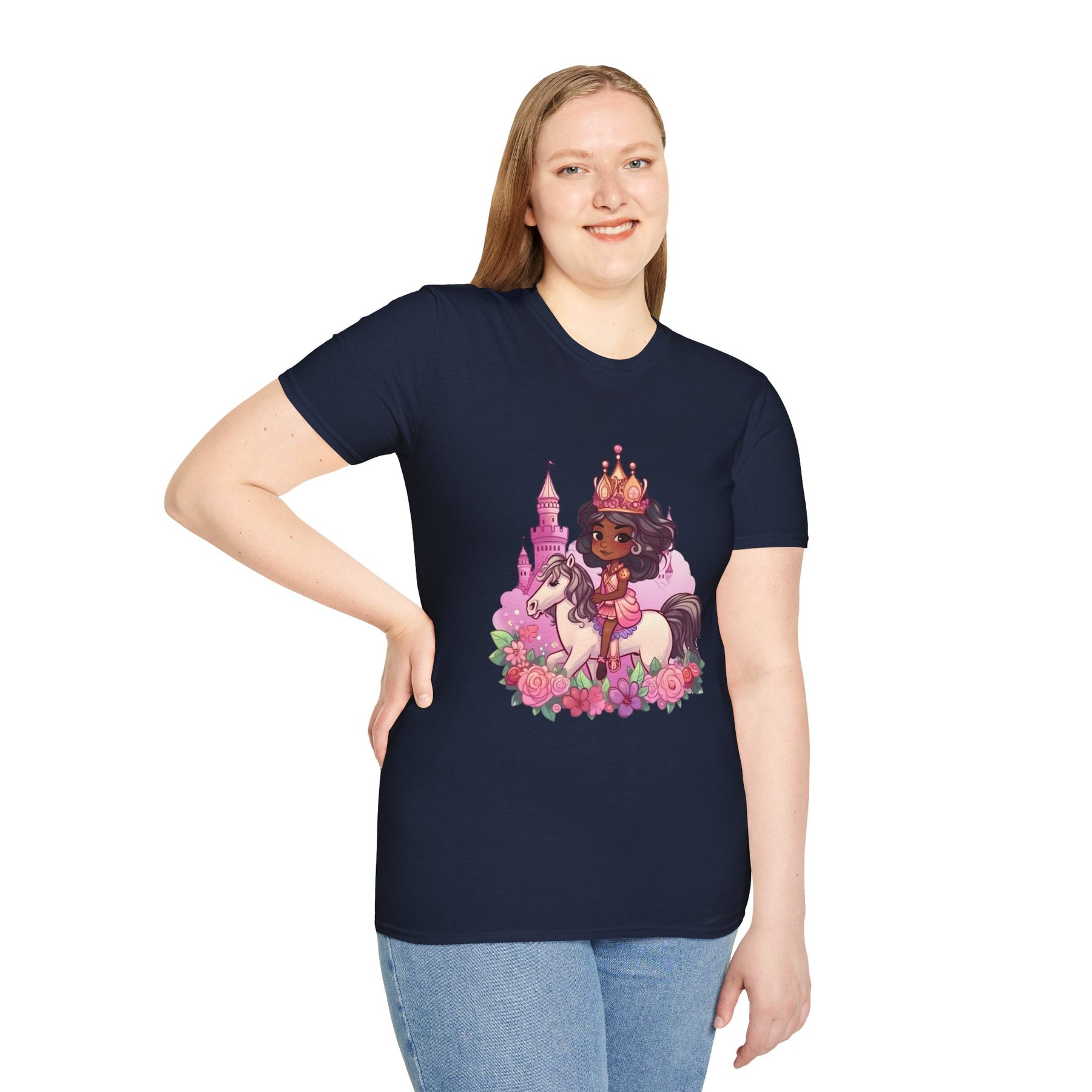 Soft, dreamy, and playful — this lightweight tee brings a little fairytale wherever it goes. The front features a warm-skinned princess, crowned and confident, seated on a gentle pony framed by pink roses and a distant castle. The fabric drapes smoothly, so the illustrated colors stay vibrant without feeling heavy. Wear it to bring a touch of storybook magic to everyday moments: school runs, playdates, or lazy weekend mornings. The crew neckline and classic fit keep the silhouette simple and age-appropriate, while the durable print and breathable cotton mean this shirt will be reached for again and again.