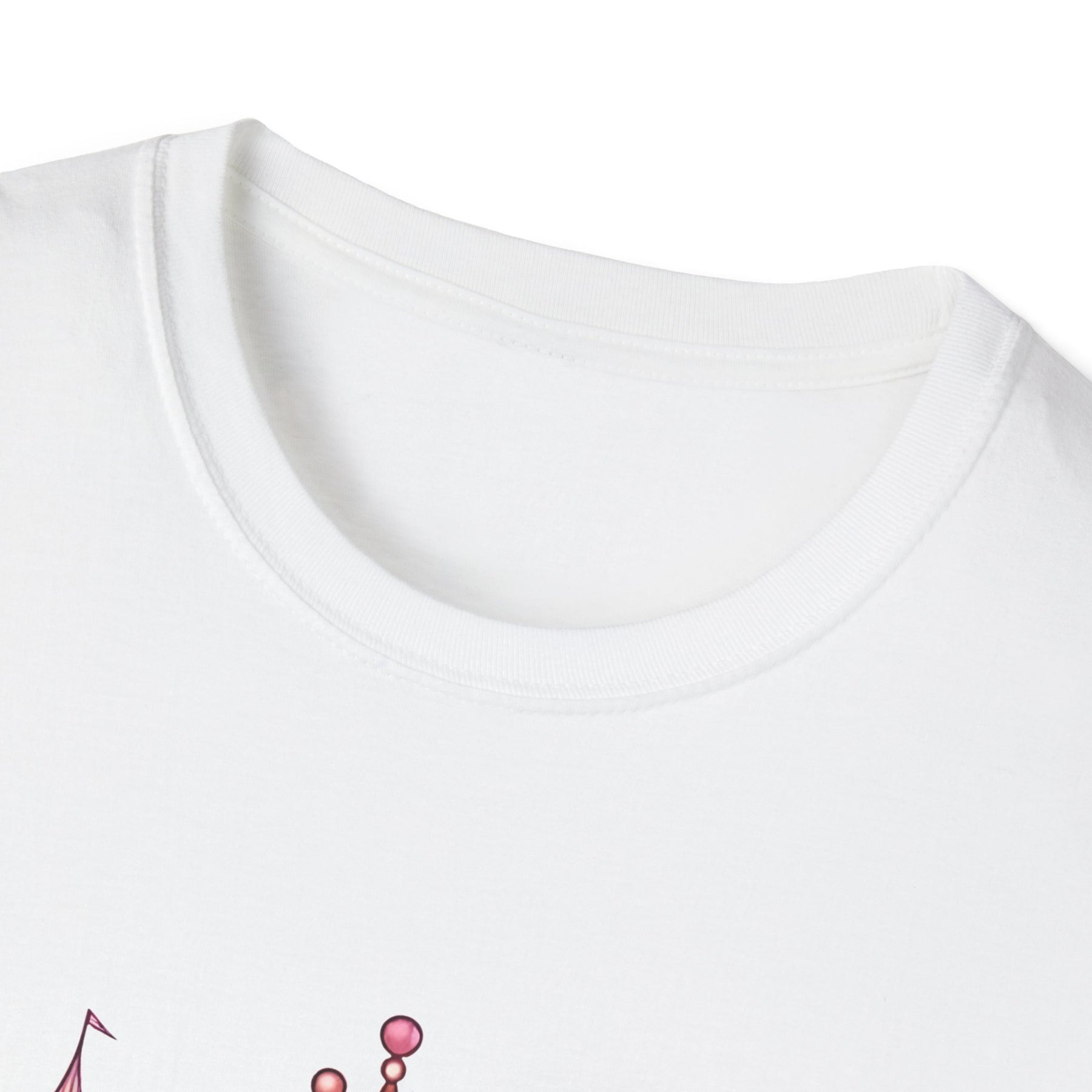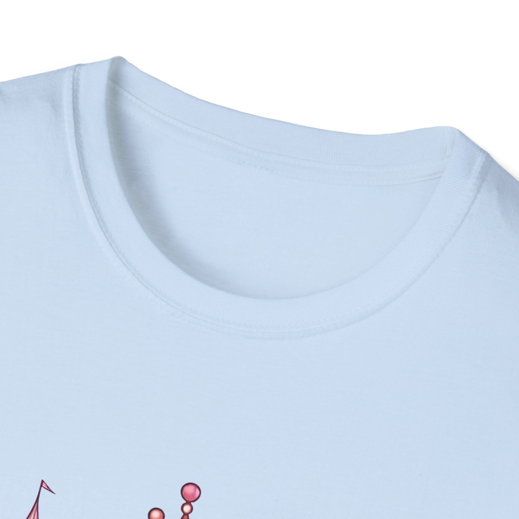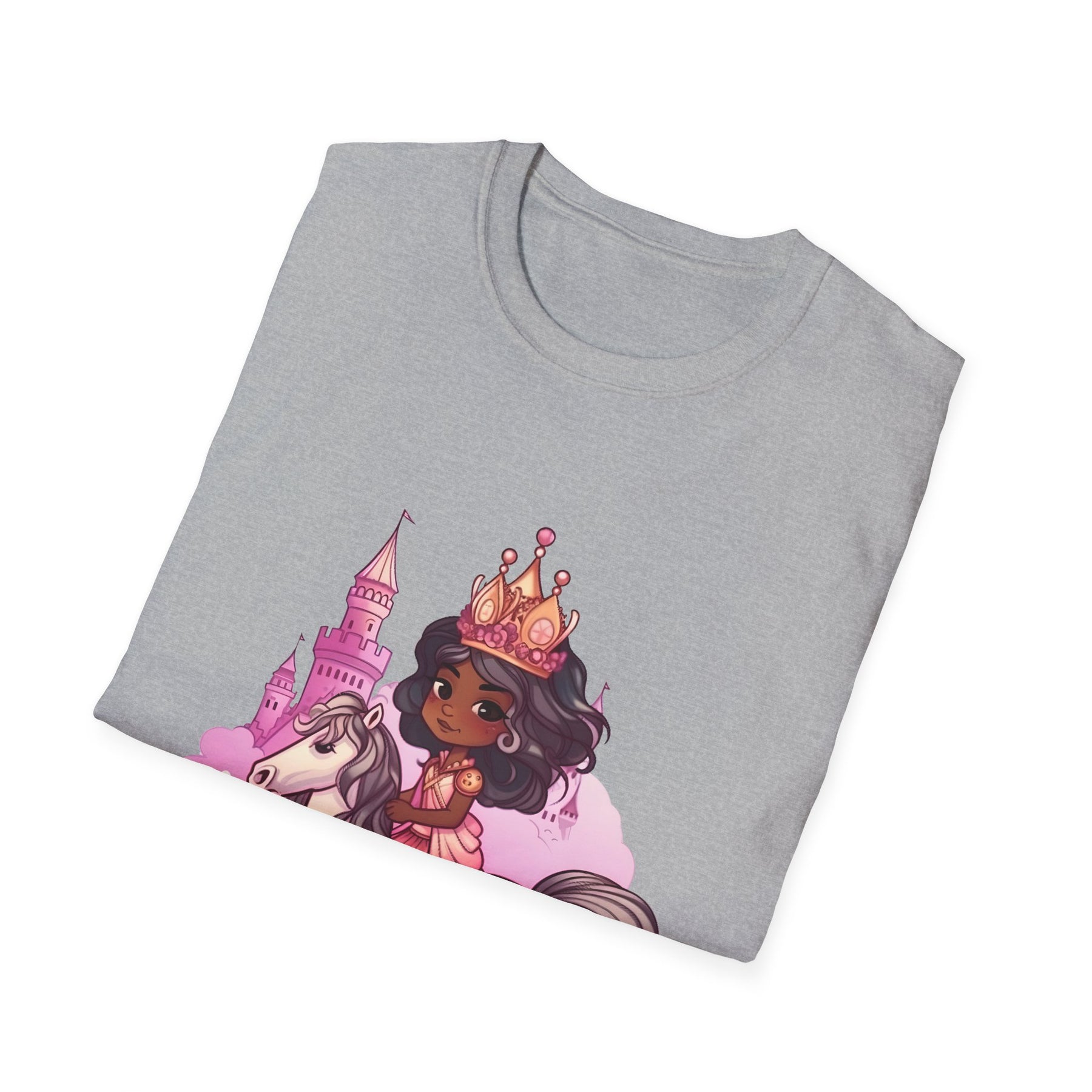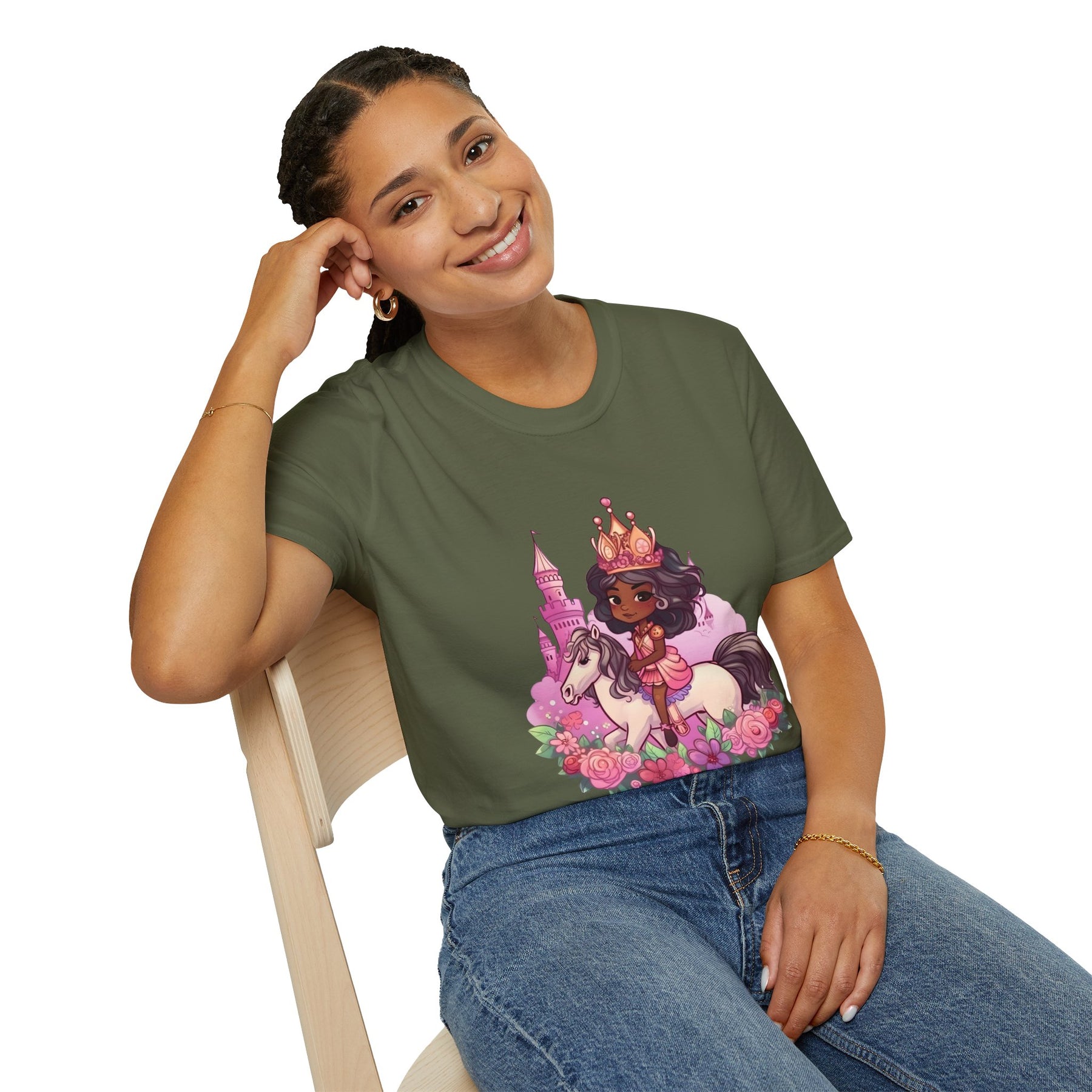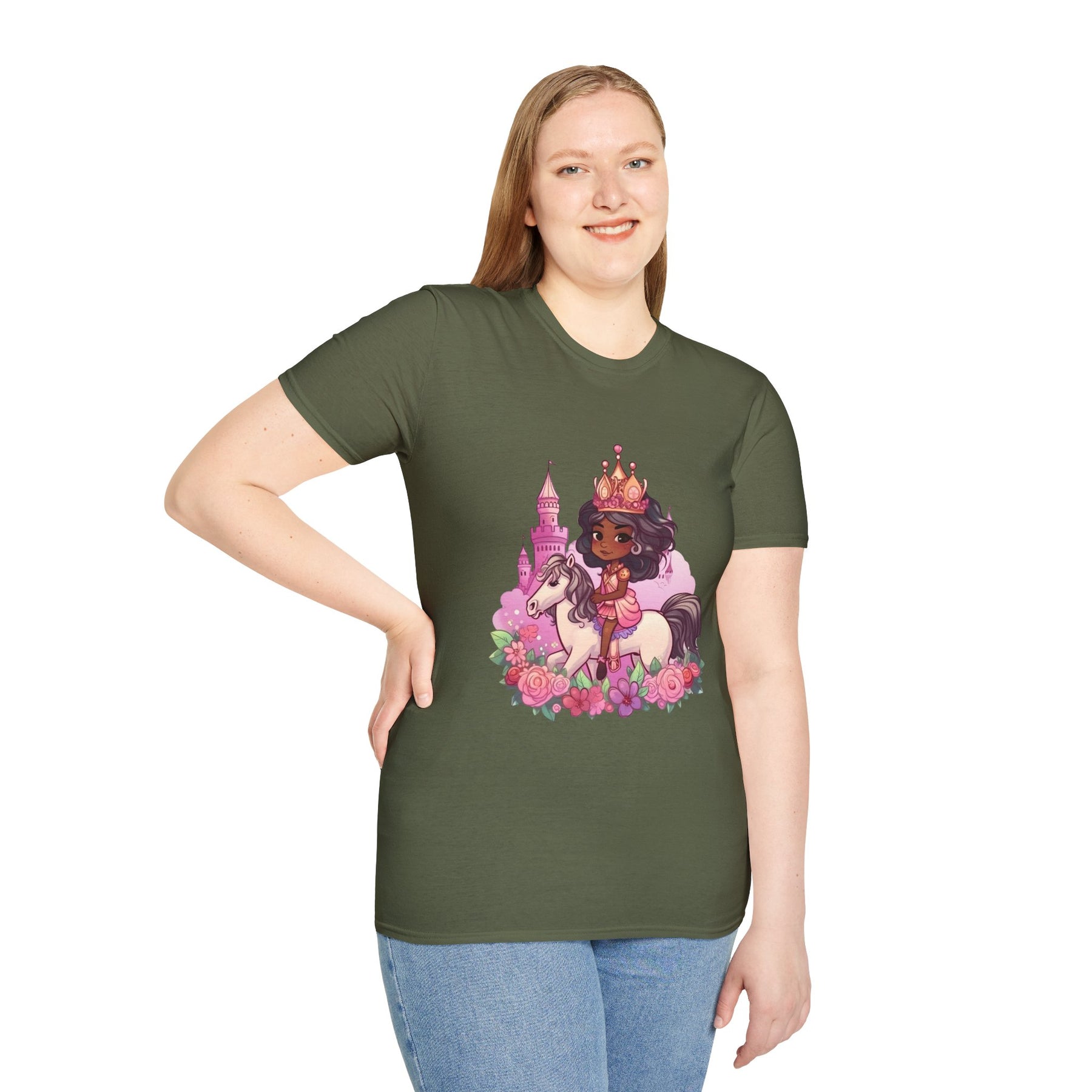 Soft, dreamy, and playful — this lightweight tee brings a little fairytale wherever it goes. The front features a warm-skinned princess, crowned and confident, seated on a gentle pony framed by pink roses and a distant castle. The fabric drapes smoothly, so the illustrated colors stay vibrant without feeling heavy. Wear it to bring a touch of storybook magic to everyday moments: school runs, playdates, or lazy weekend mornings. The crew neckline and classic fit keep the silhouette simple and age-appropriate, while the durable print and breathable cotton mean this shirt will be reached for again and again.