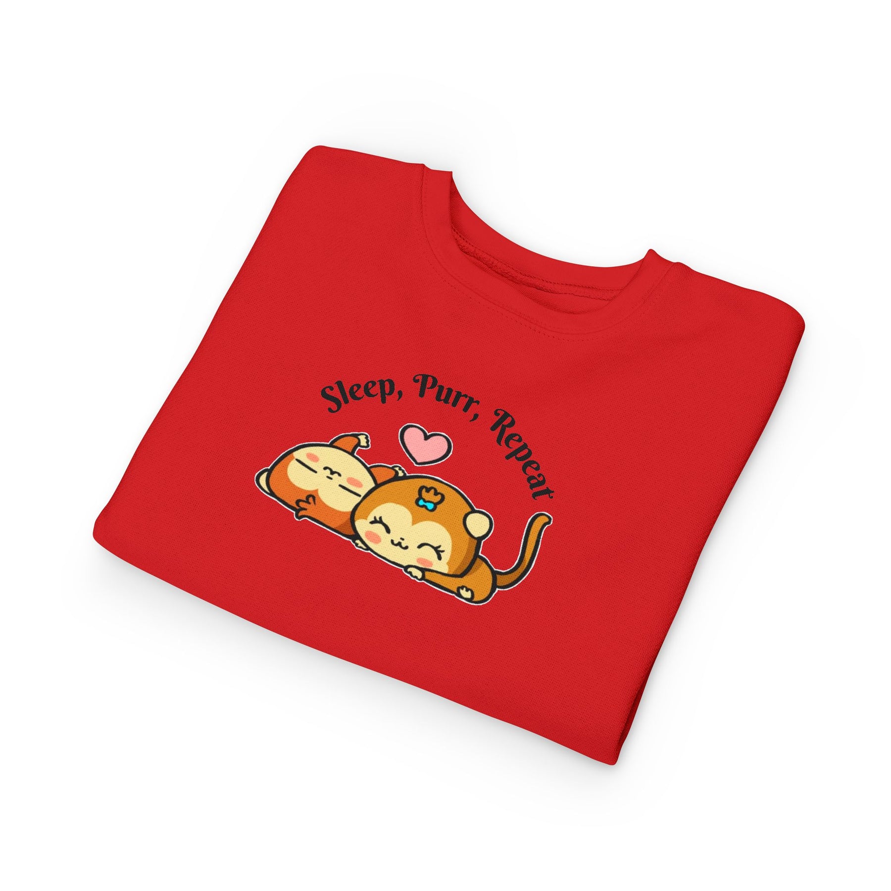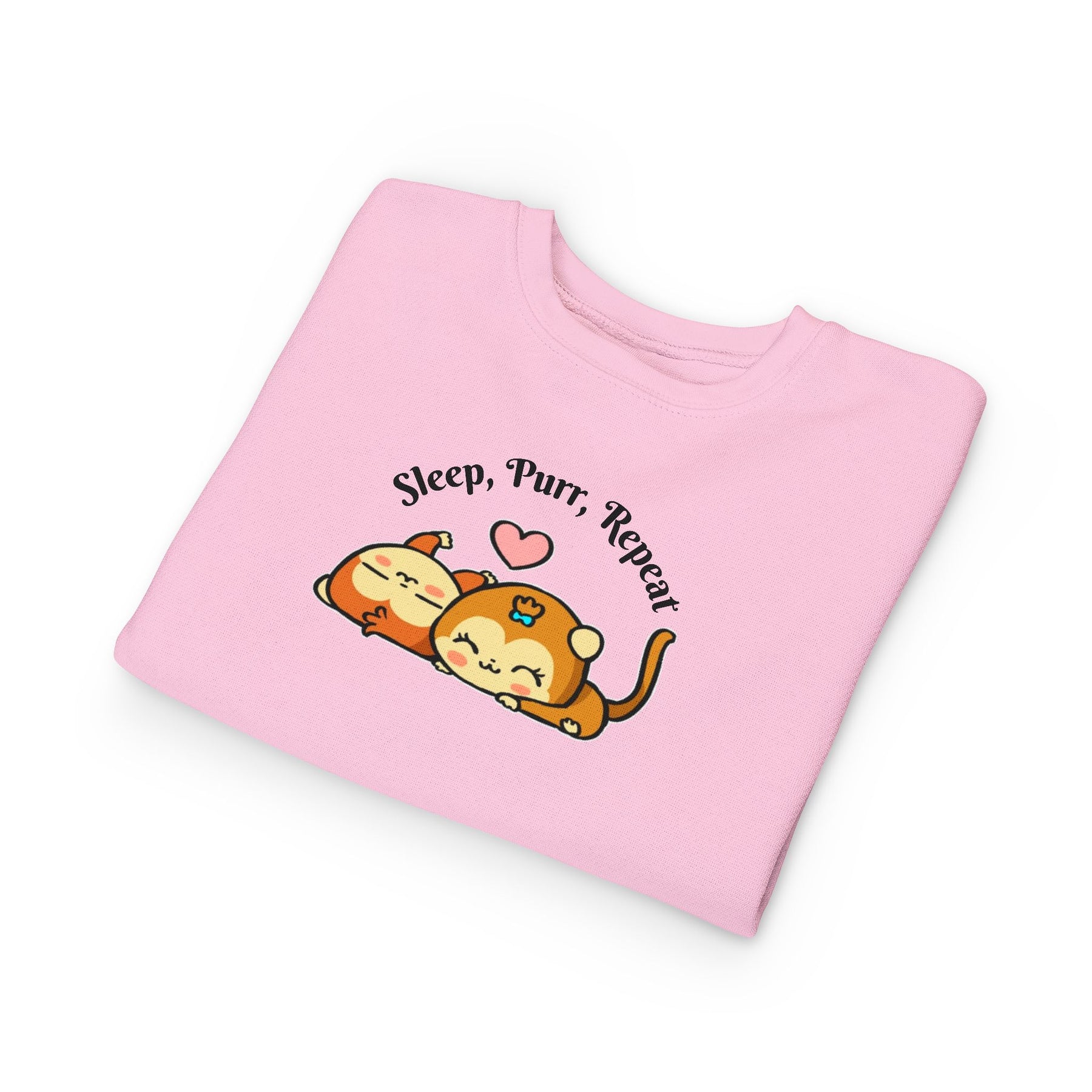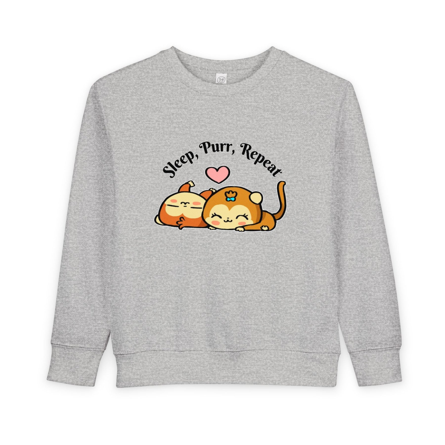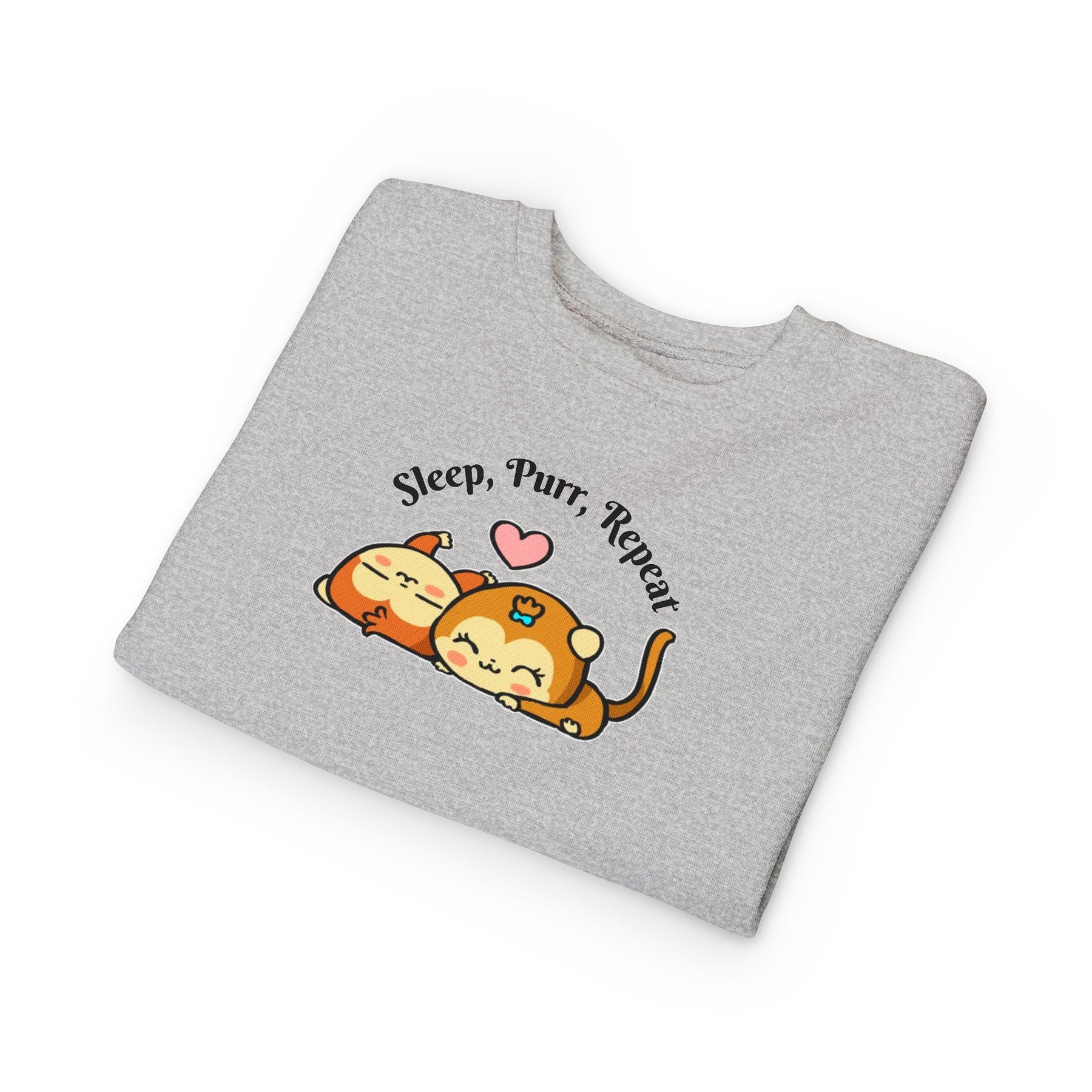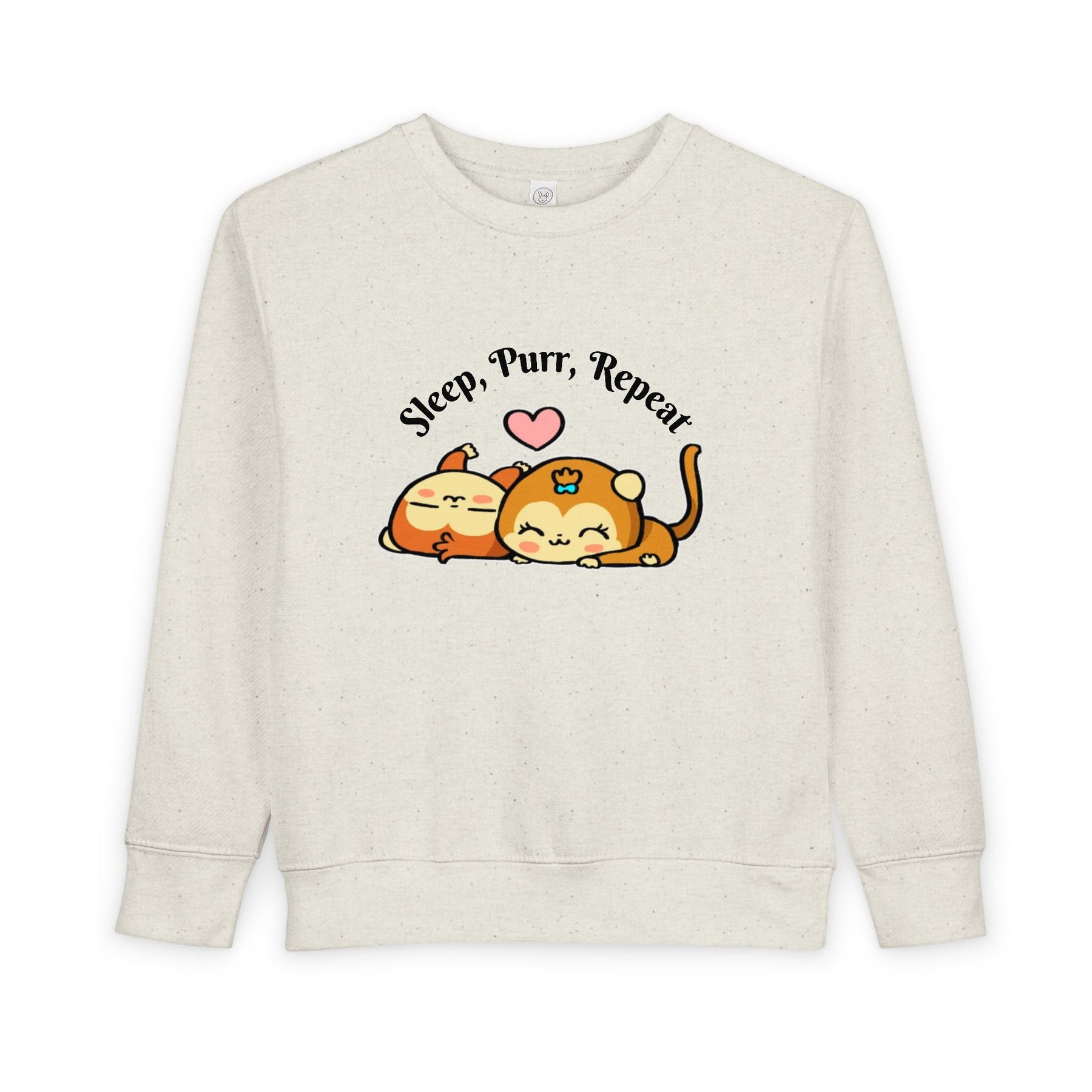 This soft toddler sweatshirt brings calm and cuddles into little days. Designed with a gentle speckled heather base and an adorable illustration of two snoozing cats beneath the words “Sleep, Purr, Repeat,” it feels like a warm hug for sleepy playtimes and nap routines. The medium-weight fabric holds its cozy shape while breathable cotton keeps active toddlers comfortable. Neat coverstitching and ribbed cuffs give a tidy, durable finish that stands up to hugs, spills, and lots of washer cycles. It layers easily over pajamas or pairs with play pants for a sleepy morning or a relaxed afternoon at home.